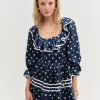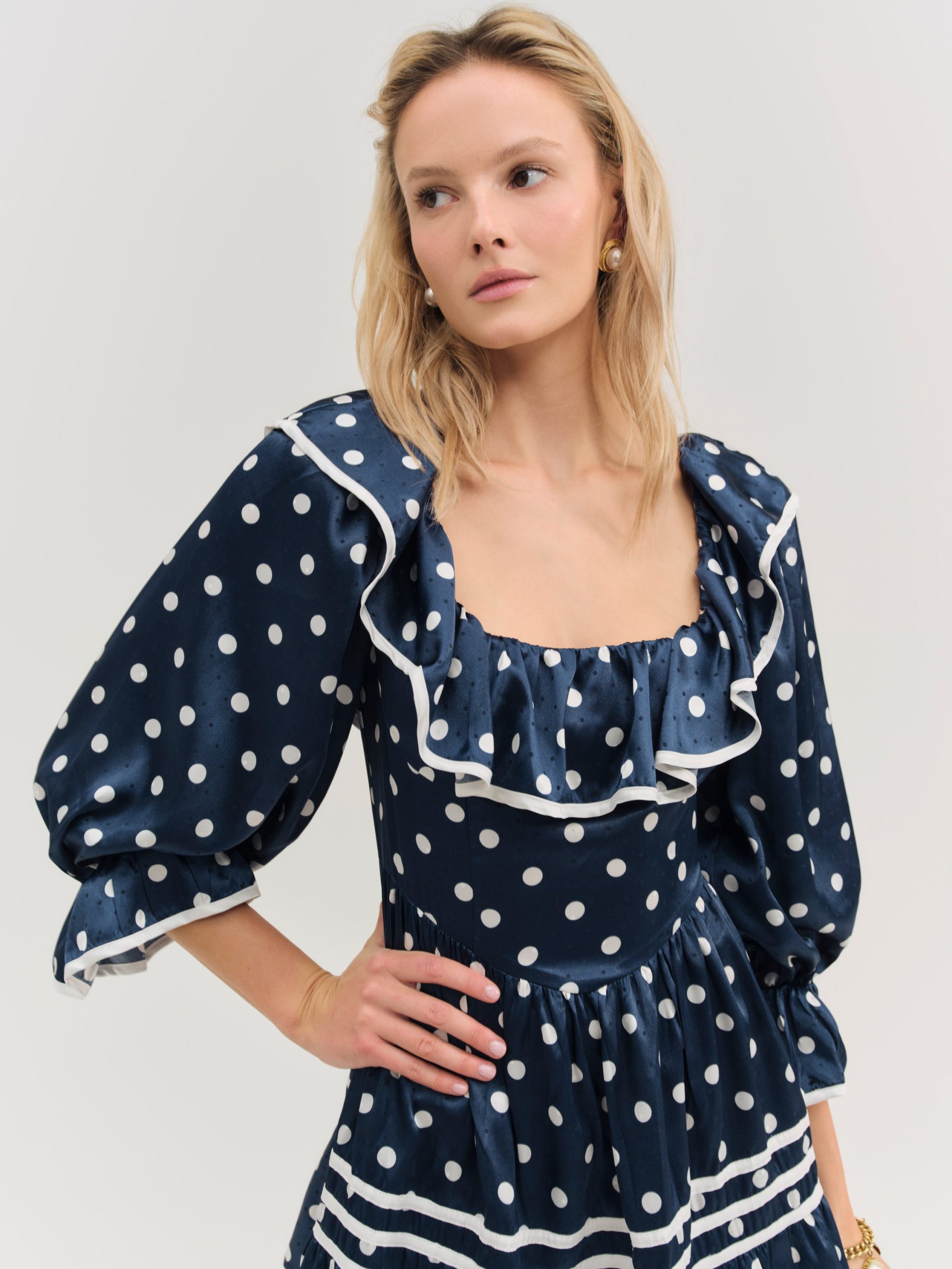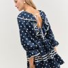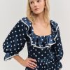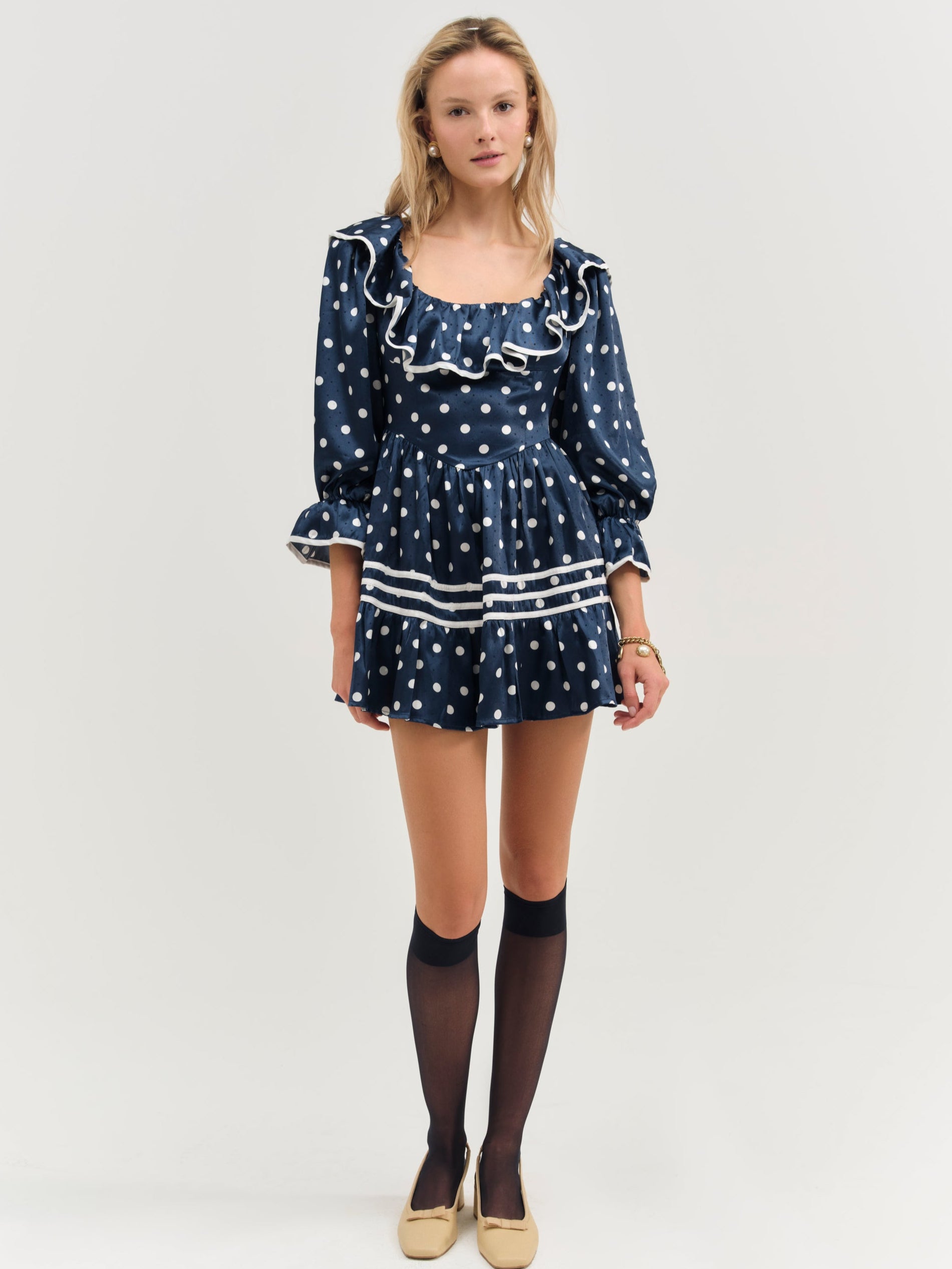 Discover our romantic reinterpretation of maritime charm with the Seaside polka dot mini dress—a navy mini dress that spotlights long puff sleeves, a ruffled neckline, and a gathered skirt with contrast piping.