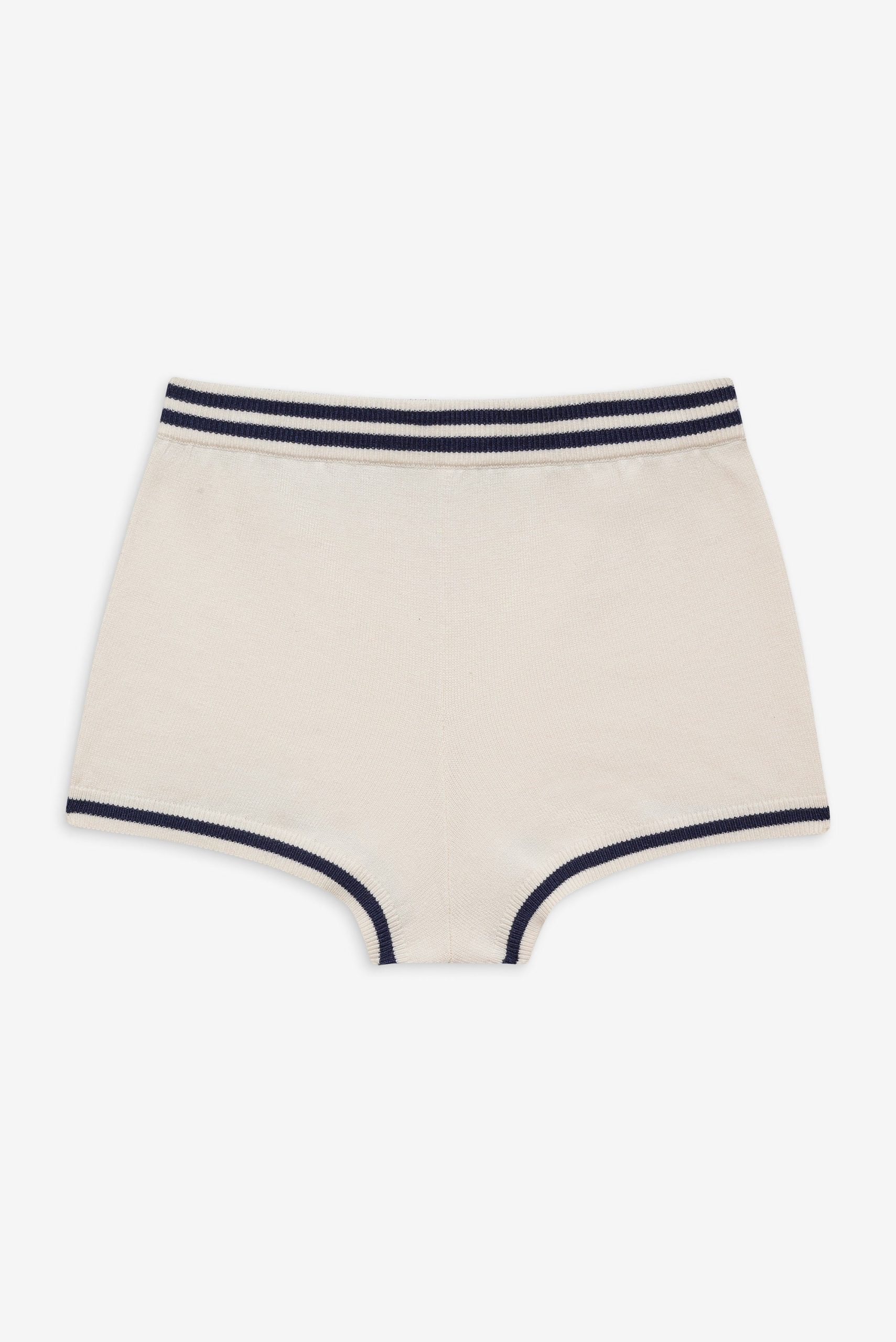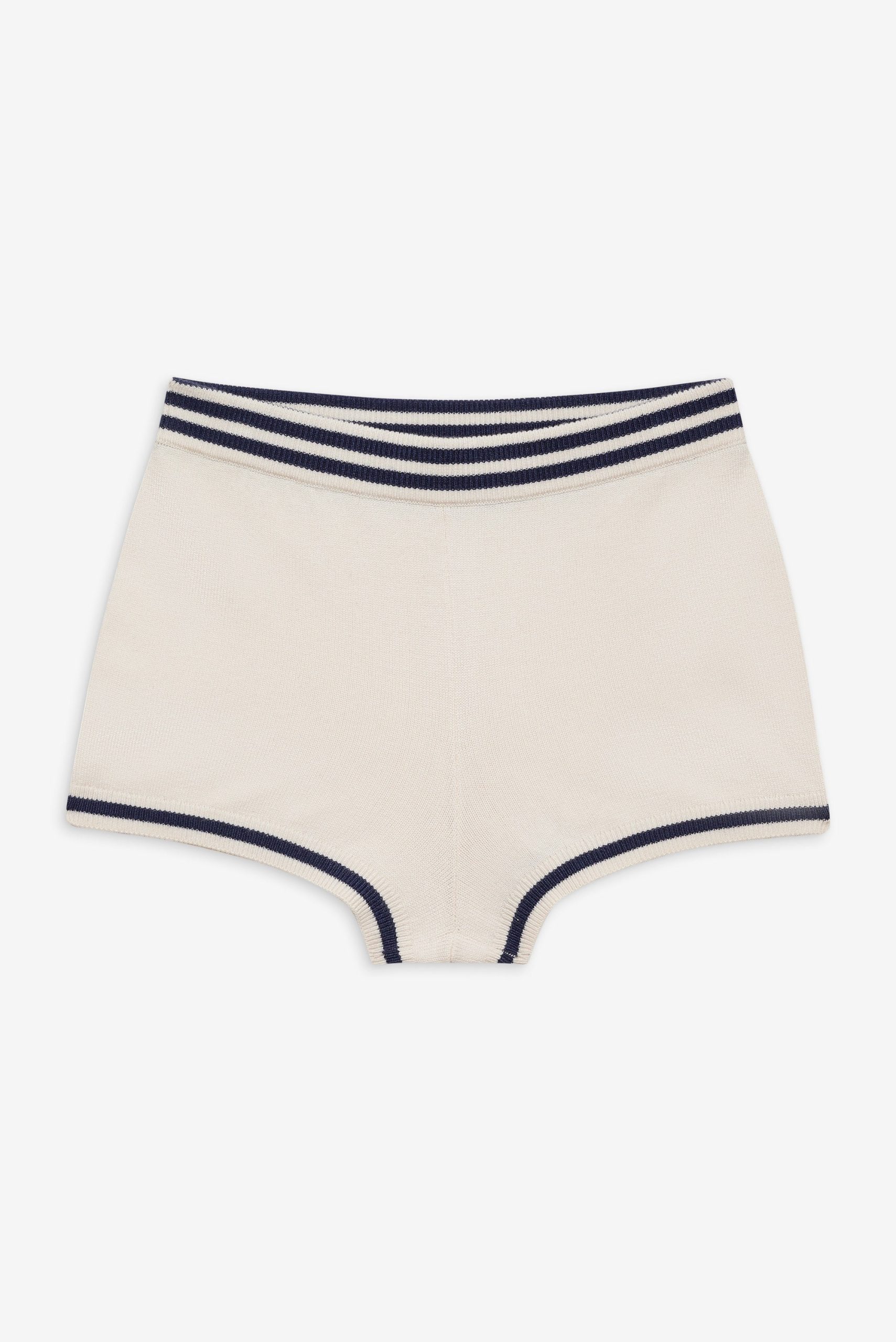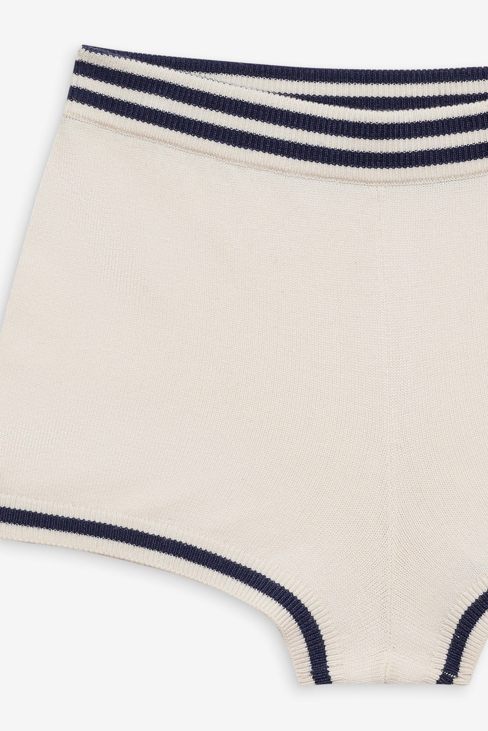 Make a chic, yet sophisticated statement in the Simona Pointelle knit shorts. These navy country club-esque high waisted hot pants feature a contrast striped rib along the waistband and leg, and are fitted throughout with a cheeky fit at the back.