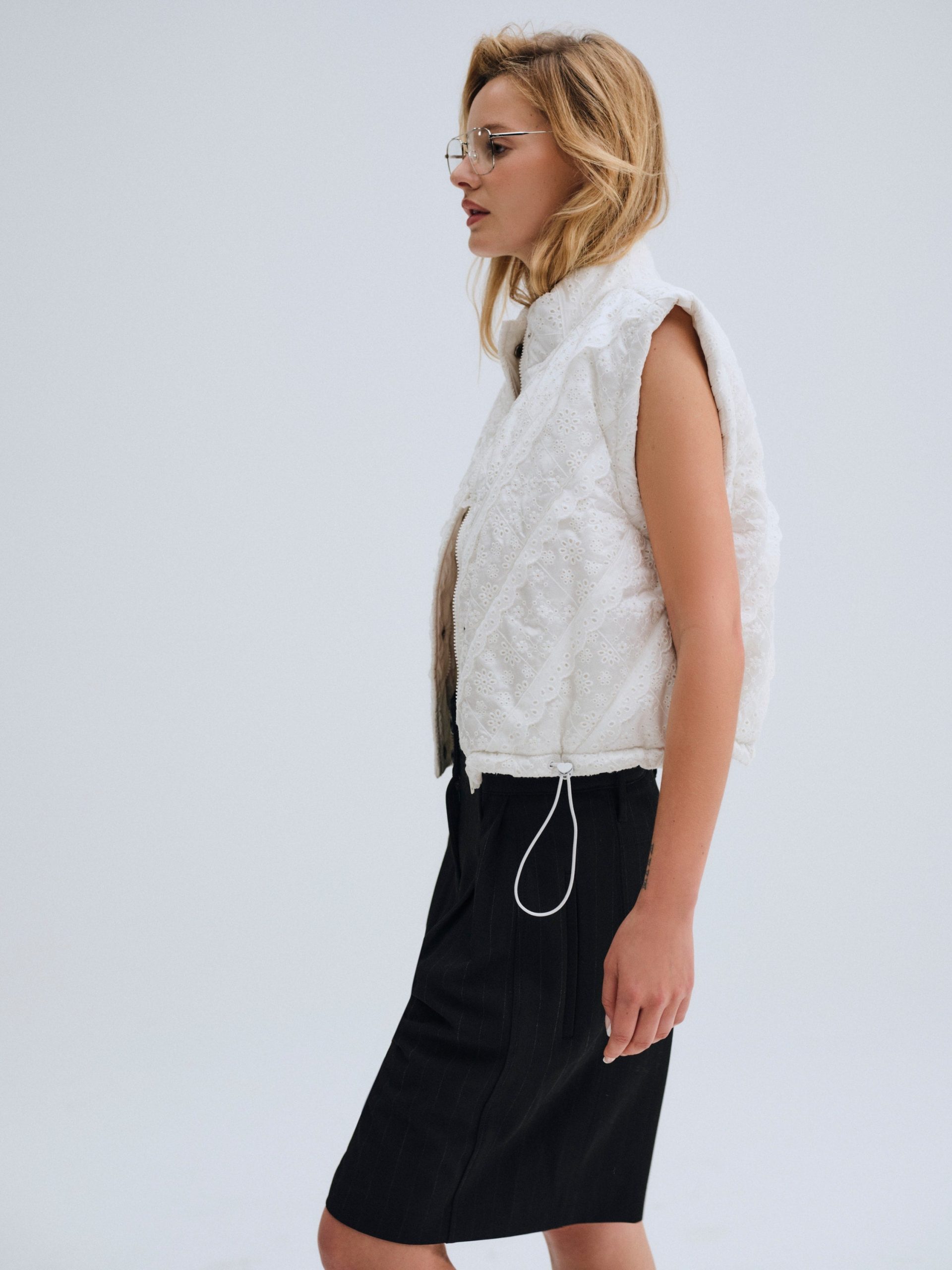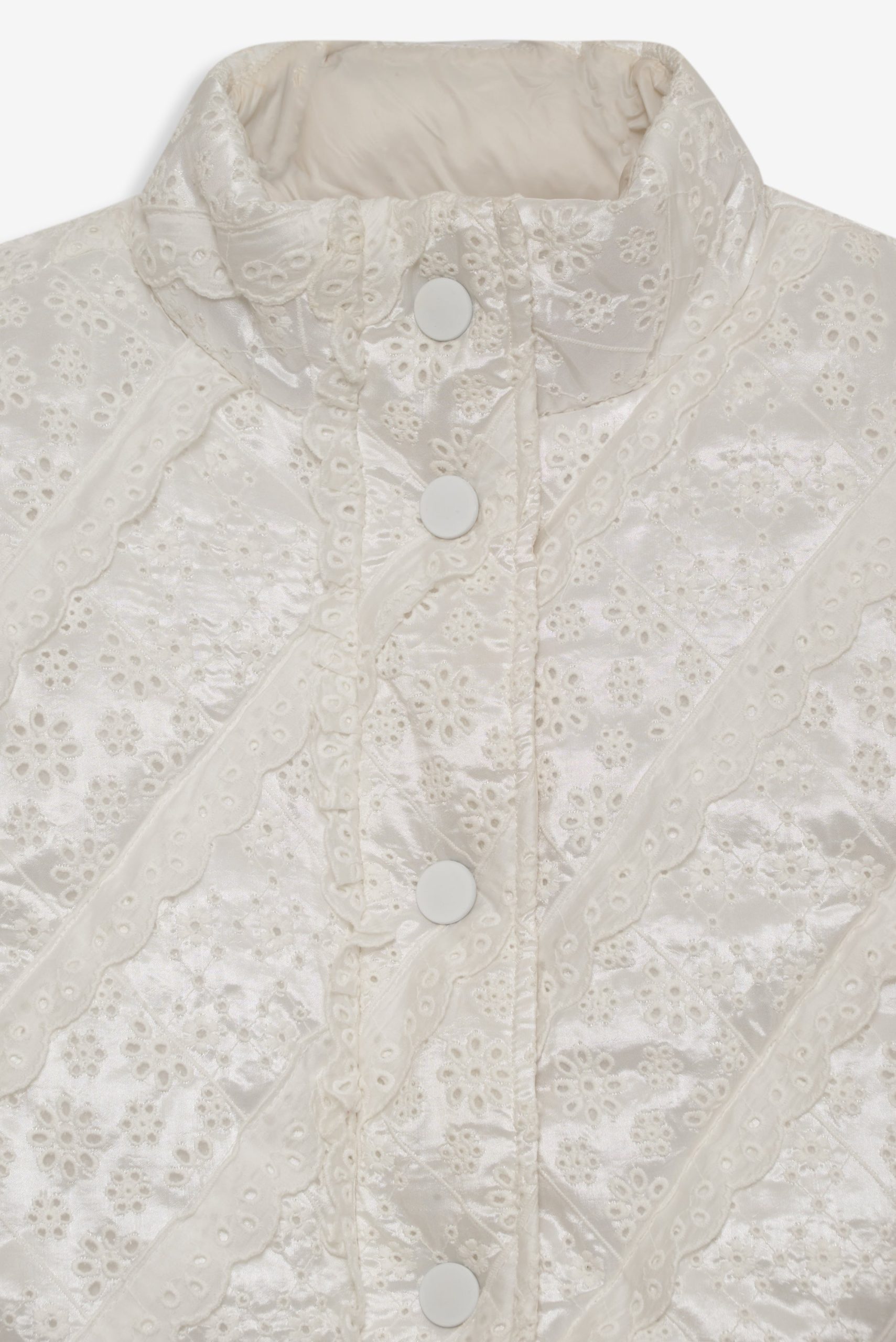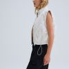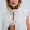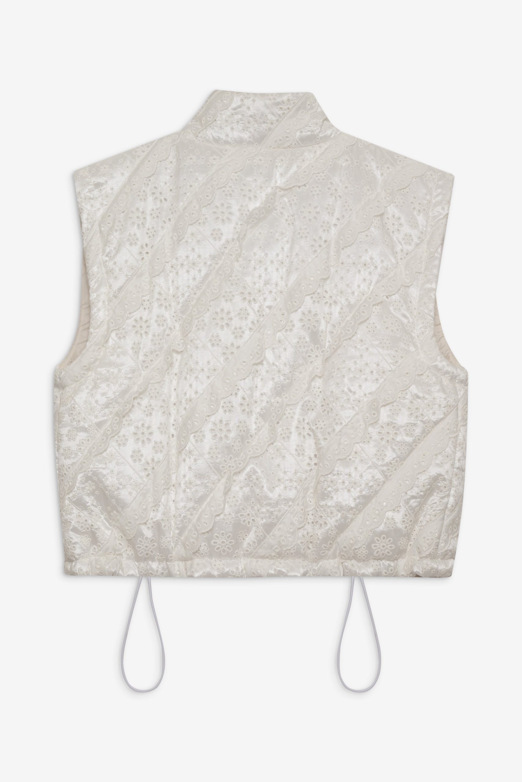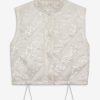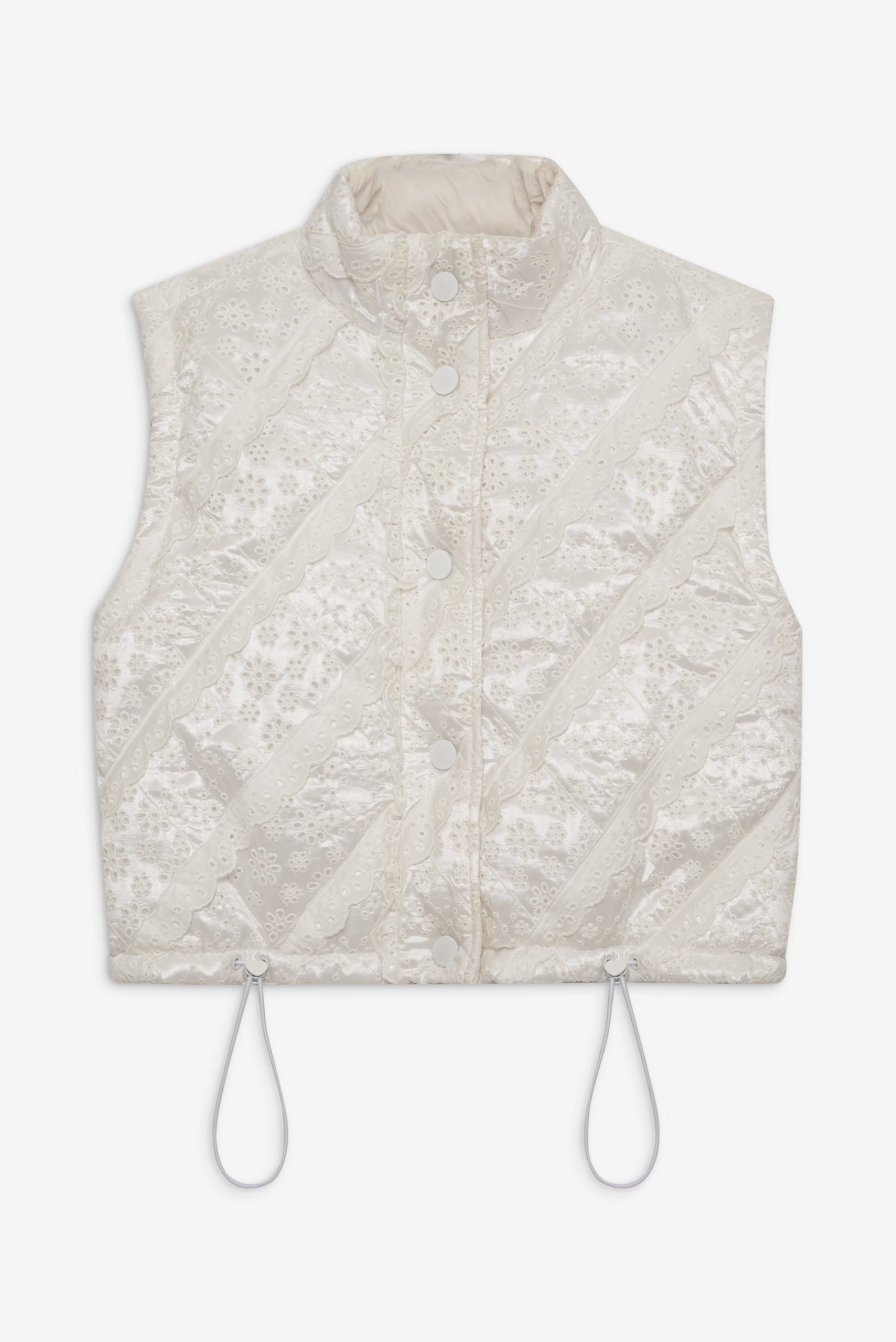 For Love & Lemons Essentials: Crafted for the busy Muse, the Sloane white puffer vest is crafted in an ultra-feminine patchwork with striking eyelet trims. This sleeveless puffer jacket is cut to a cropped length with functional metal snap buttons and a drawstring waist for cinching.