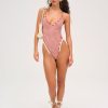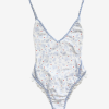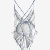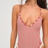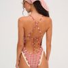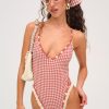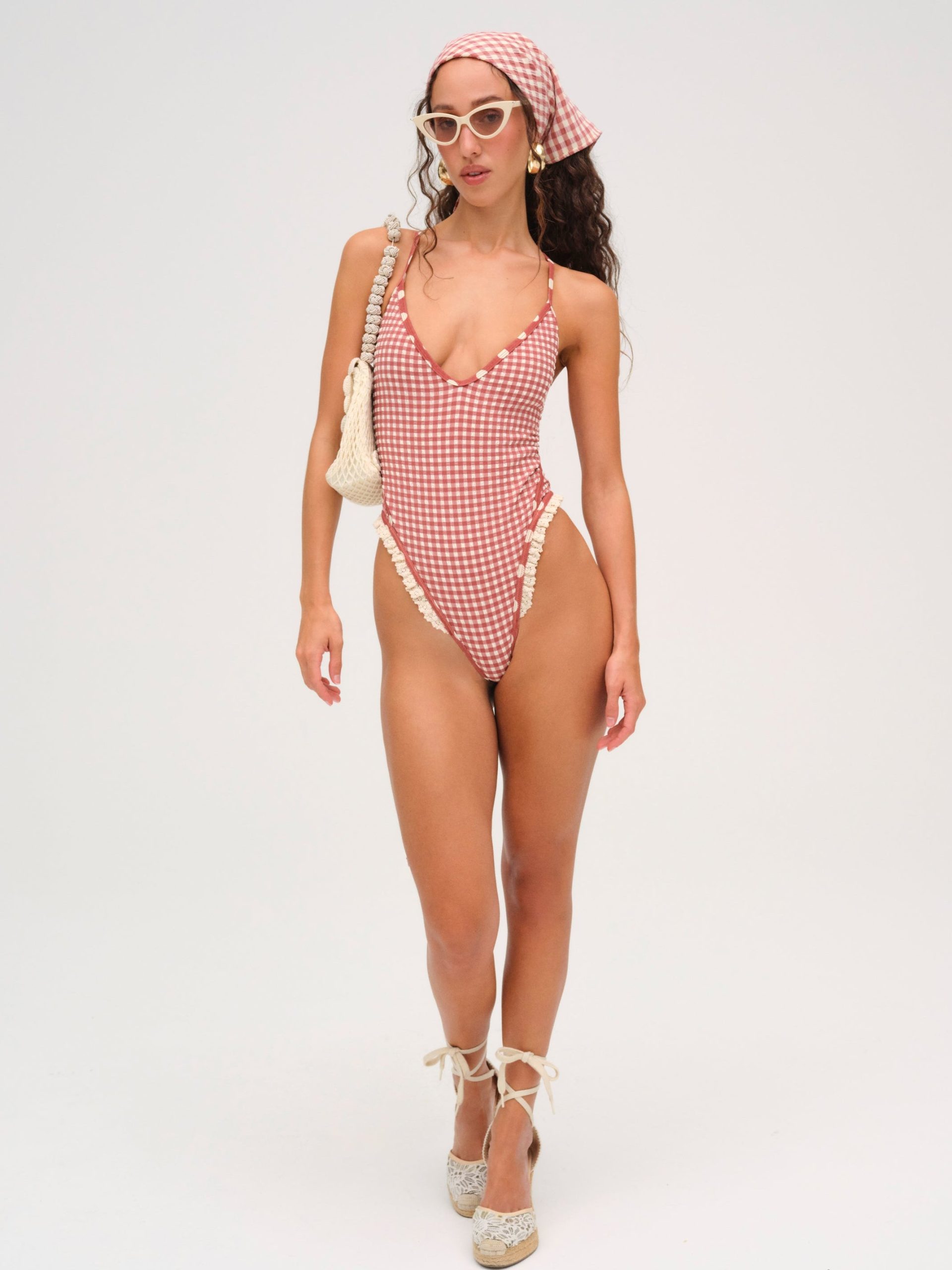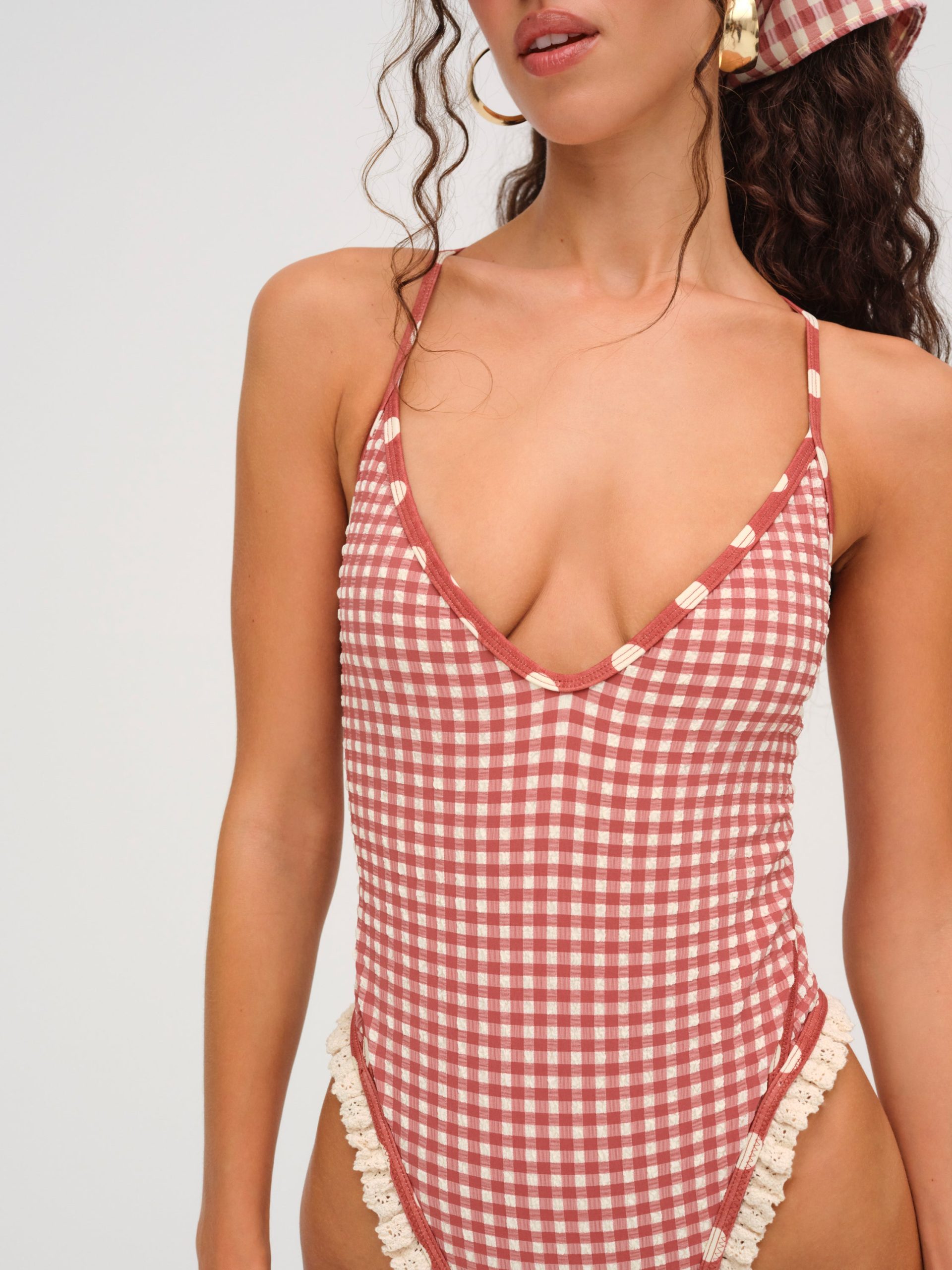 Inspired by vintage swimwear silhouettes—the Strappy one piece bathing suit is crafted in a charming blue gingham and a doily motif print for a nostalgic patchwork aesthetic. Designed with an alluring plunging v neckline, this swimsuit features high-hip cut legs and an opened scoop back for an ultra-flattering fit.