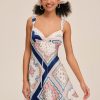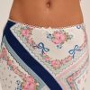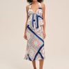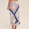 Inspired by vintage silhouettes, the Summer Scarf blue midi skirt exudes summer nostalgia. Cut on the bias for an ultra-flattering fit, this satin skirt spotlights an all-over handkerchief-inspired print and is adored with delicate picot trim and decorative bow.