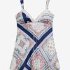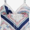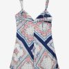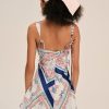 Inspired by vintage handkerchiefs, the Summer Scarf Mini Dress exudes summer charm. This blue dress spotlights an eyelet slotted ribbon trim along the neckline, ties at the center-front, and shirred cups.