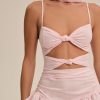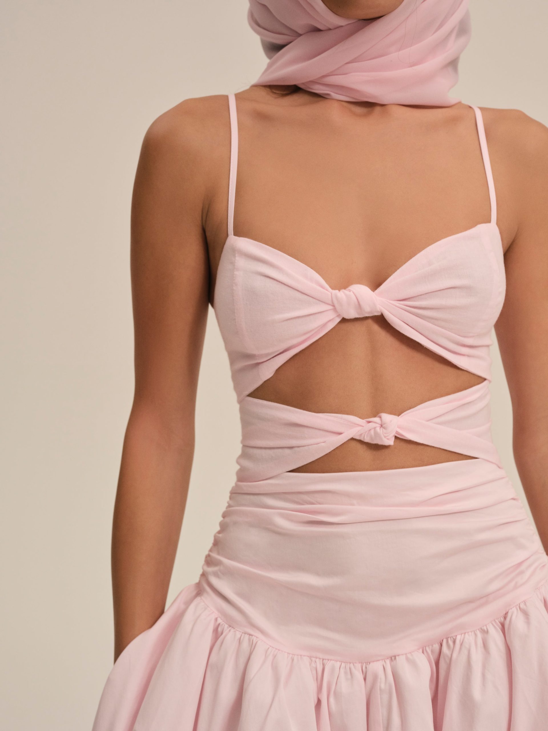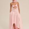 For your next sun-soaked escape–the Susannah pink maxi dress is crafted in a crisp cotton poplin that was made for long, lazy afternoons by the water. This drop waist maxi dress features a knotted bust with cut-outs, a gathered bodice, gathered skirt with tulle waist insert, and a high-low front skirt hem.