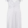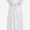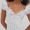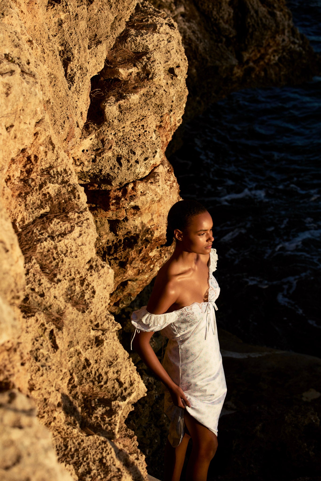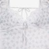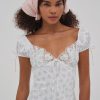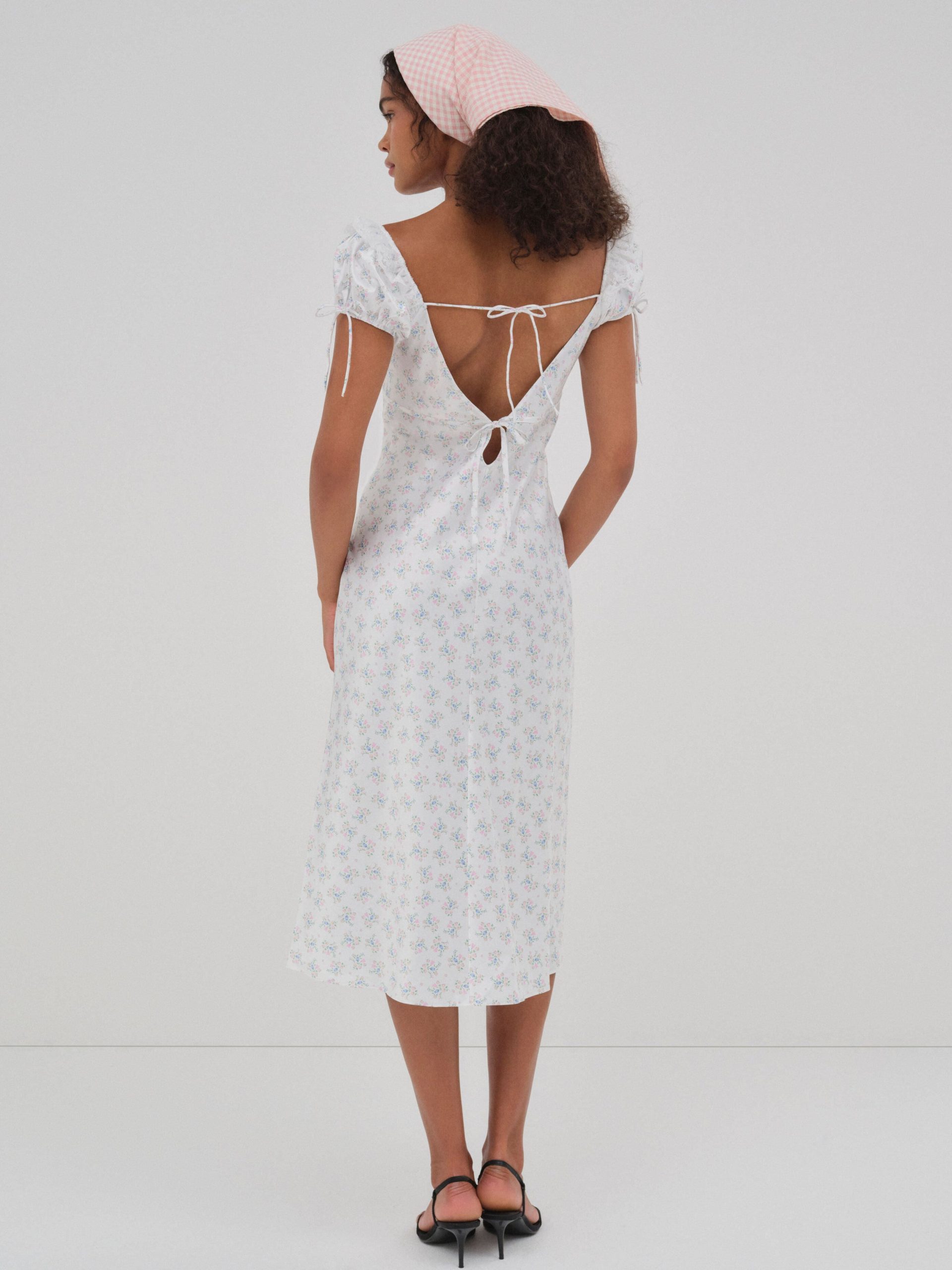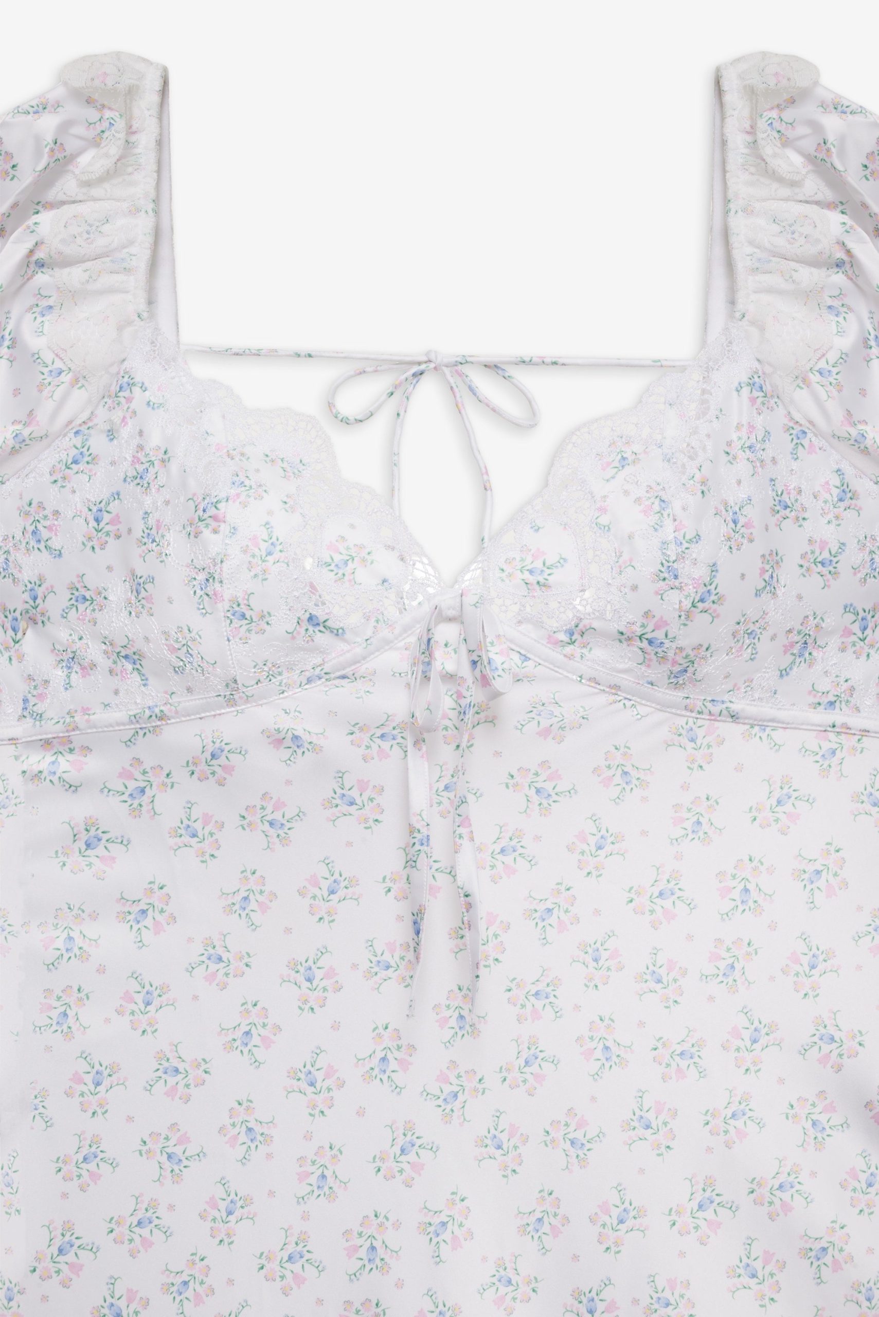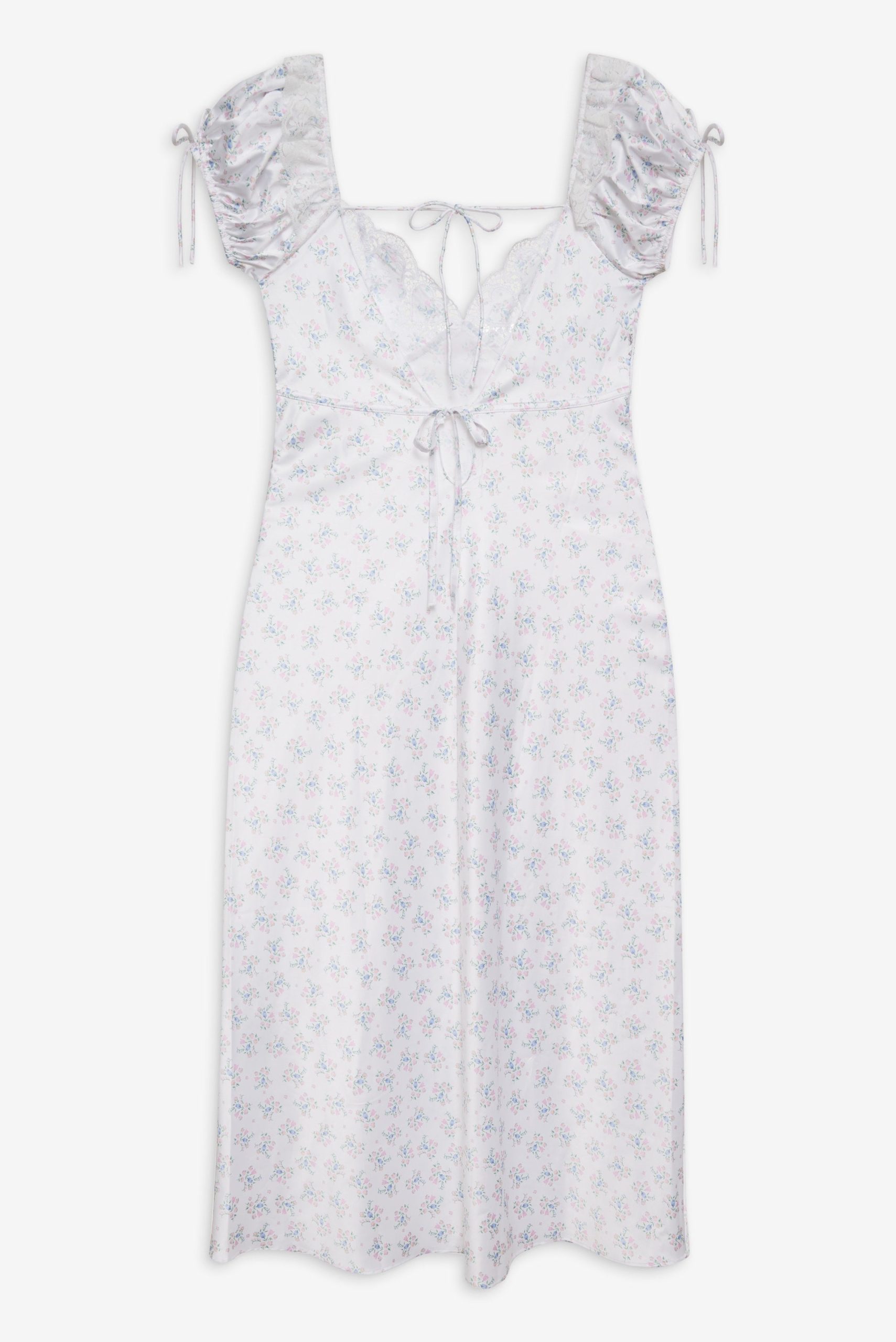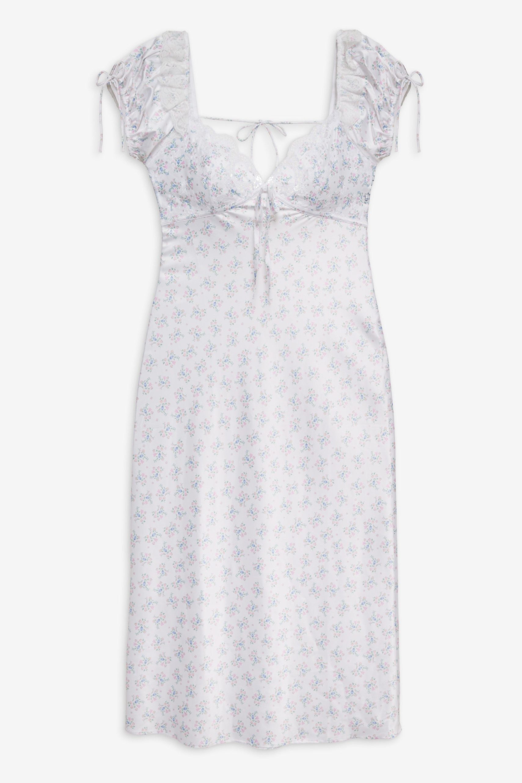 Inspired by heavenly European summers, the Sweet Escape white slip dress exudes timeless femininity. This printed satin midi dress spotlights triangle cups, a bias-cut skirt, and short puff sleeves. It’s adorned with lace ruffles at the shoulders.