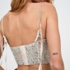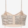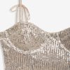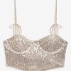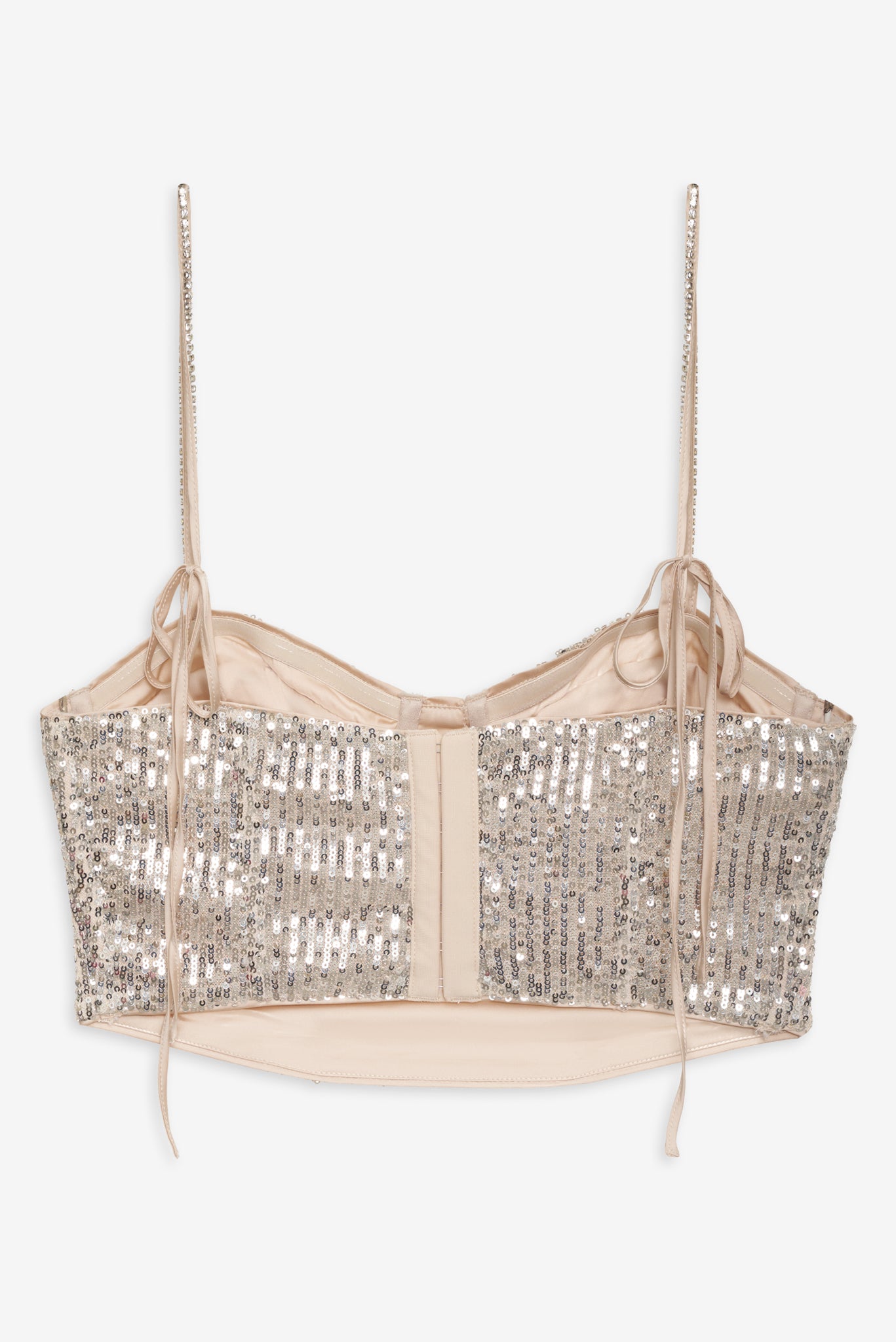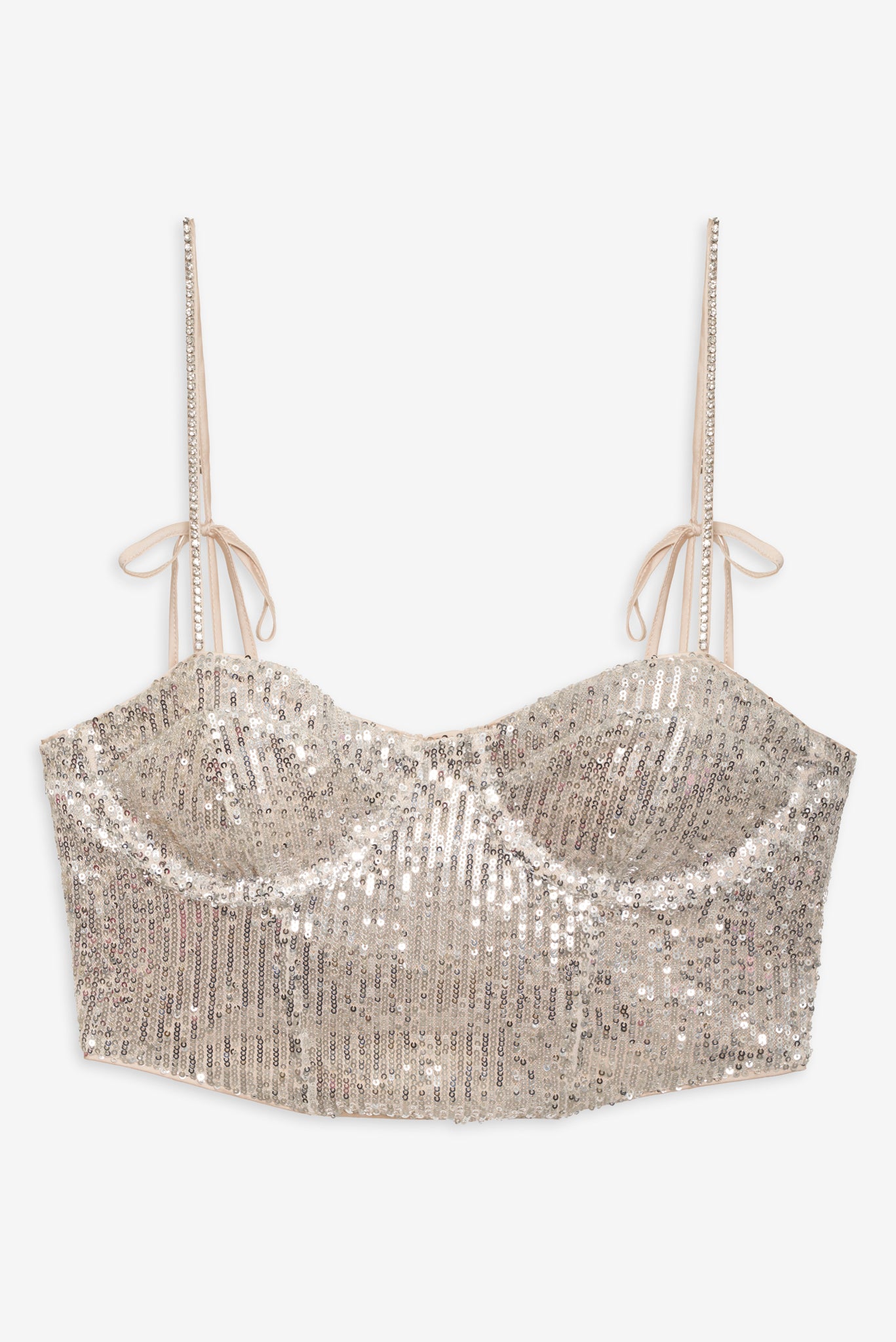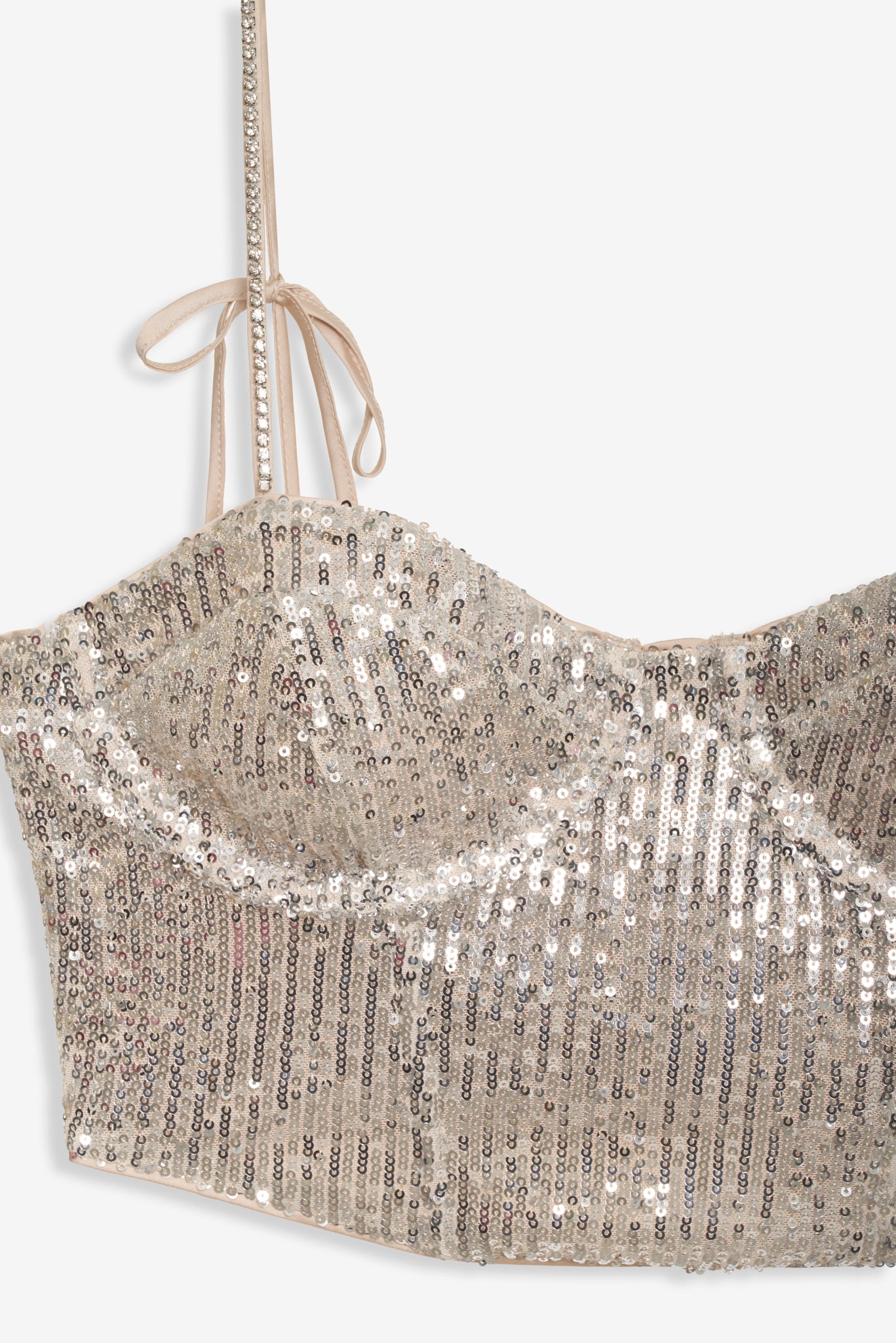 Be the star of sparkle season in the Tia silver top—a cropped sequin top with underwire cups, boning and rhinestone embellishments. This crop top ties at the back with satin ties.