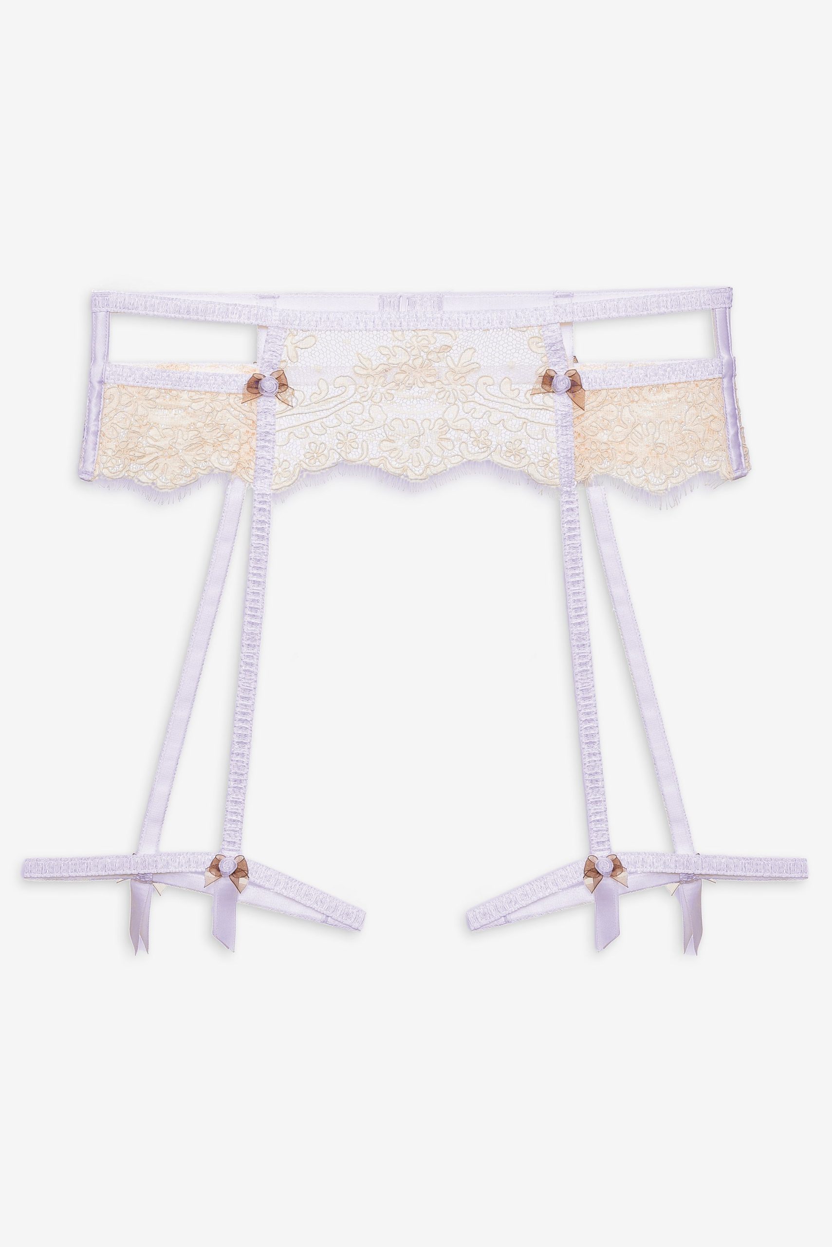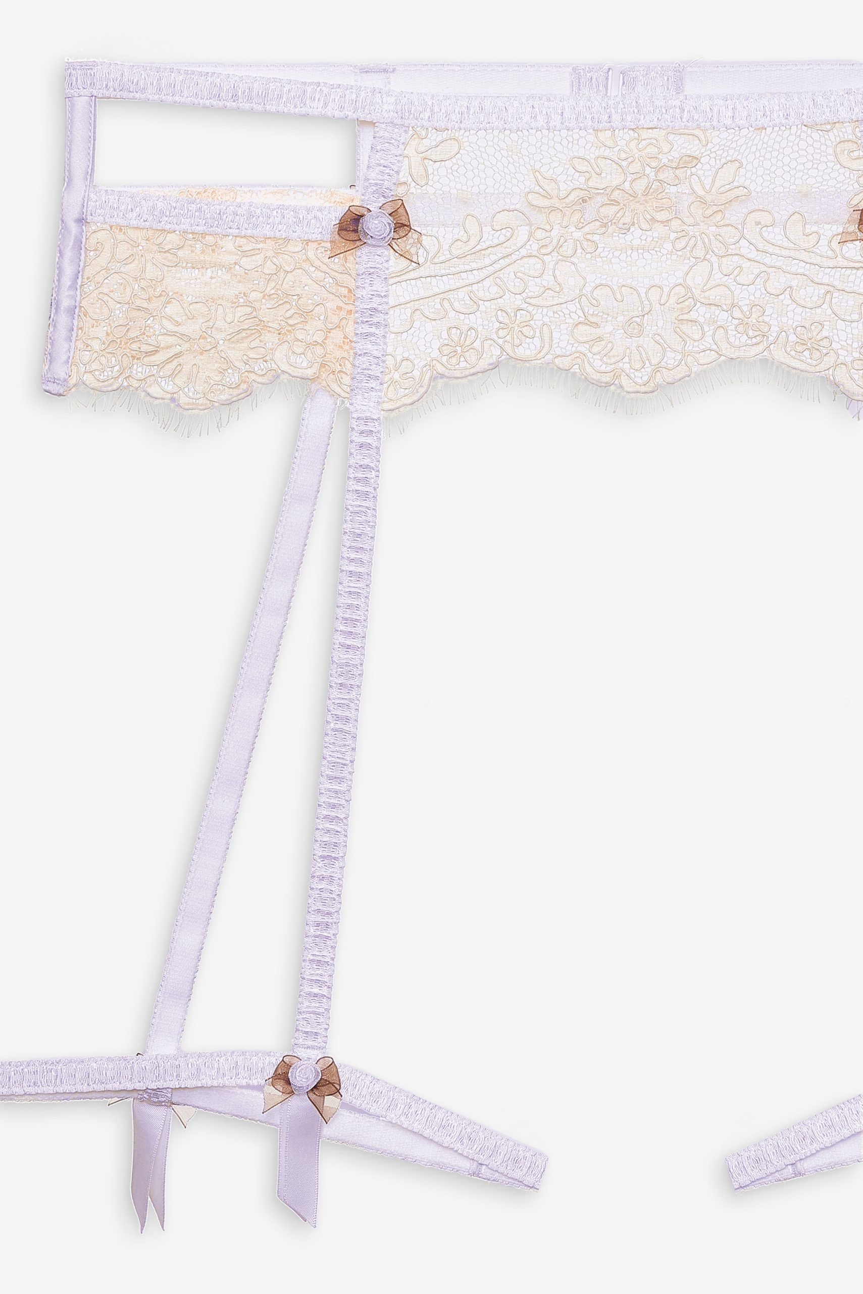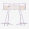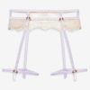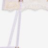 Inspired by the soft femininity of the ’90s, the Victoria lace garter belt is crafted in intricate lace with contrast pastel ruffled trims. This high-waisted garter features flirty cutouts at the sides, an open cage back, and romantic rosettes throughout.