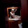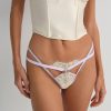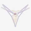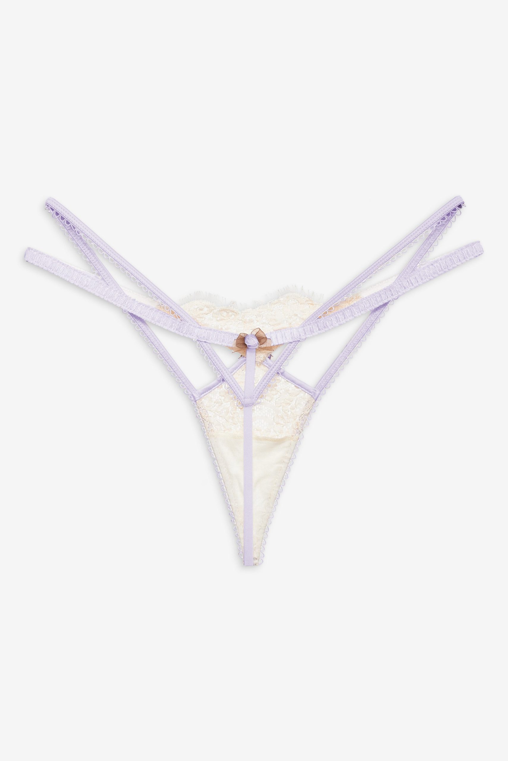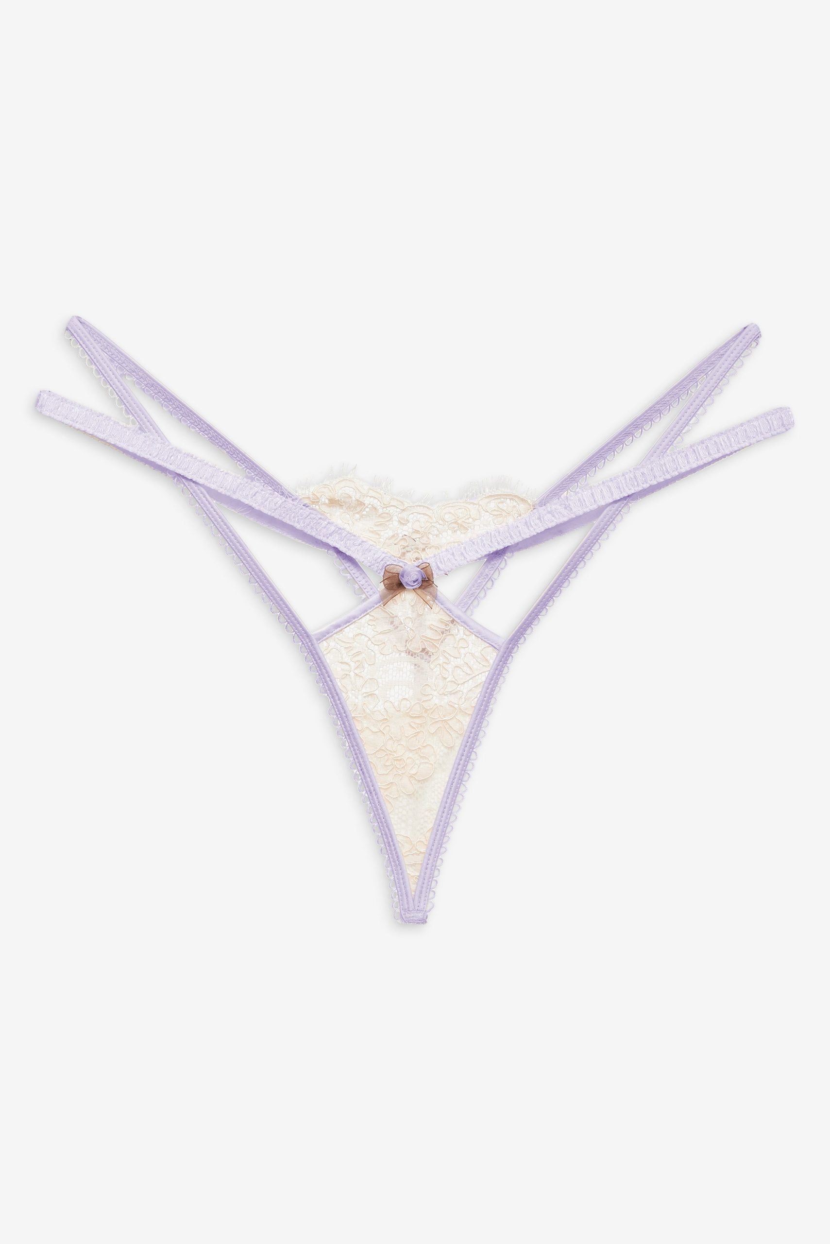 Inspired by the soft femininity of the ‘90s, the Victoria lace thong panty is crafted in an intricate lace and contrast pastel ruffled elastic. This g-string features front cut-outs and is adorned with rosettes and picot trims.