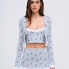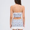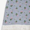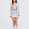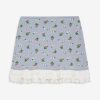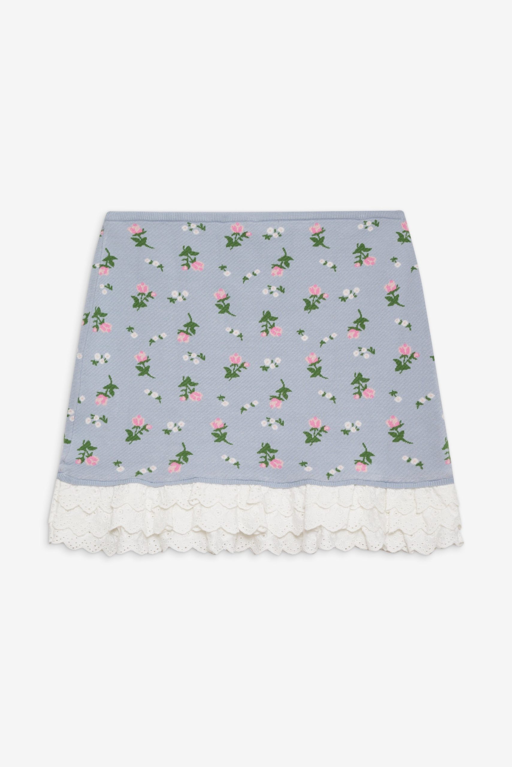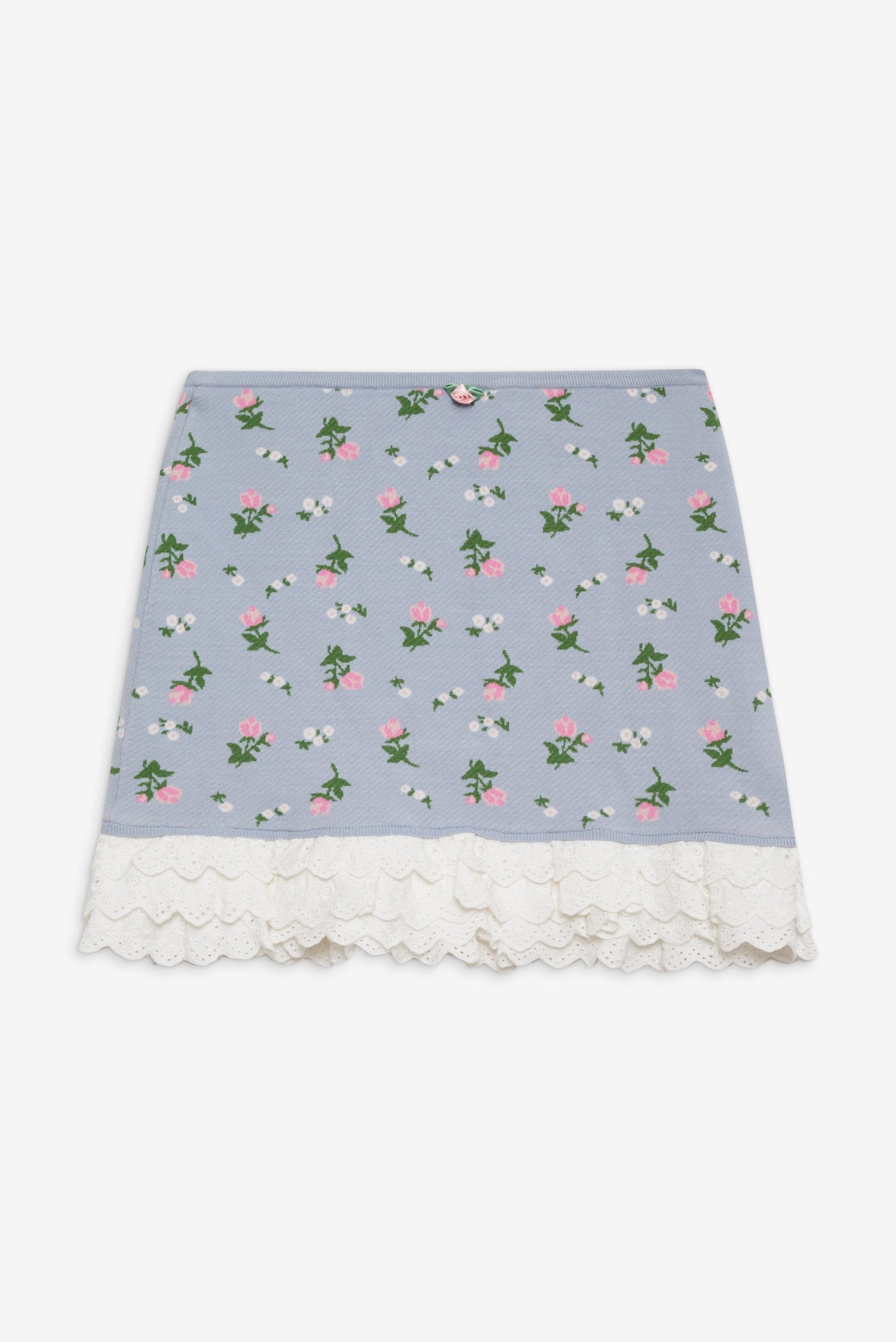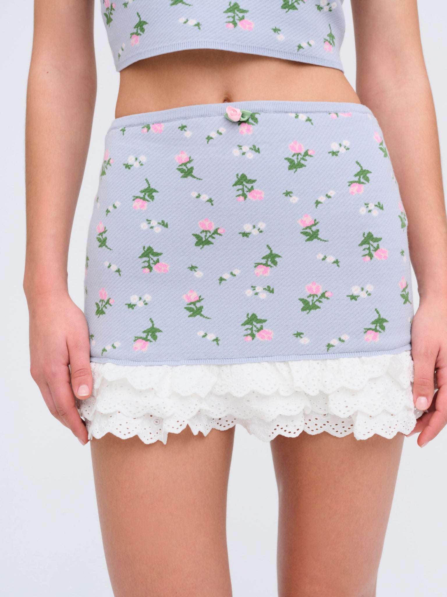 Designed for the romantic dreamer, the Amalia blue knit mini skirt showcases a feminine “rosey posey” design. Cut to a mini length, this short skirt is decorated with a rosette at the center-front waistband and contrast eyelet trims ruffled along the bottom hem. Pair it with the Amalia Knit Cardigan for a 2-piece skirt set.