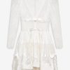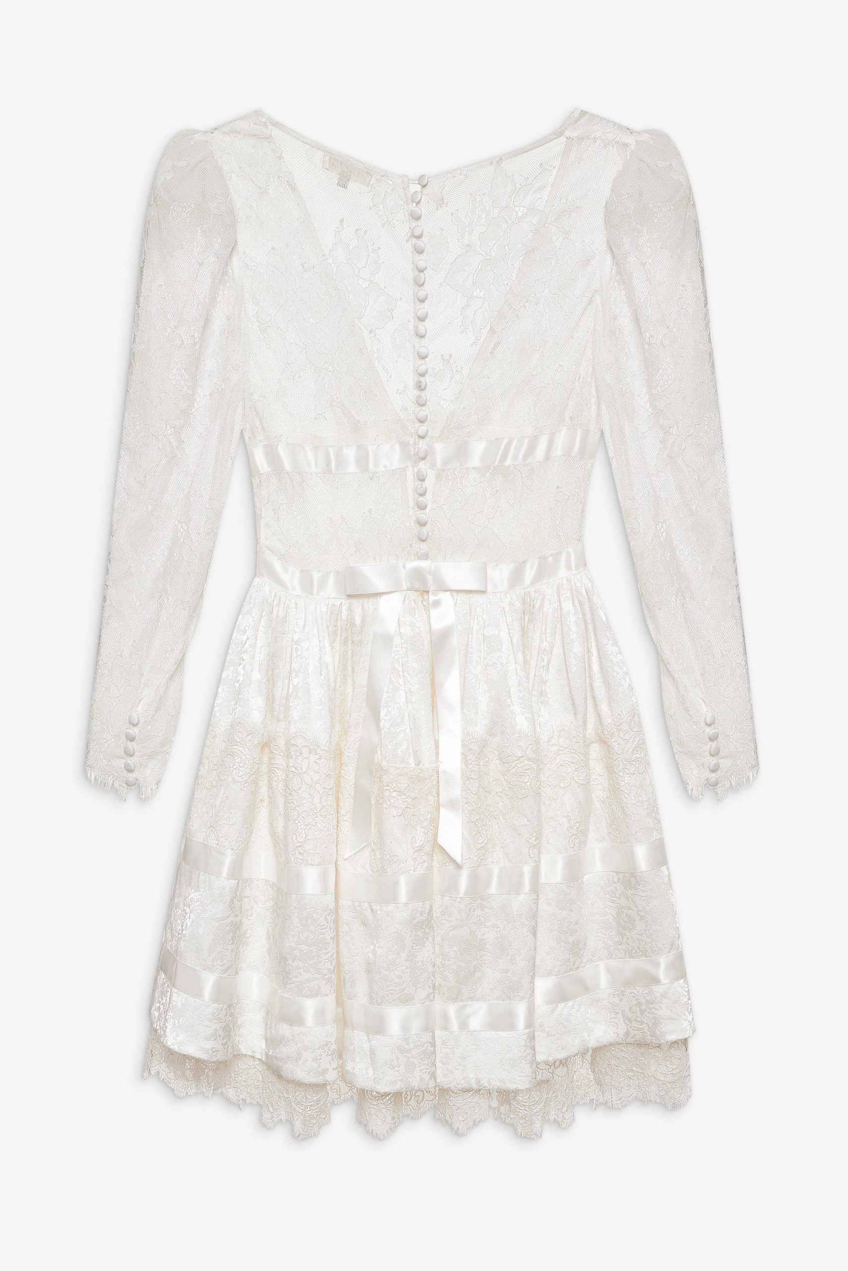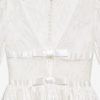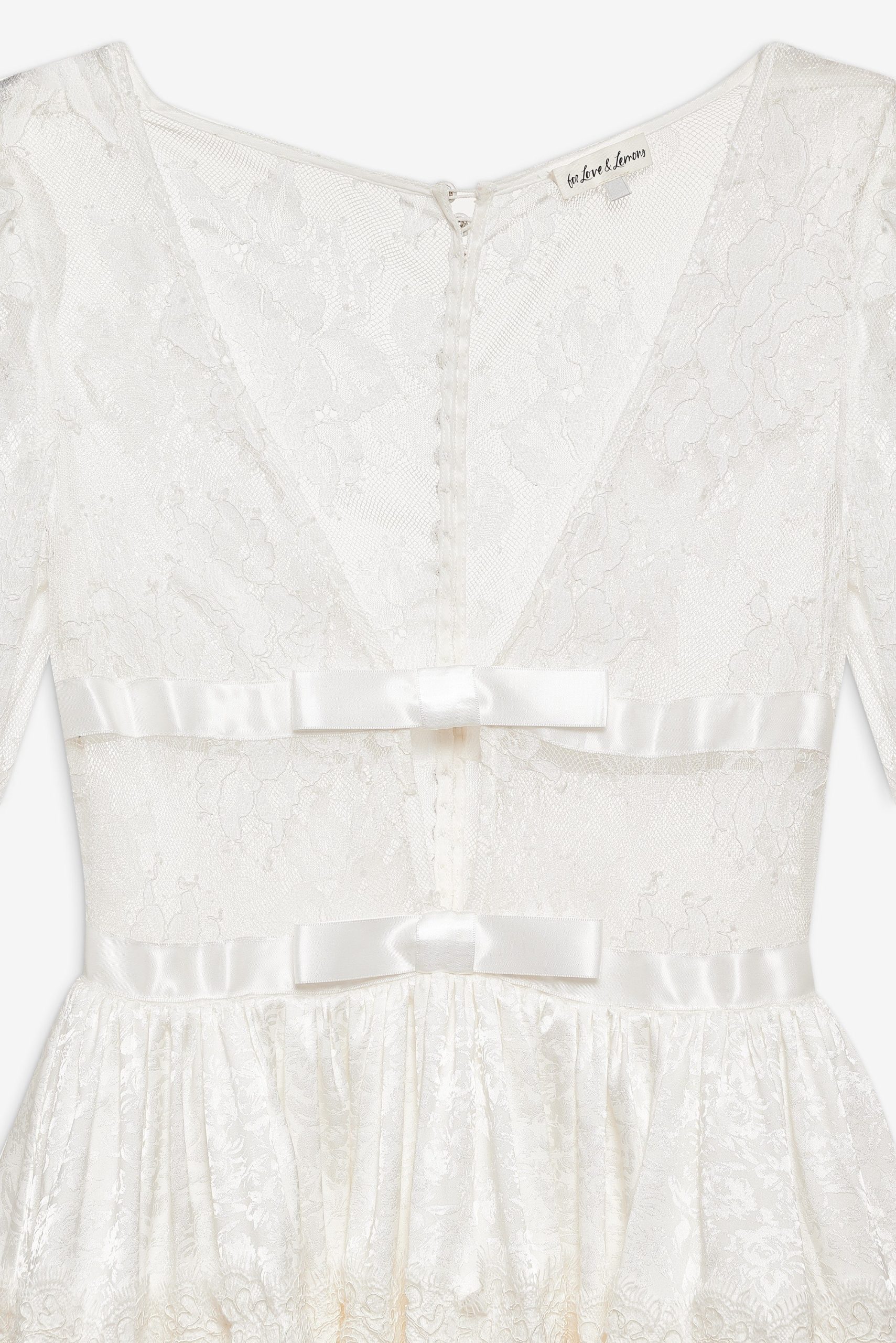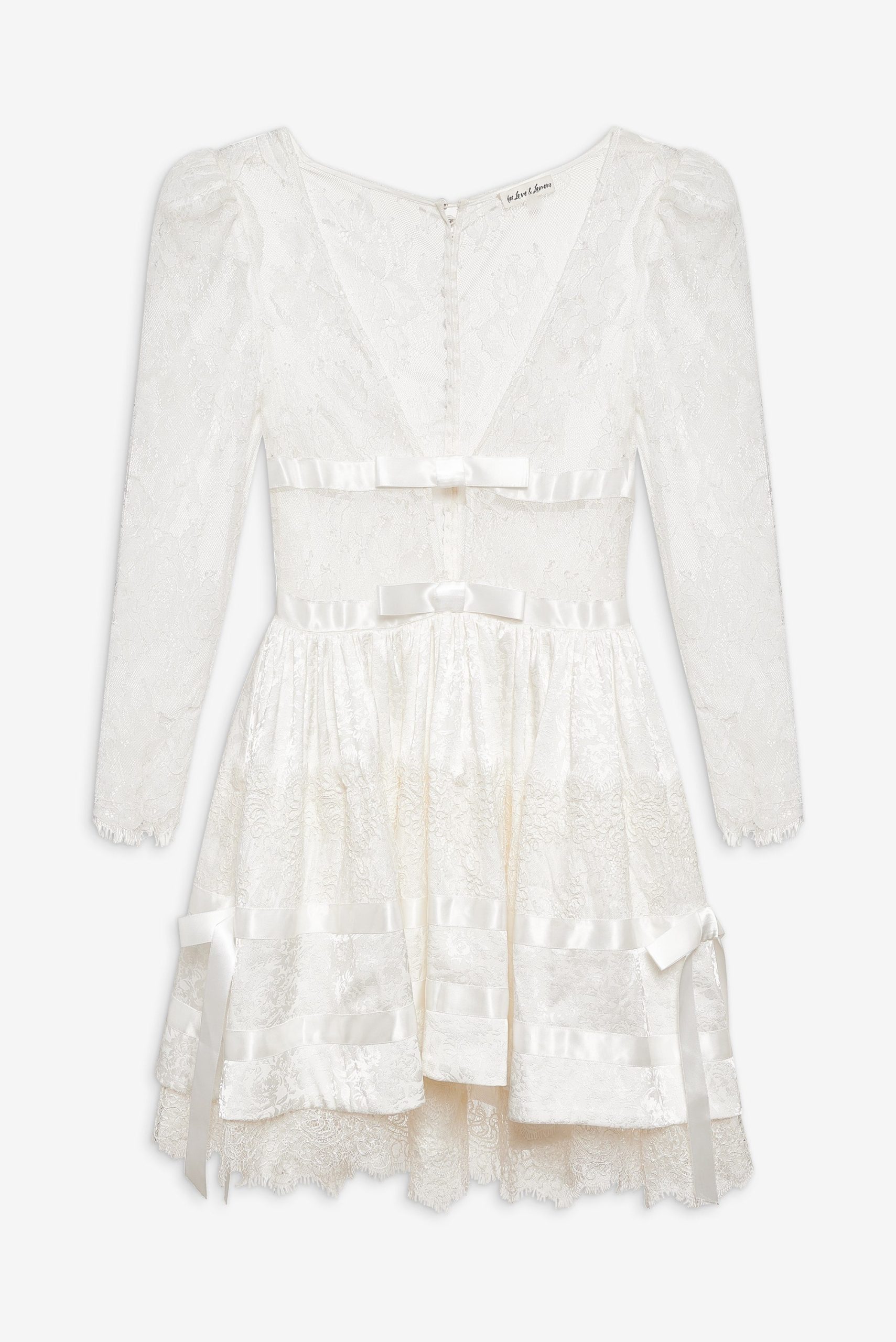 The Annabelle cream lace mini dress redefines tradition with its sheer bust, elegant lace three-quarter sleeves, and striking satin jacquard skirt. Cut to a plunging V-neckline, this bridal dress spotlights satin ribbon bows at the neckline, waist, and skirt side seams—plus a lace trim that playfully peeks out at the hem.