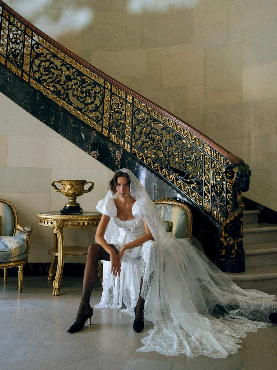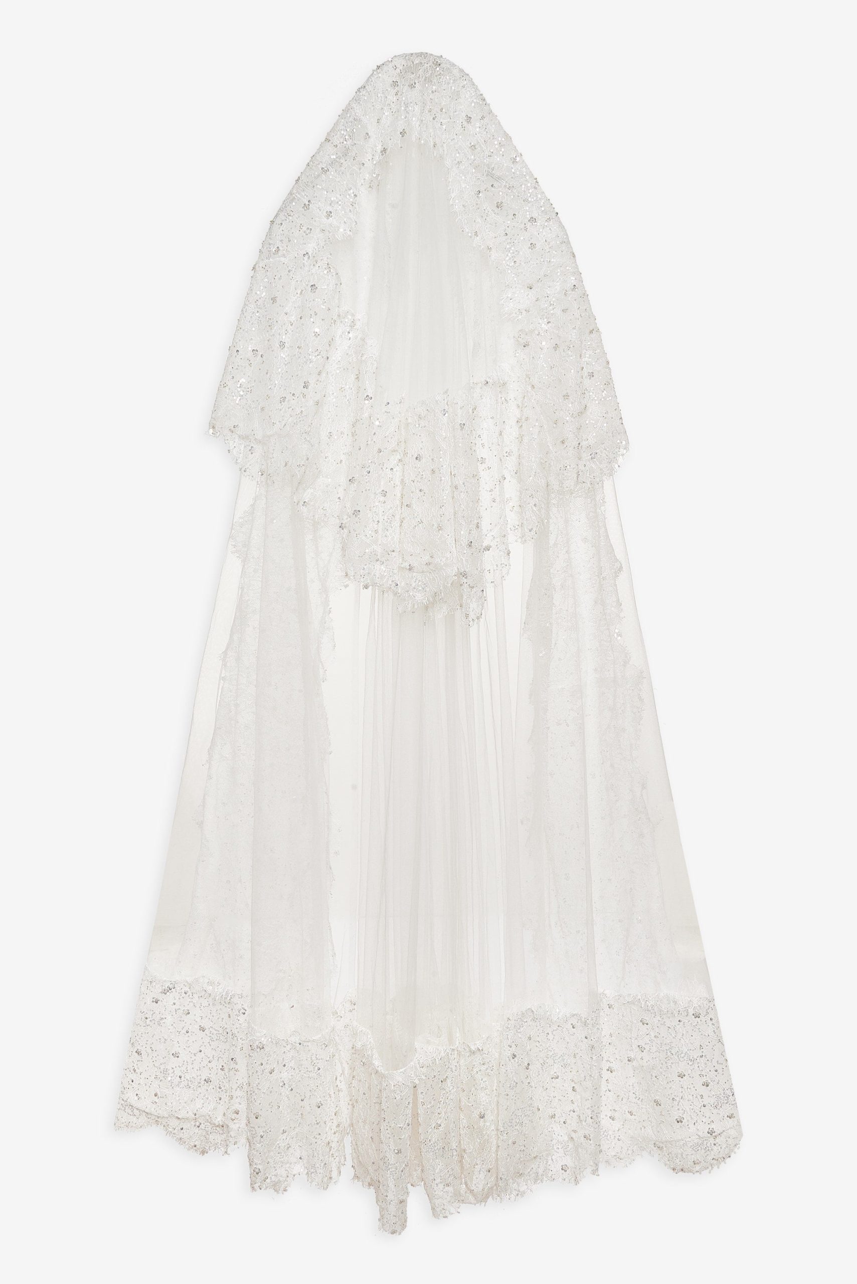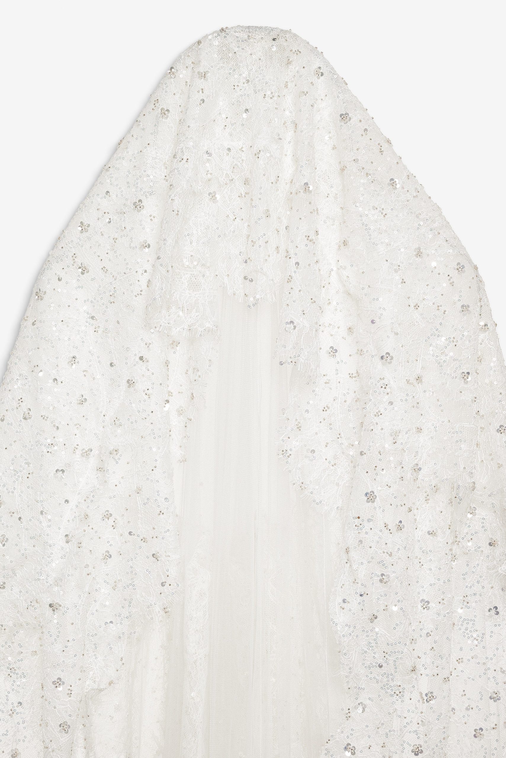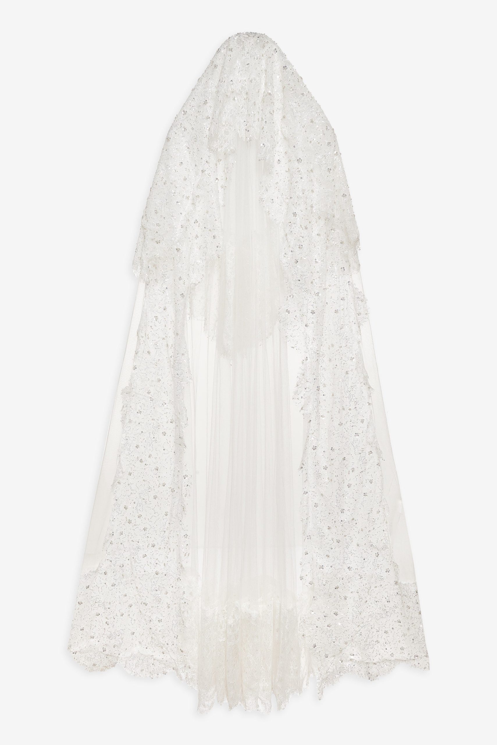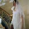 Balance modern romance and tradition with the Ava white bridal veil—a dramatic tiered tulle veil finished with intricate beaded lace at the edges. The top layer cascades to the lower back while the lower layer falls to the floor with a small elegant train.