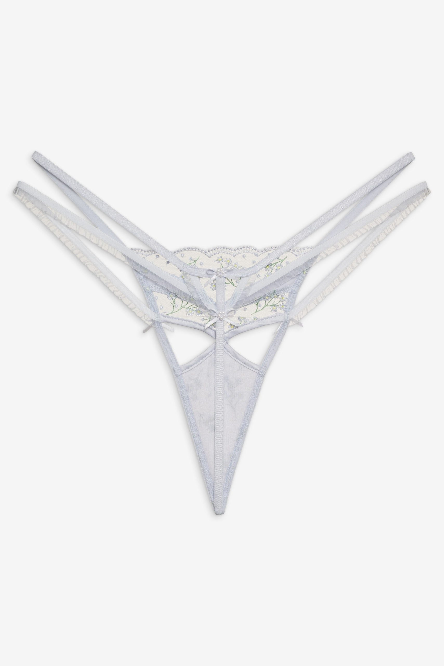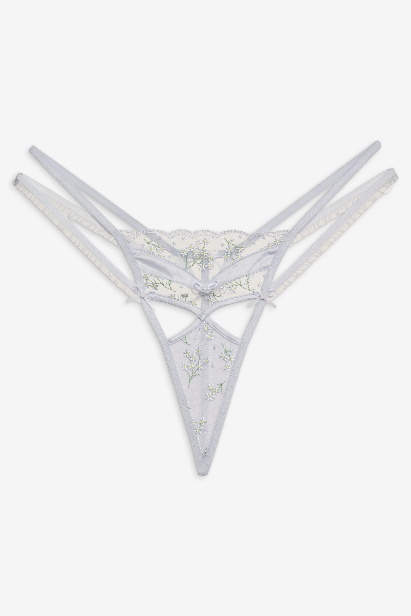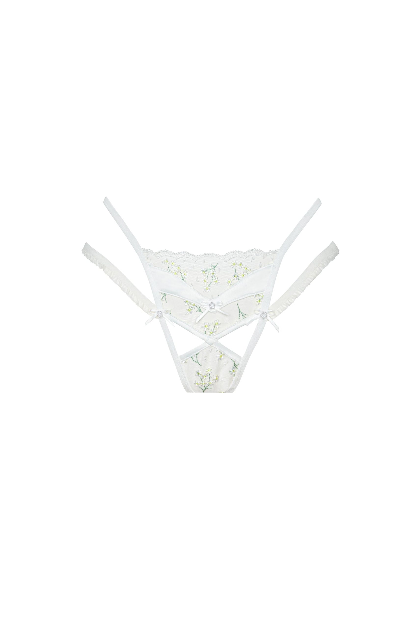 Delicate Baby’s Breath embroidery lends a sense of romance to this dainty white G-string. Featuring seductive cut-outs, decorative satin bows at the front and back, and a scalloped lace edge at the center-front waist—this thong underwear is sweet and not-so-innocent. Pair it with the matching Baby’s Breath Underwire Bra.