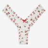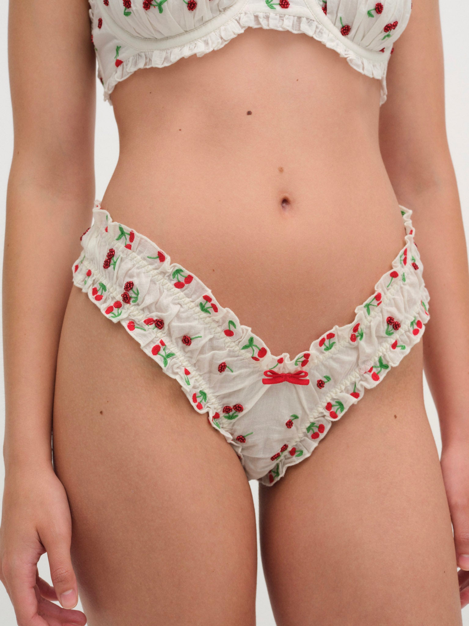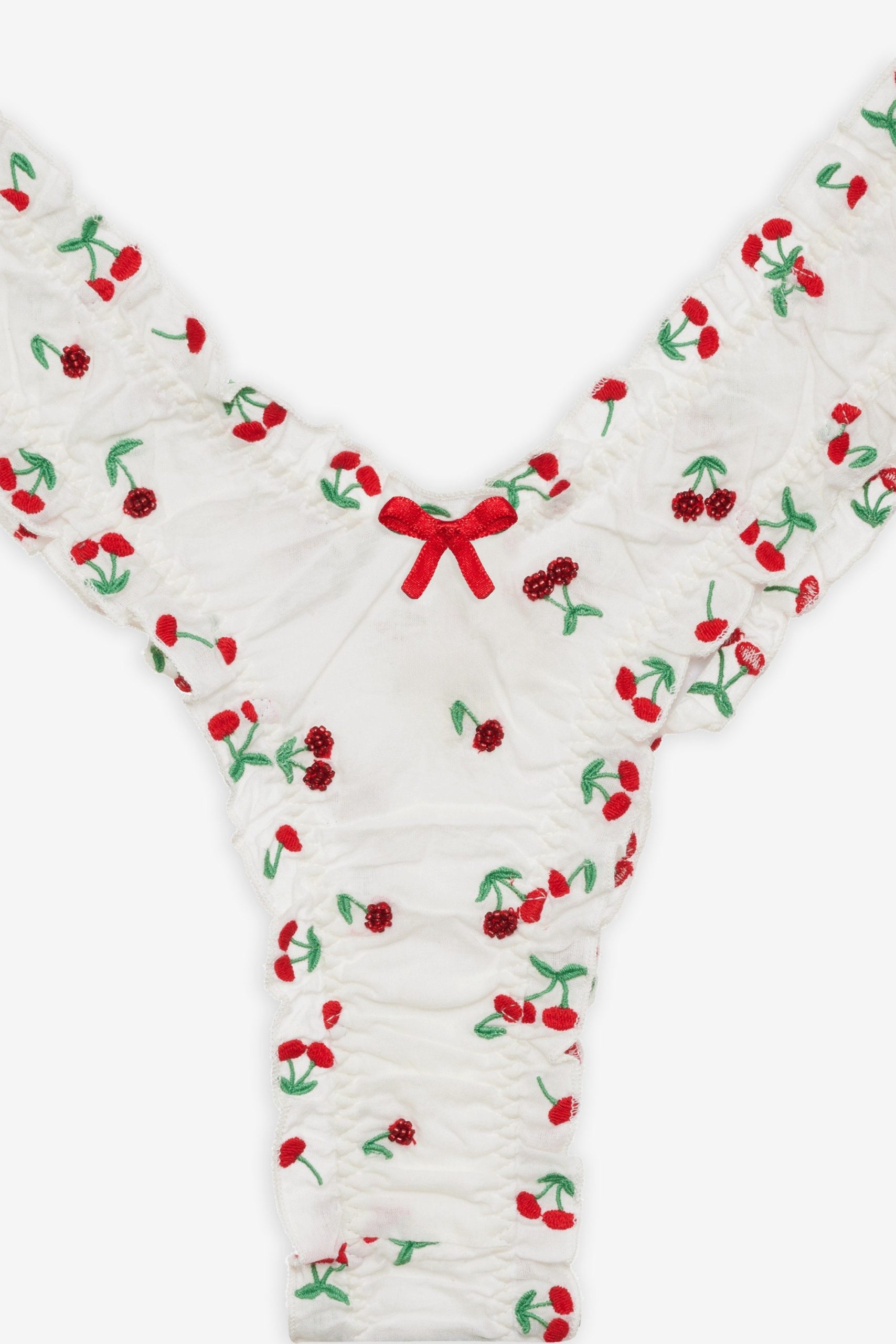 Celebrate love, beauty, and over-the-top romance with the Beaded Cherries thong panty. Crafted in a crisp white cotton, this vintage-inspired white thong is adorned with beaded cherries, ruffles at the edges, and a sweet satin bow appliqué.