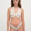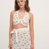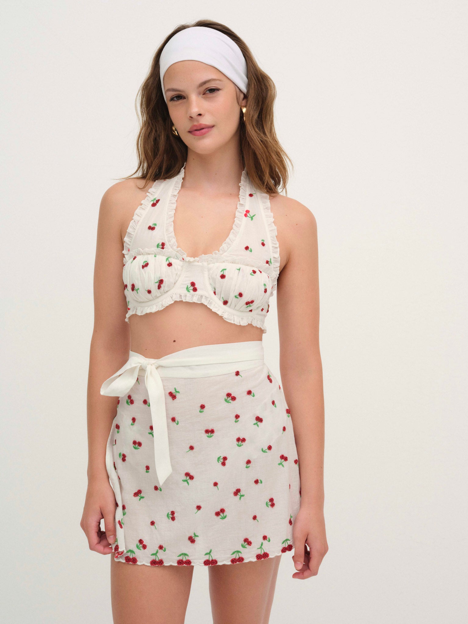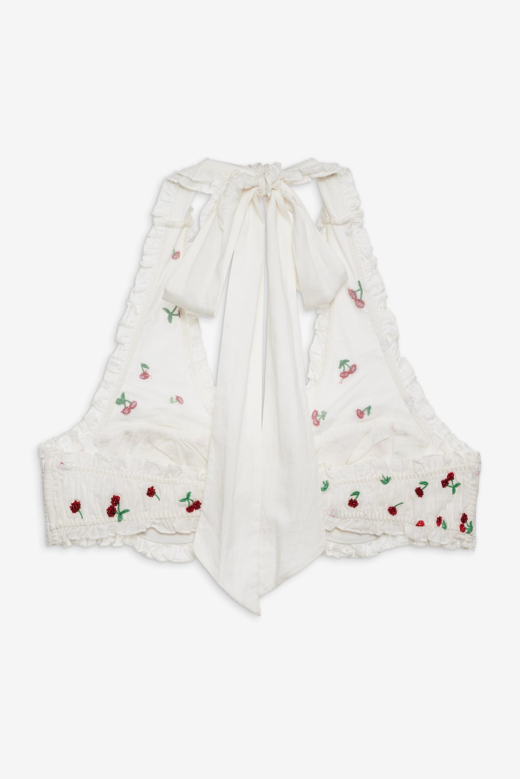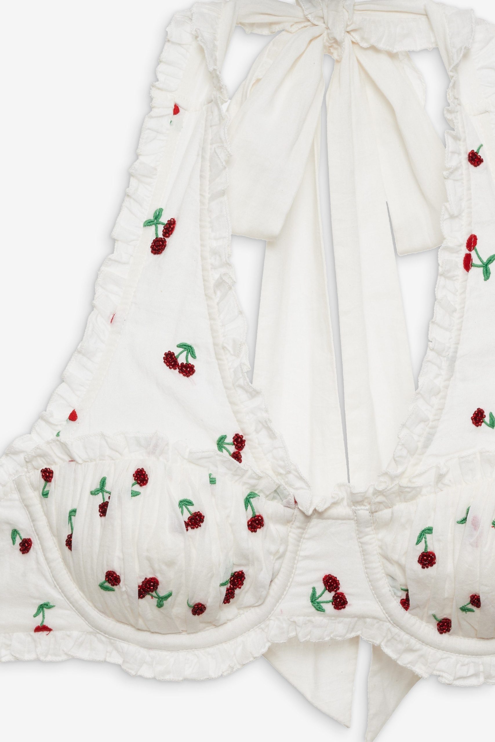 Celebrating love, beauty, and over-the-top romance with the Beaded Cherries underwire bra. Crafted in a crisp white cotton, this vintage silhouette-inspired halter bra is adorned with beaded cherries and ruffles at the edges.