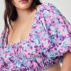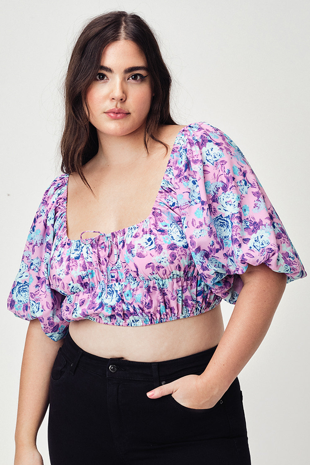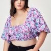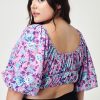 Breezy purple floral print crop top that can be worn on or off the shoulder. Billowing short sleeves, stretch chiffon. Adjustable On or Off the Shoulder Fit Elastic Throughout Fully Lined Pull On Silhouette