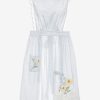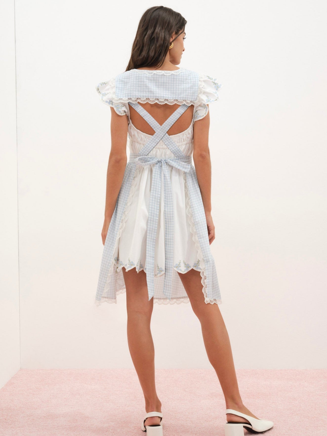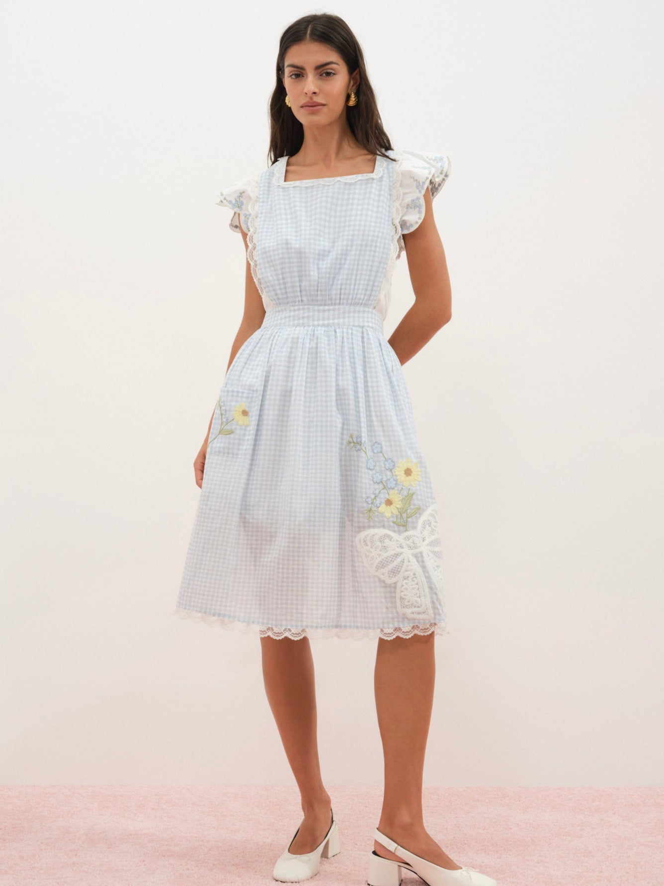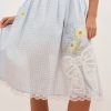 The Bluebell Gingham Apron is a recipe for romance. Crafted in 100% cotton, this blue apron features a squared bib neckline with ties at back. Adorned with lace trims, a patch pocket with daisy embroidery, and an inset lace bow at the hem—this cotton apron took inspiration from antique linens.