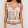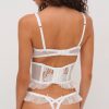Designed for a picture perfect honeymoon, the Blushing Blooms white bustier exudes divine romance. Crafted in a sheer floral embroidered mesh, this bustier top is detailed with decorative elastic trims, ruffled tulle, and bow appliqués.