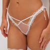 Dreamy lingerie designed for the ethereal bride, the Bridal Ruffled lace thong panty was made for fairytale-like romance. This crotchless panty is crafted in delicate stretch mesh and adorned with a lace slotted ribbon trim, ruffled elastic, and decorative bow appliqués.