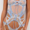 Discover your something new and something blue with the Brigitte Bow blue teddy–a lingerie bodysuit adorned with romantic floral embroidery, ruffled elastic trims, and rosette topped bow appliqués. This thong bodysuit spotlights flattering waist and hip cut-outs, plus functional leg garter clips for the ultimate bridal lingerie look.