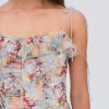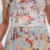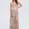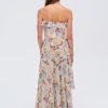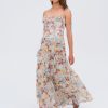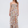 Featured in a heavenly floral cloud print with muted fall hues, the Constance blue maxi dress is the perfect transitional gown. Inspired by vintage dresses, this long gown has ruffles at the neckline and skirt, a high-cut slit at the thigh, and a removable bustier with lace up detailing, boning, and princess pleats.
