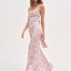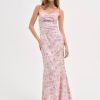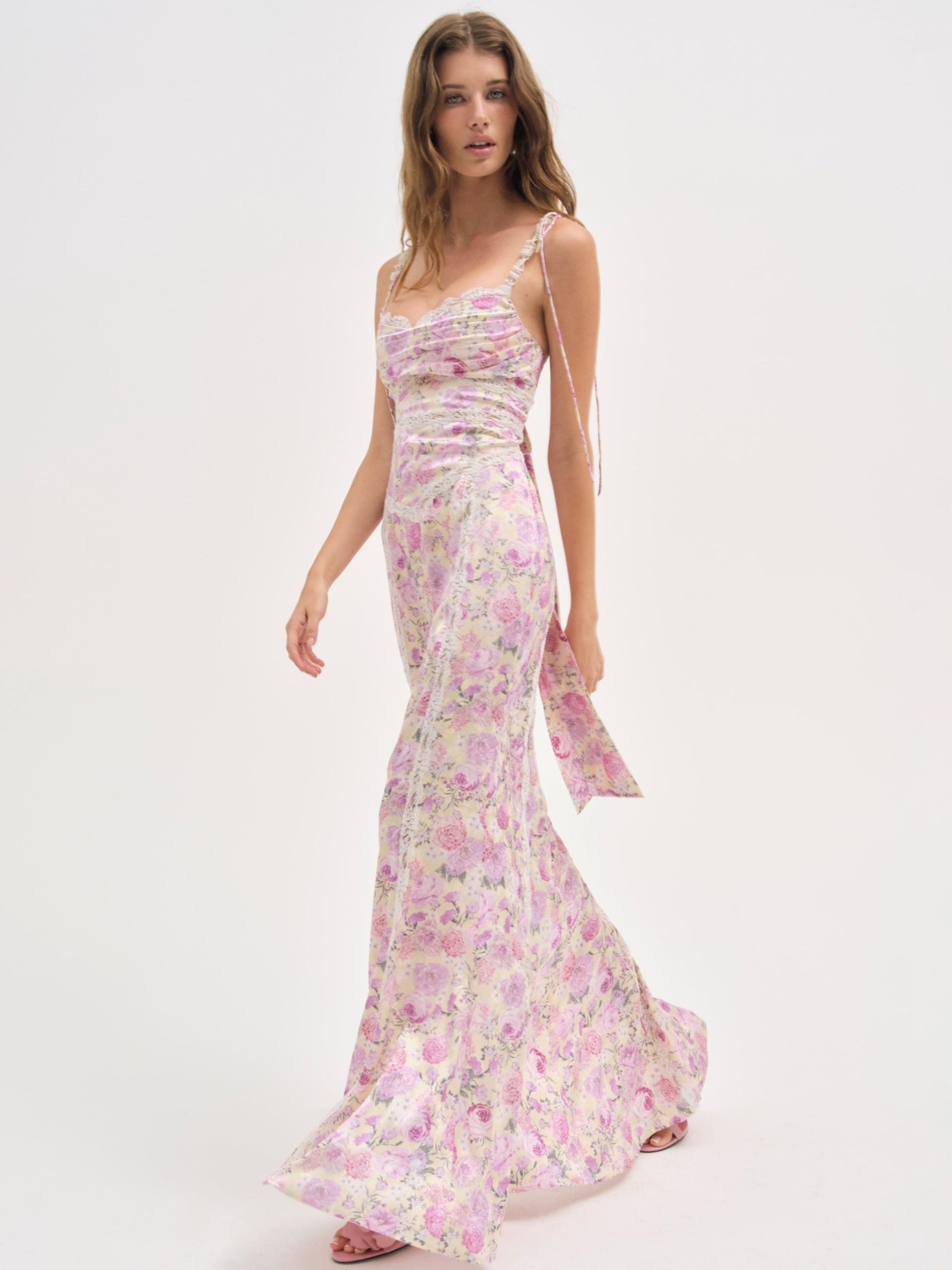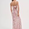 For your next sun-soaked escape, the Courtney floral maxi dress charms with its dreamy peony printed jacquard and lace fabrication. Crafted with a fitted bodice and flowing mermaid skirt, this satin maxi dress features a draped cowl neckline and a low open back with functional tie.