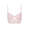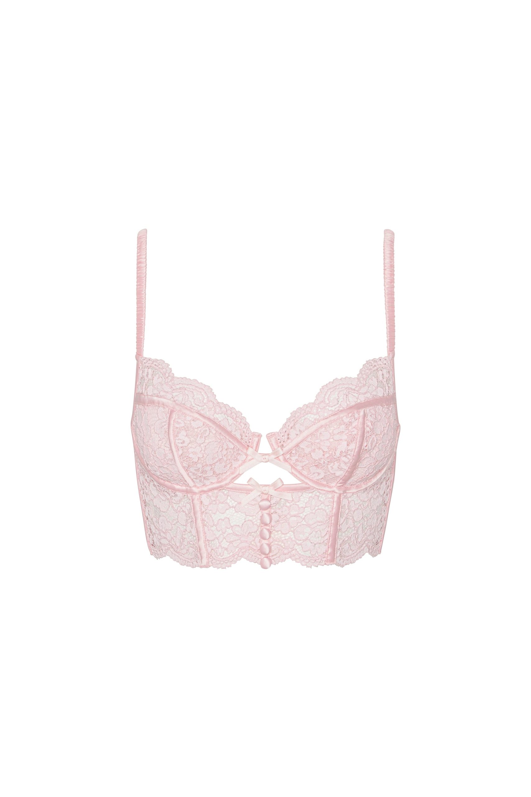 As sweet as a scoop of strawberry ice cream—this soft pink bustier serves up scalloped lace combined with pretty bows accents and satin-covered buttons. The keyhole cutout and strappy cage back add a racy edge.
