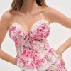 Fun, flirty, and floral, the Daisy Mae ruffled top is crafted in a romantic floral printed satin and adorned with eyelet lace trim. This floral crop top spotlights a halter neckline and a ruffled hem for a sweet silhouette.