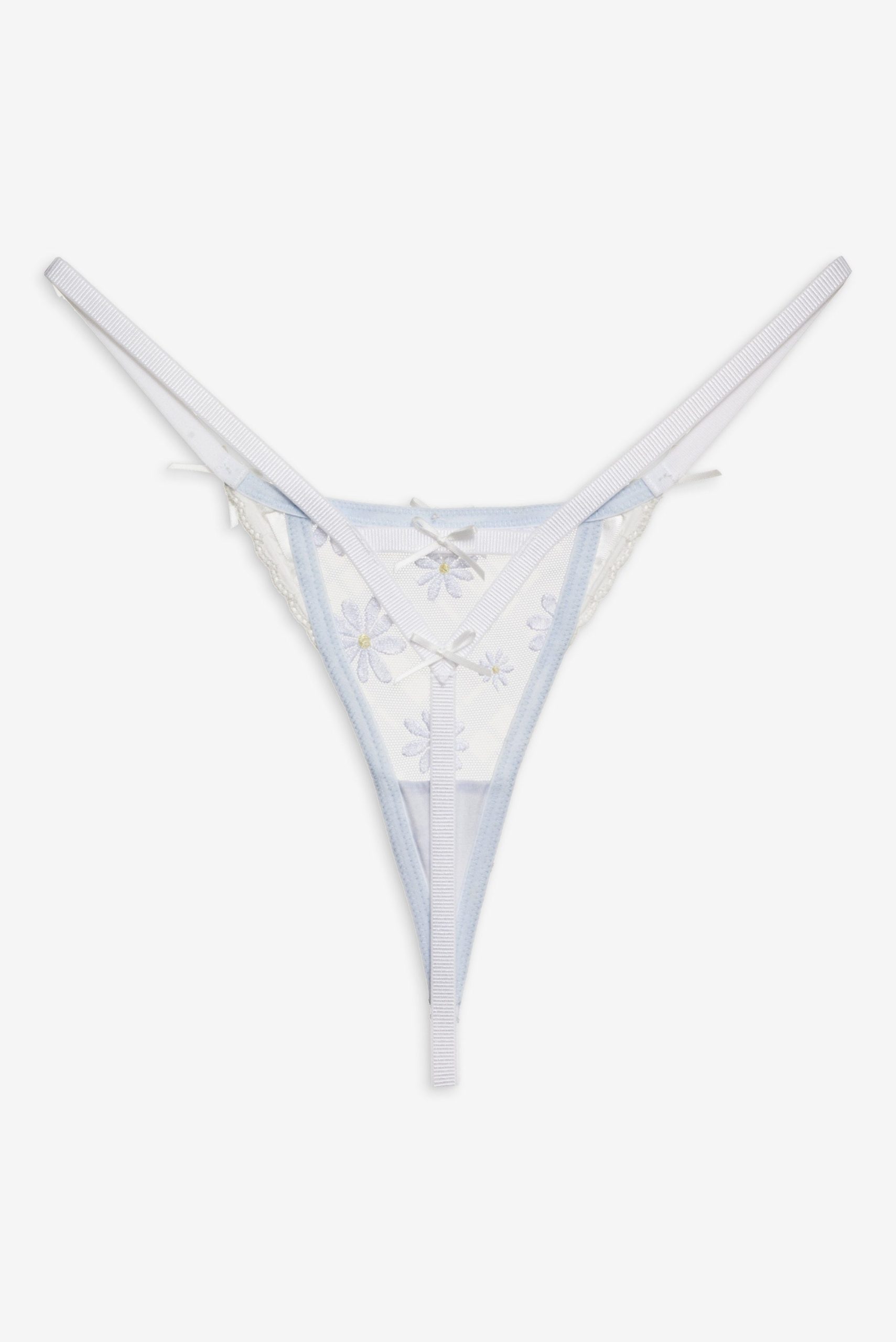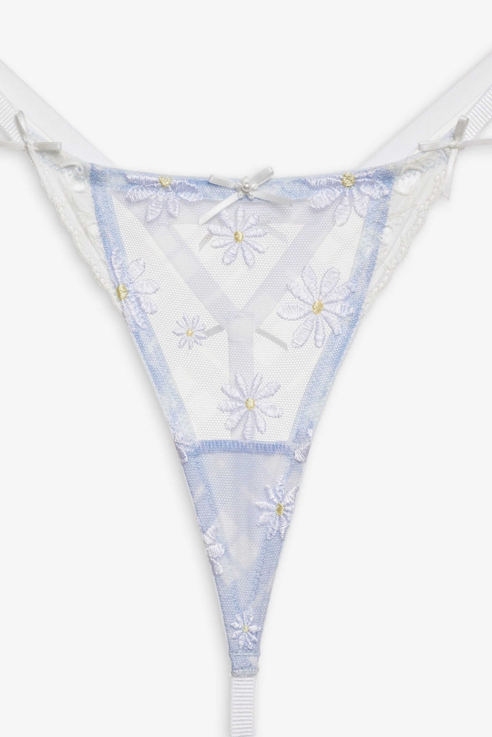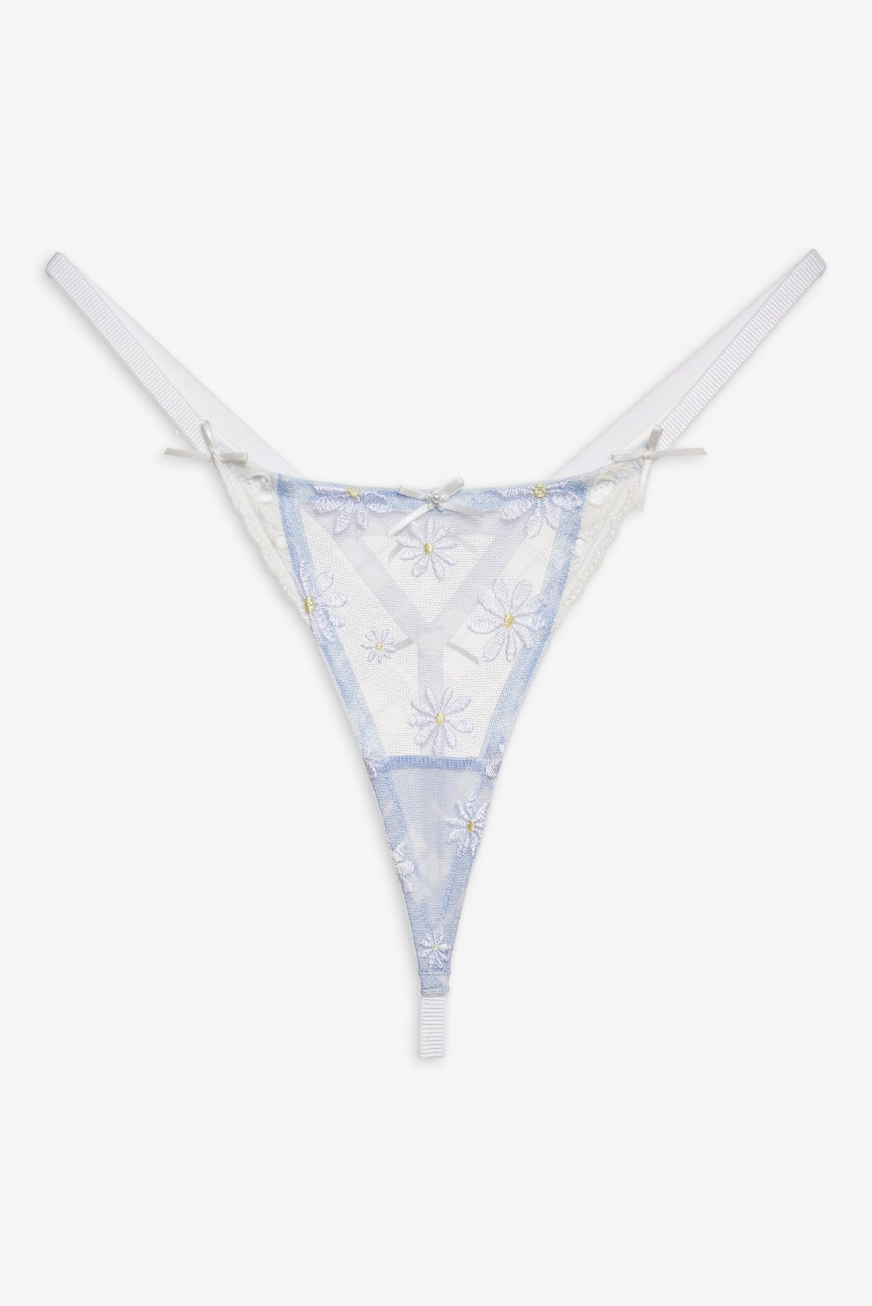 Feel fresh as a summer daisy in the Dee Dee blue thong—a printed mesh g string with an eyelet ribbon trim, grosgrain elastic, and skinny ribbon bows. Pair it with the Dee Dee Underwire Bra for the full lingerie set.