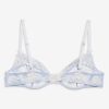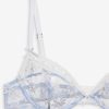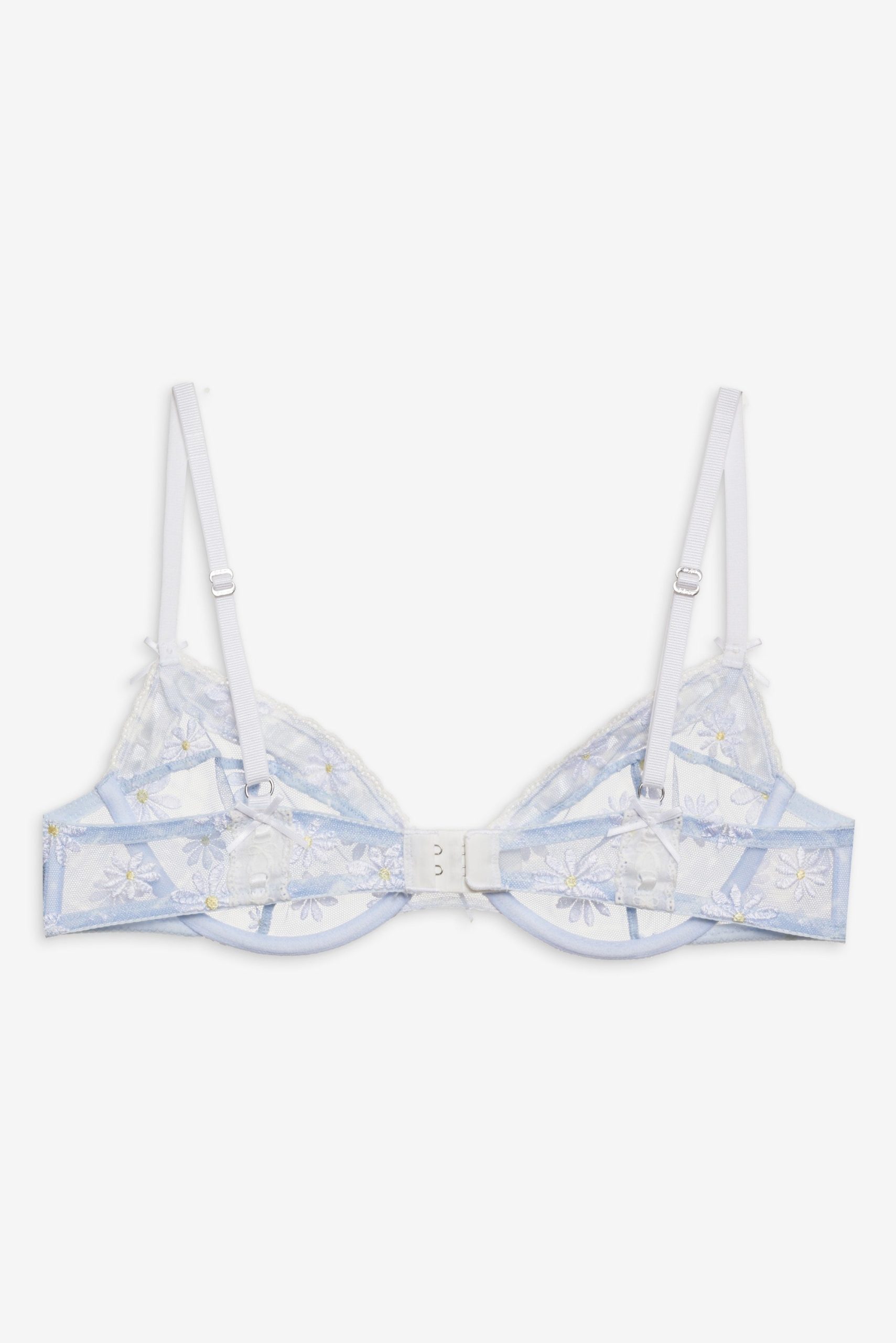 Feel fresh as a summer daisy in the Dee Dee blue underwire bra—an embroidered bra crafted in printed mesh featuring an eyelet ribbon trim, grosgrain elastic, and skinny ribbon bows. Pair it with the Dee Dee Thong Panty for a matching lingerie set.