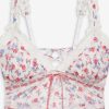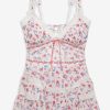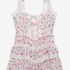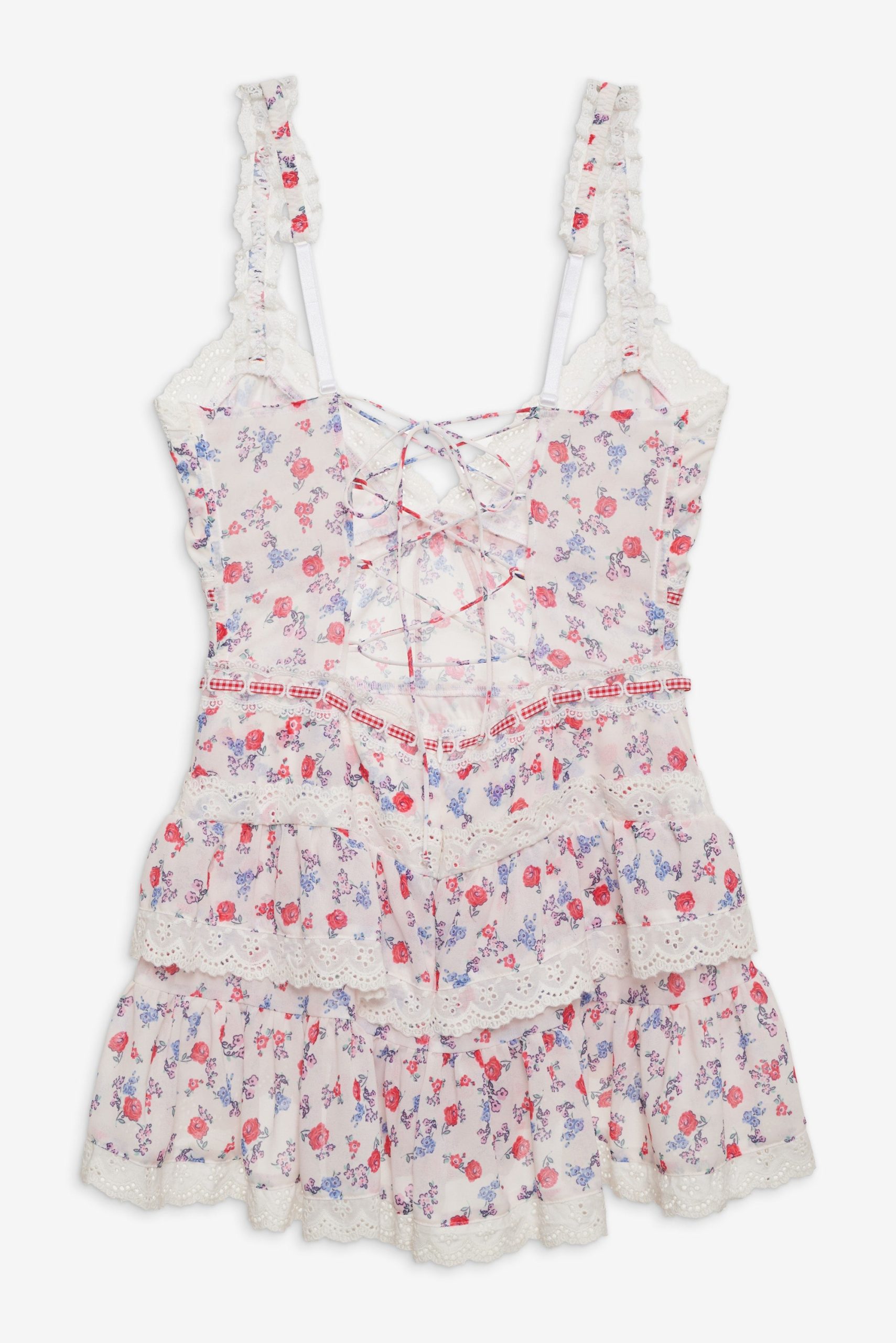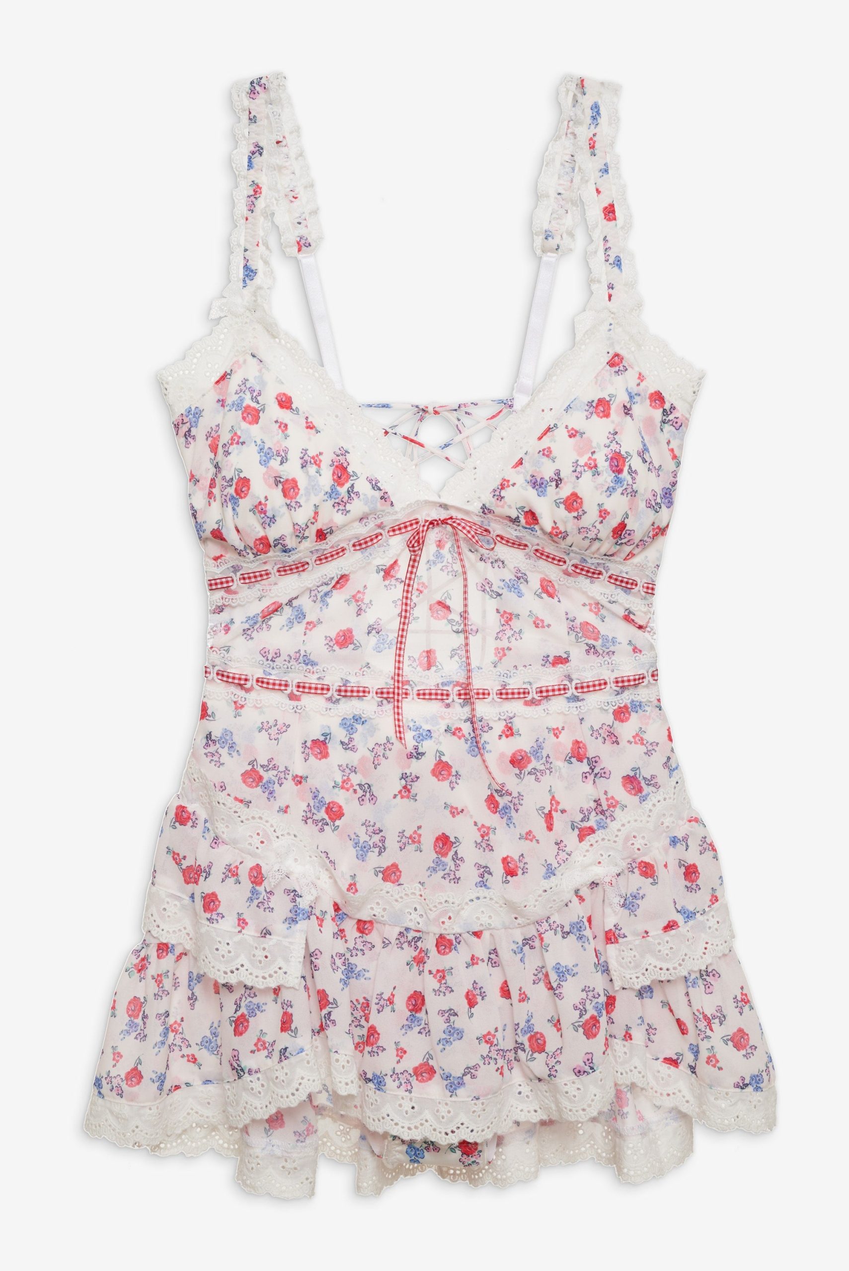 Celebrate the wild beauty of nature with the Ditsy Day floral mini dress. Crafted in a romantic floral print, this ruffled mini dress is adorned with delicate eyelet lace trims, dainty slotted trims with gingham ribbon, and decorative bows throughout. This short dress features triangle cups and a tiered ruffle skirt.