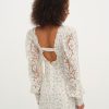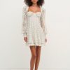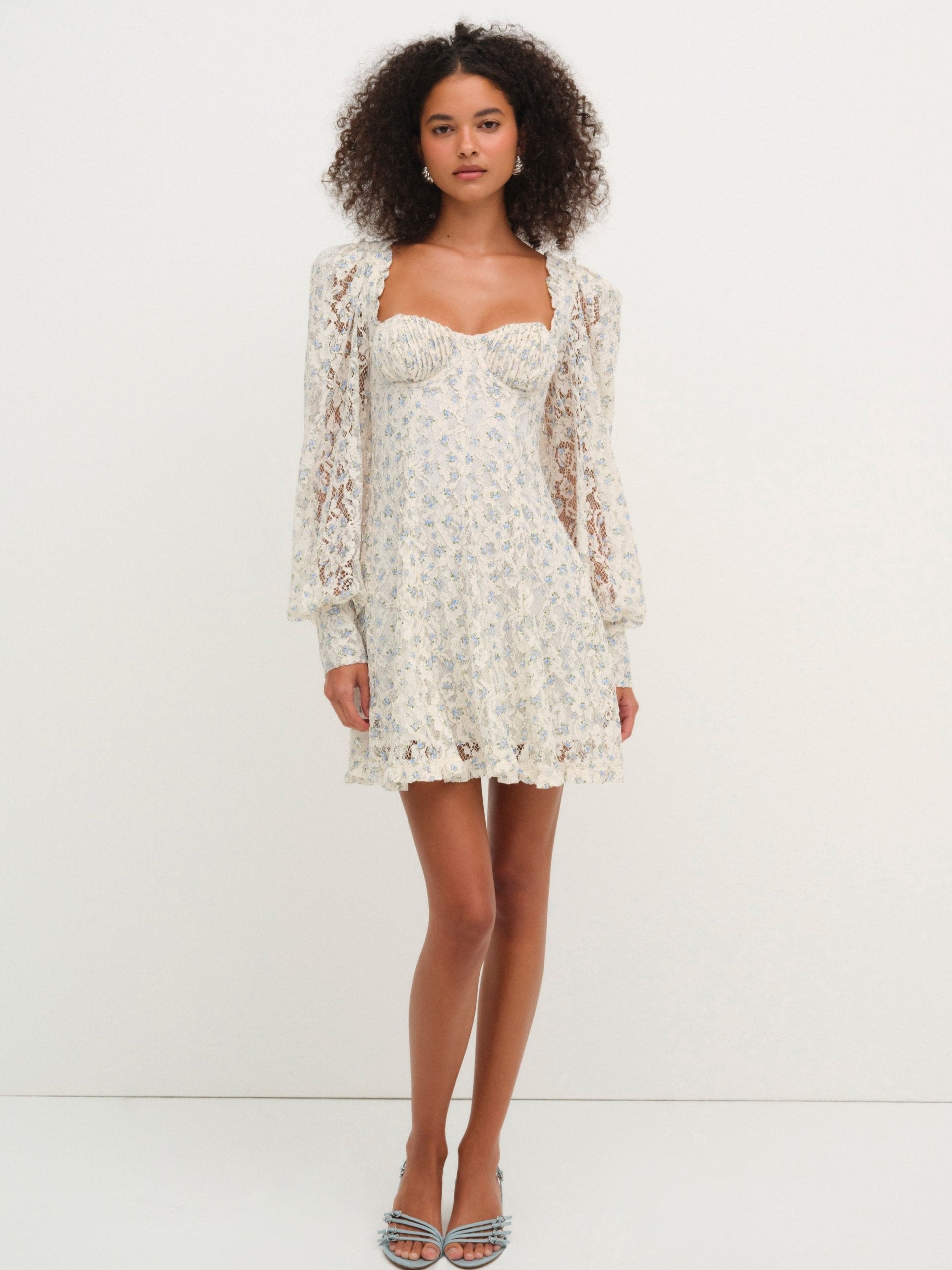 Designed for the exquisite Muse, the Donna blue mini dress is crafted in an allover printed floral lace. With its pintucked underwire cups, long sleeves, and paneled skirt—this lace mini dress cuts an ultra-romantic silhouette.