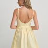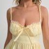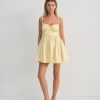Made for the sun-drenched muse, the Doris mini dress embodies pure femininity. Crafted in a crisp pastel taffeta, this yellow mini dress is adorned with lace trims, and spotlights a ruched bust and center front bow detail.