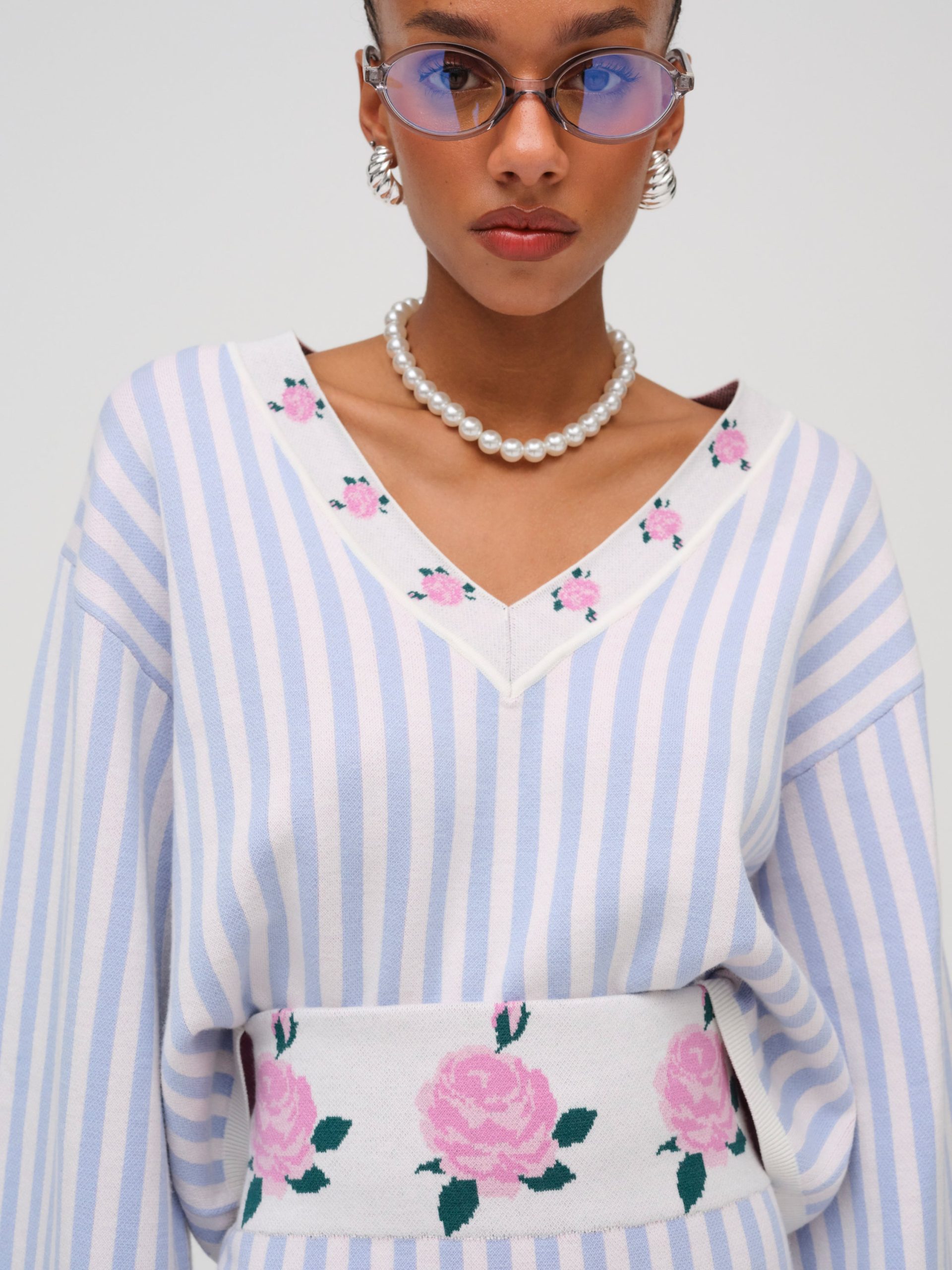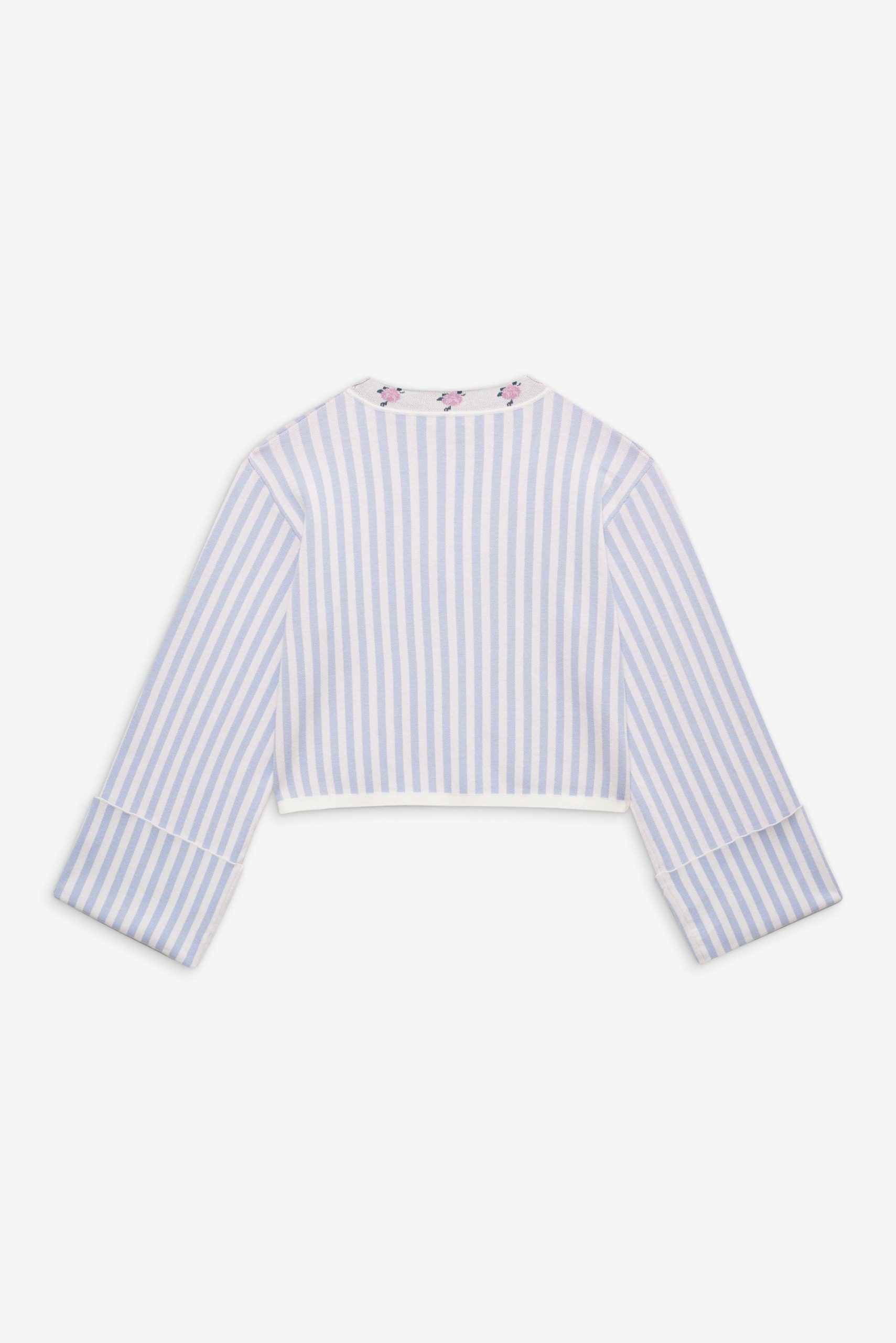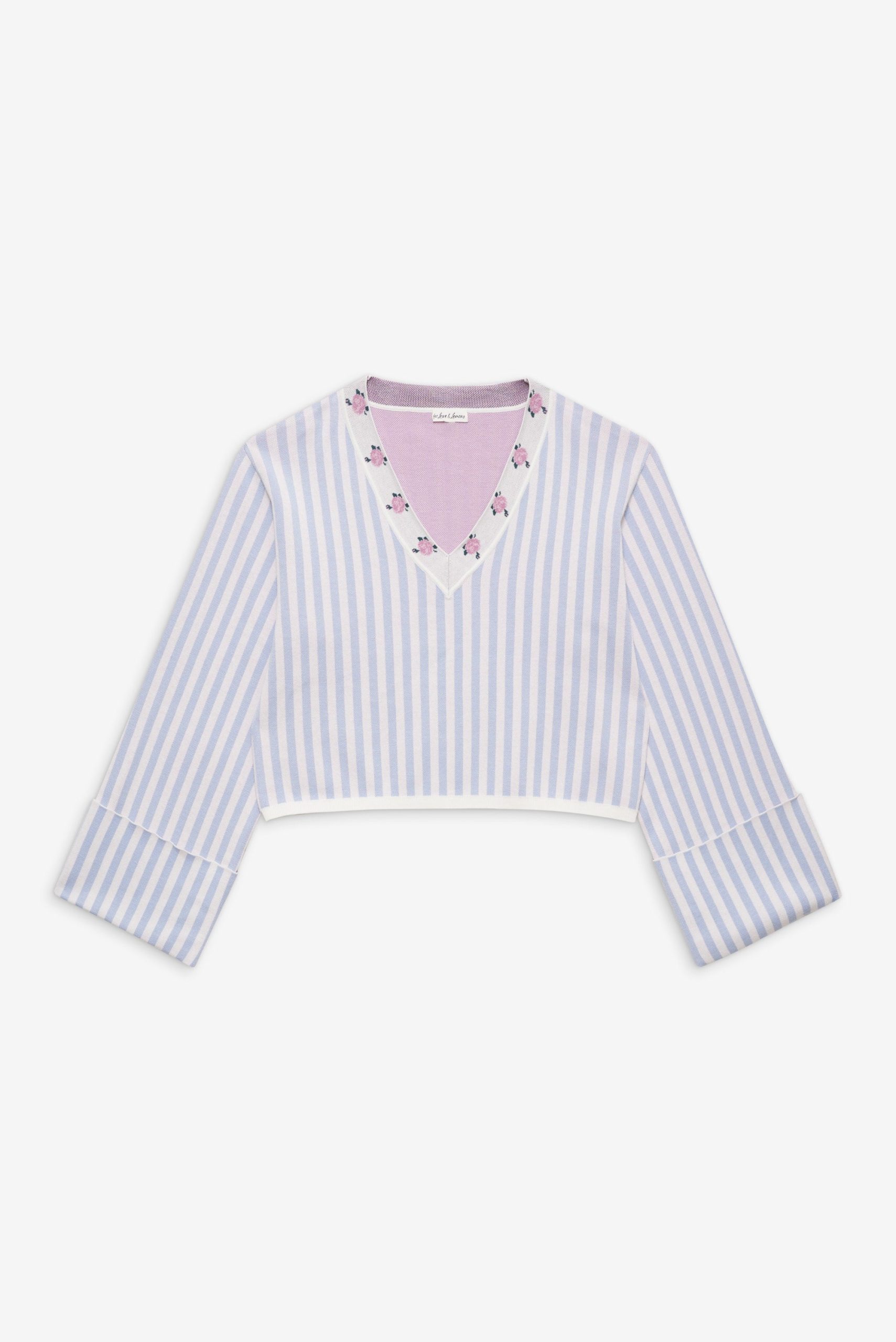 Inspired by vintage feminine charm of eras past, the Edie Jacquard striped knit sweater makes a chic and preppy spring statement. This oversized sweater spotlights a classic contrast floral V-neckline, wide flared sleeves with a fixed cuff at openings, and ribbed finished edge along hem.