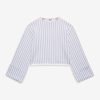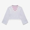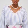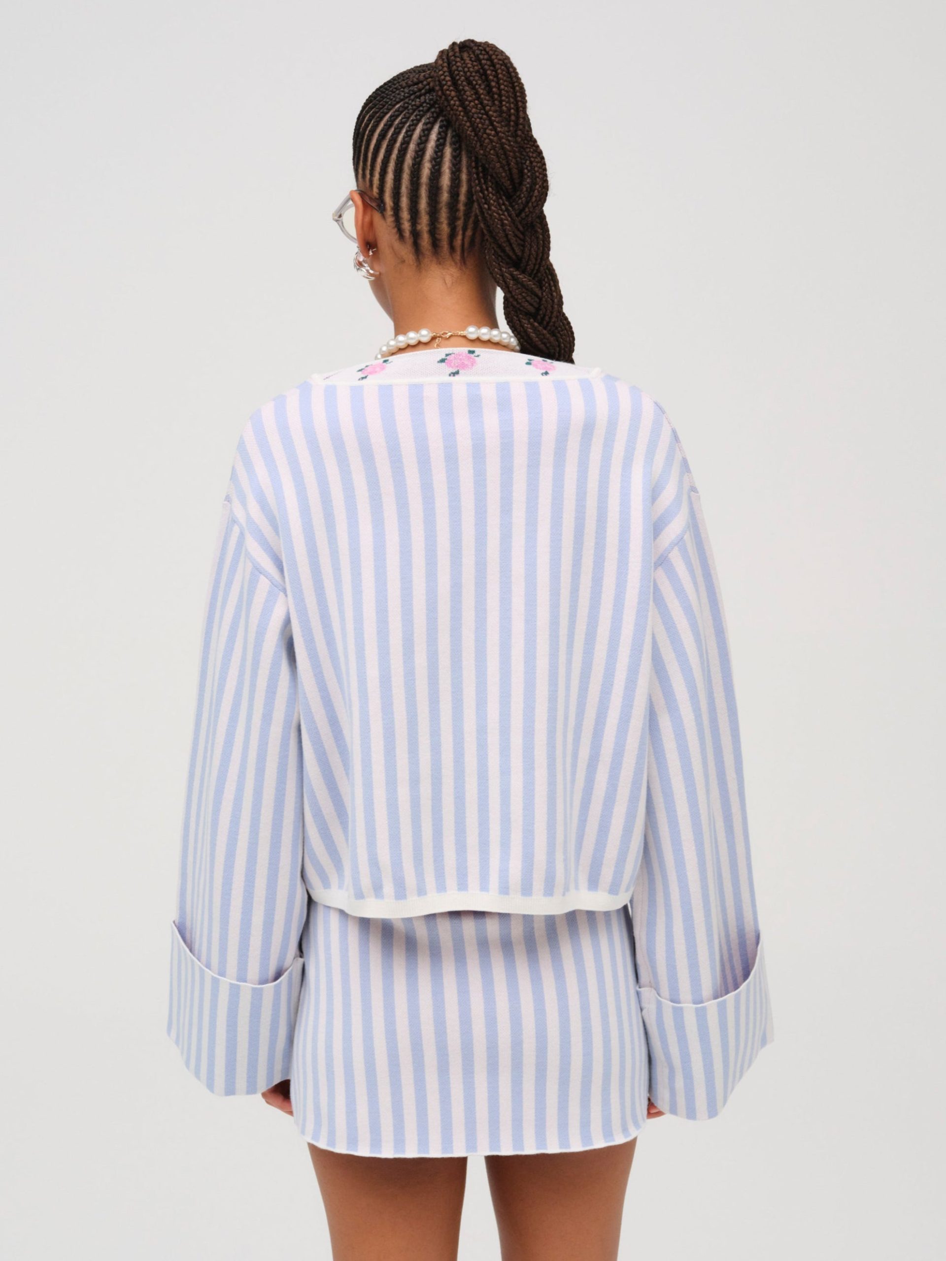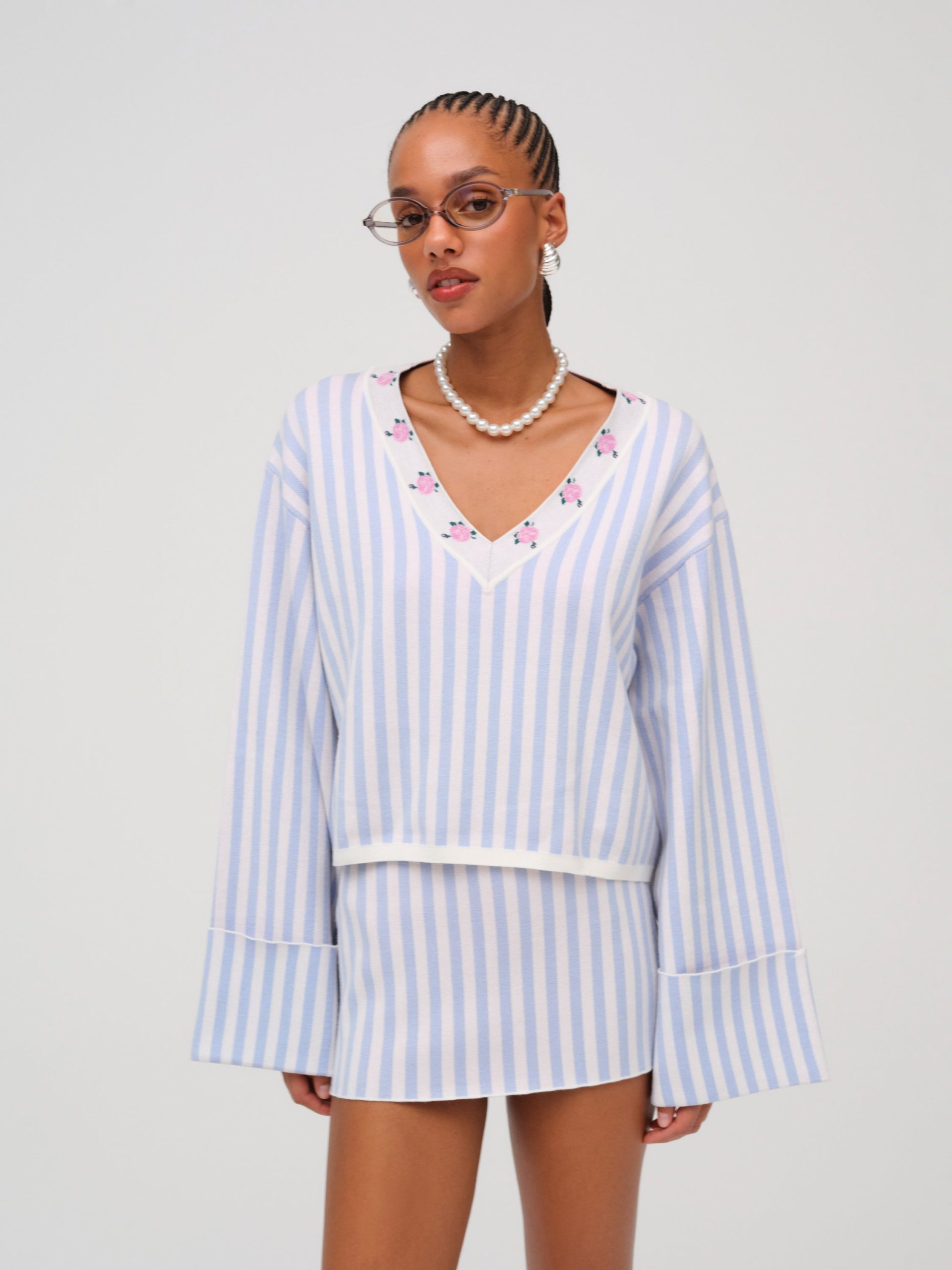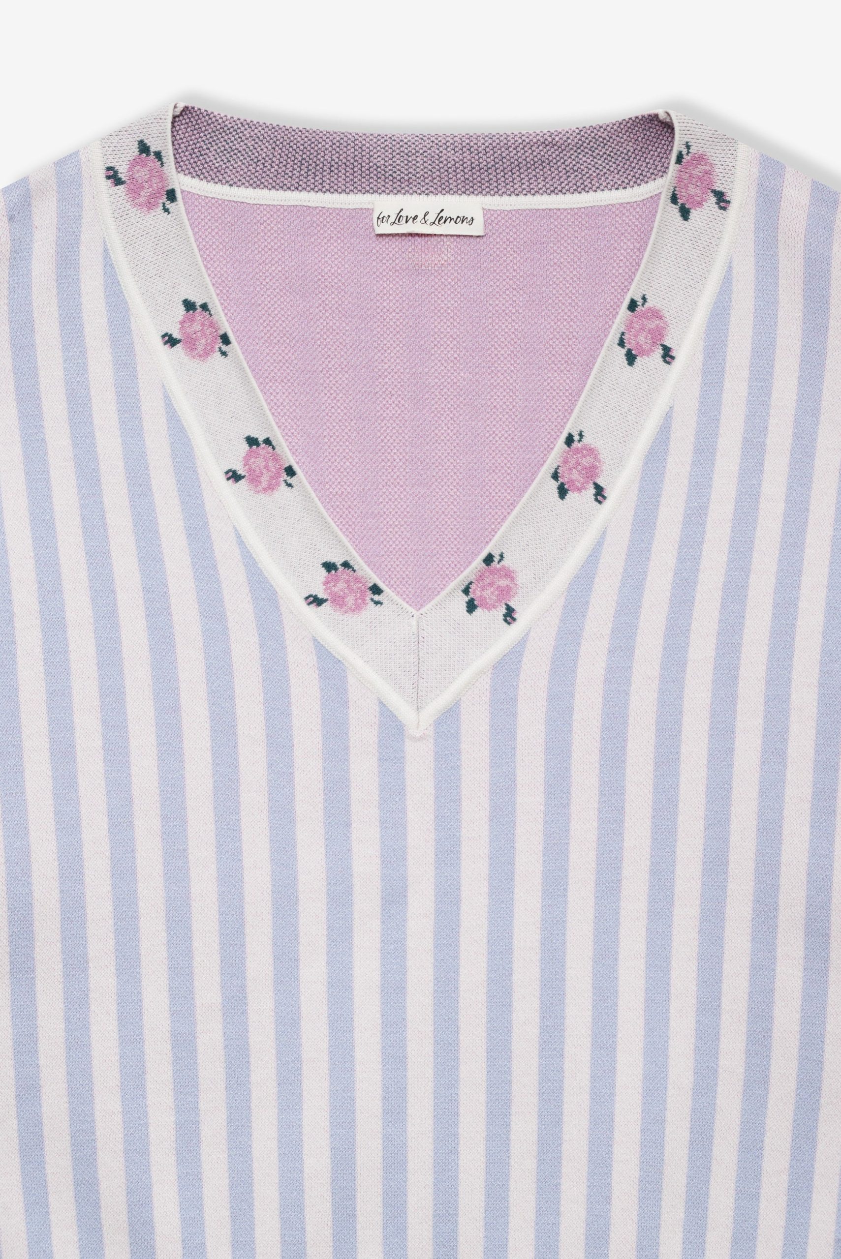 Inspired by vintage feminine charm of eras past, the Edie Jacquard striped knit sweater makes a chic and preppy spring statement. This oversized sweater spotlights a classic contrast floral V-neckline, wide flared sleeves with a fixed cuff at openings, and ribbed finished edge along hem.