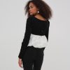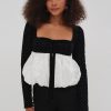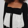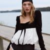 The Elisa black and white long sleeve top features a black velvet bodice with a contrast white eyelet taffeta bubble hem. Decorated with a chic velvet ribbon tie at the neckline, this bubble top is the perfect piece to pack for holiday weekends away.