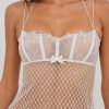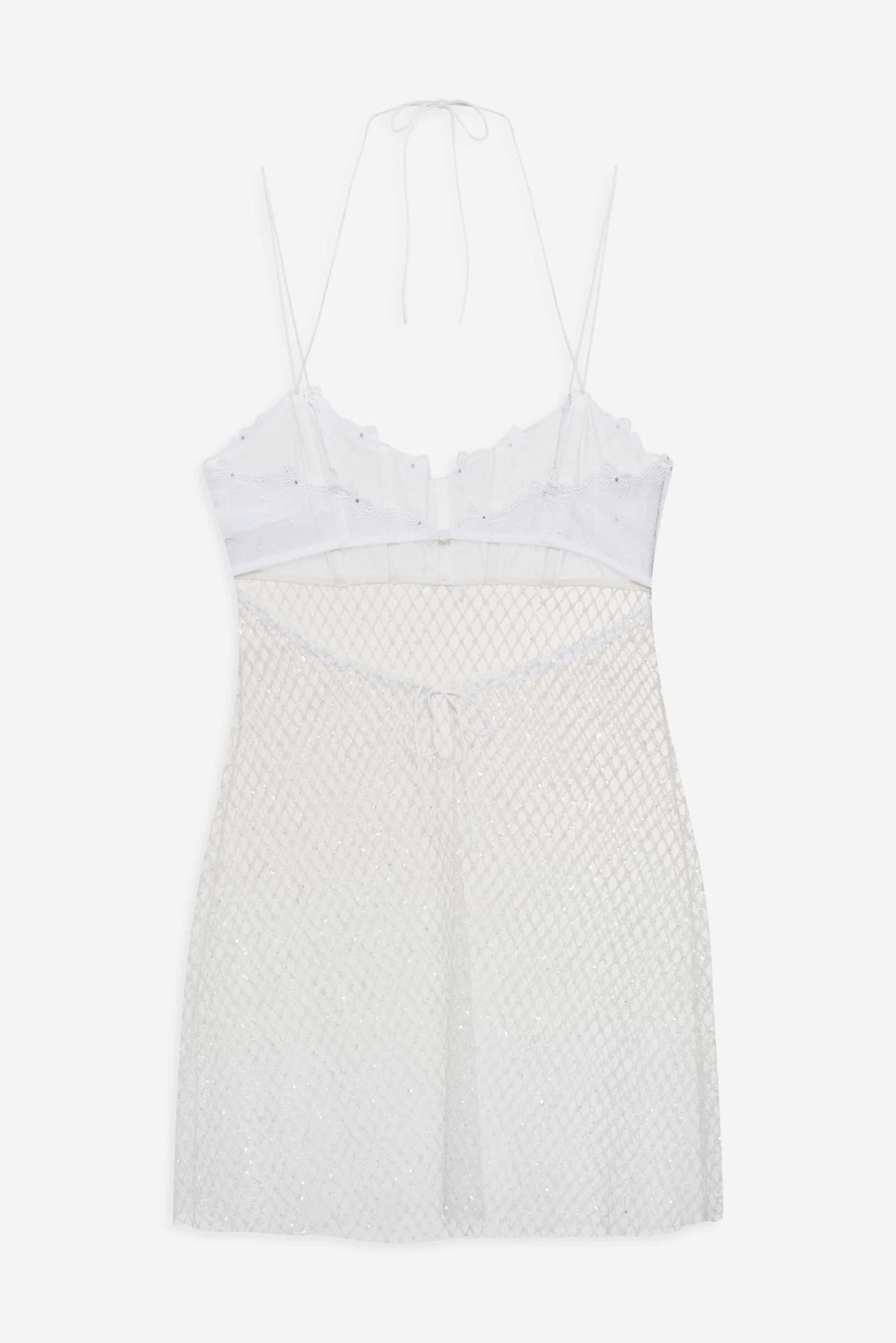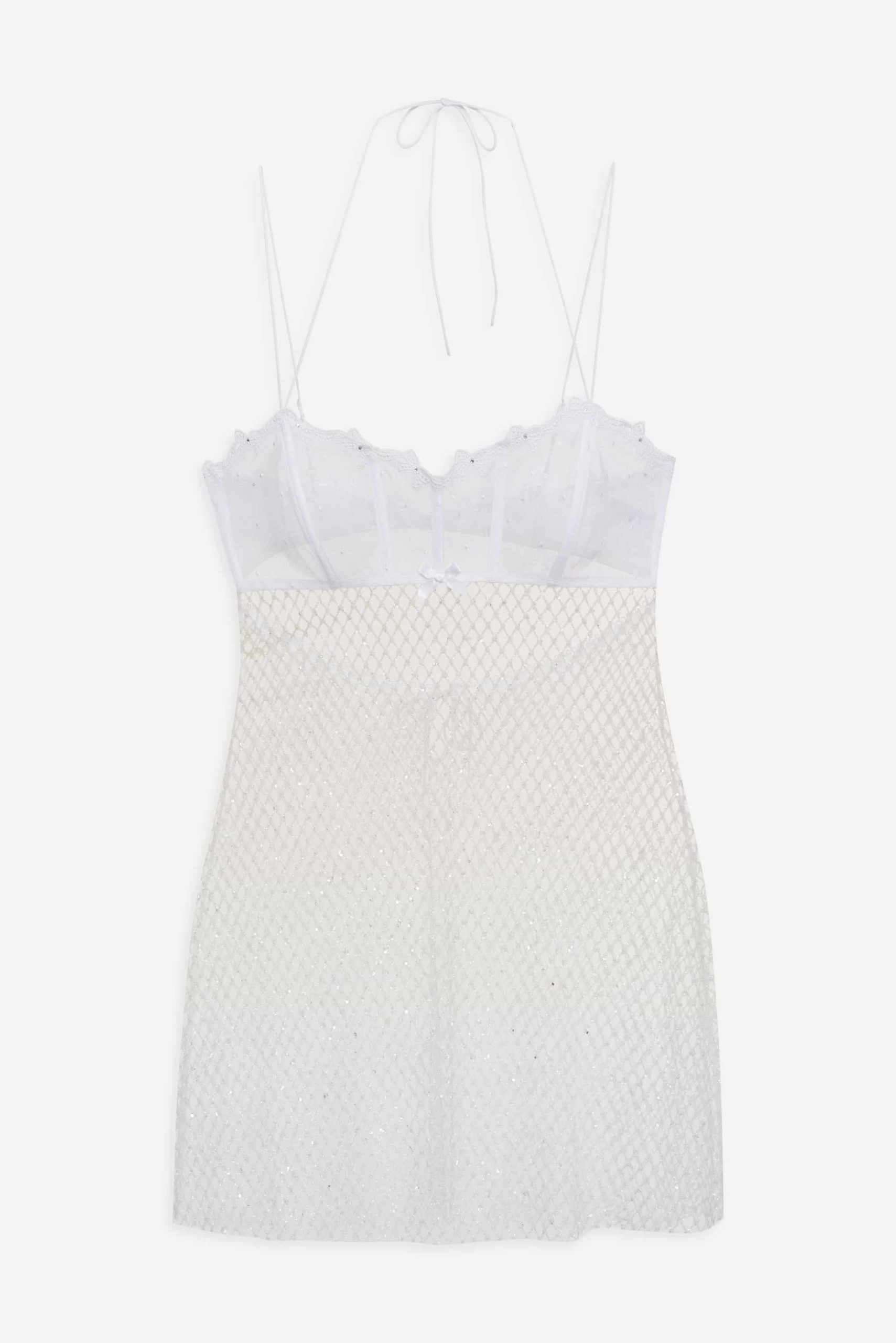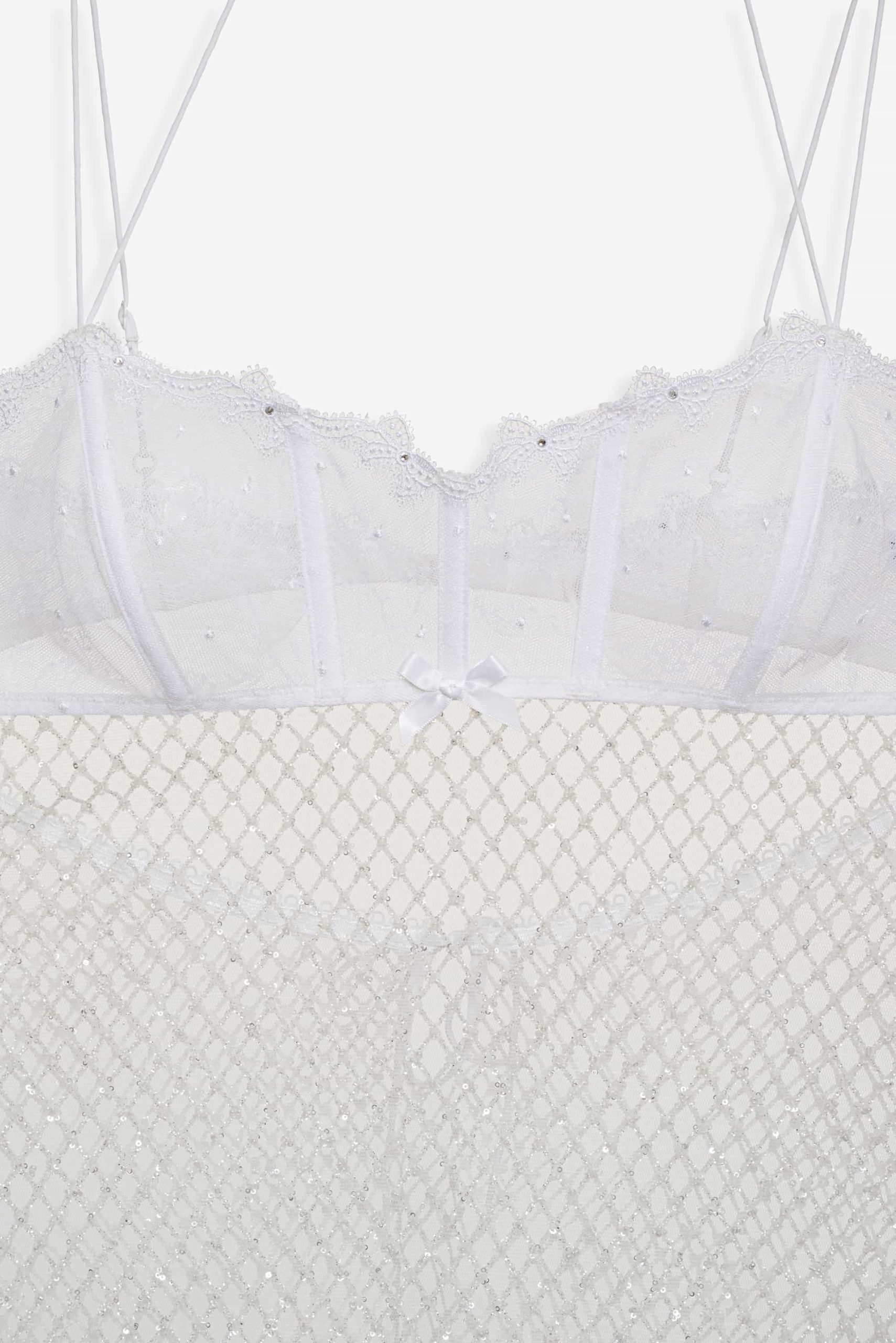 An ultra-sexy take on our best-selling Glitter Slip Dress—the Ellery white slip dress has charming bow embroidery at the bust with corset panel detailing. This mini slip dress also features a sheer skirt with a glitter grid design that shimmers just like winter ice.