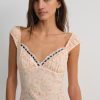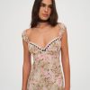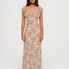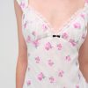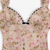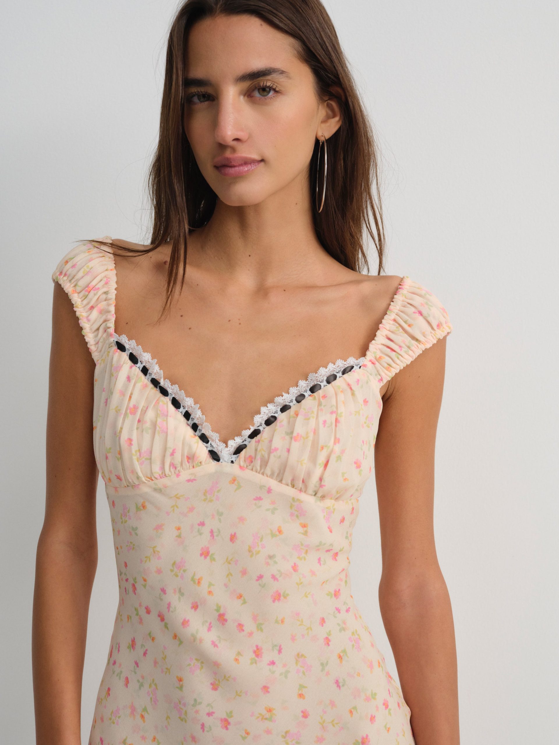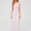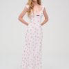 Designed for a seaside romance, the Emmaline floral maxi dress charms with its ultra-romantic dainty floral print. Crafted in a light chiffon, this white maxi dress features ruched cups with an alluring ribbon lace trim at the sweetheart neckline.