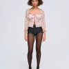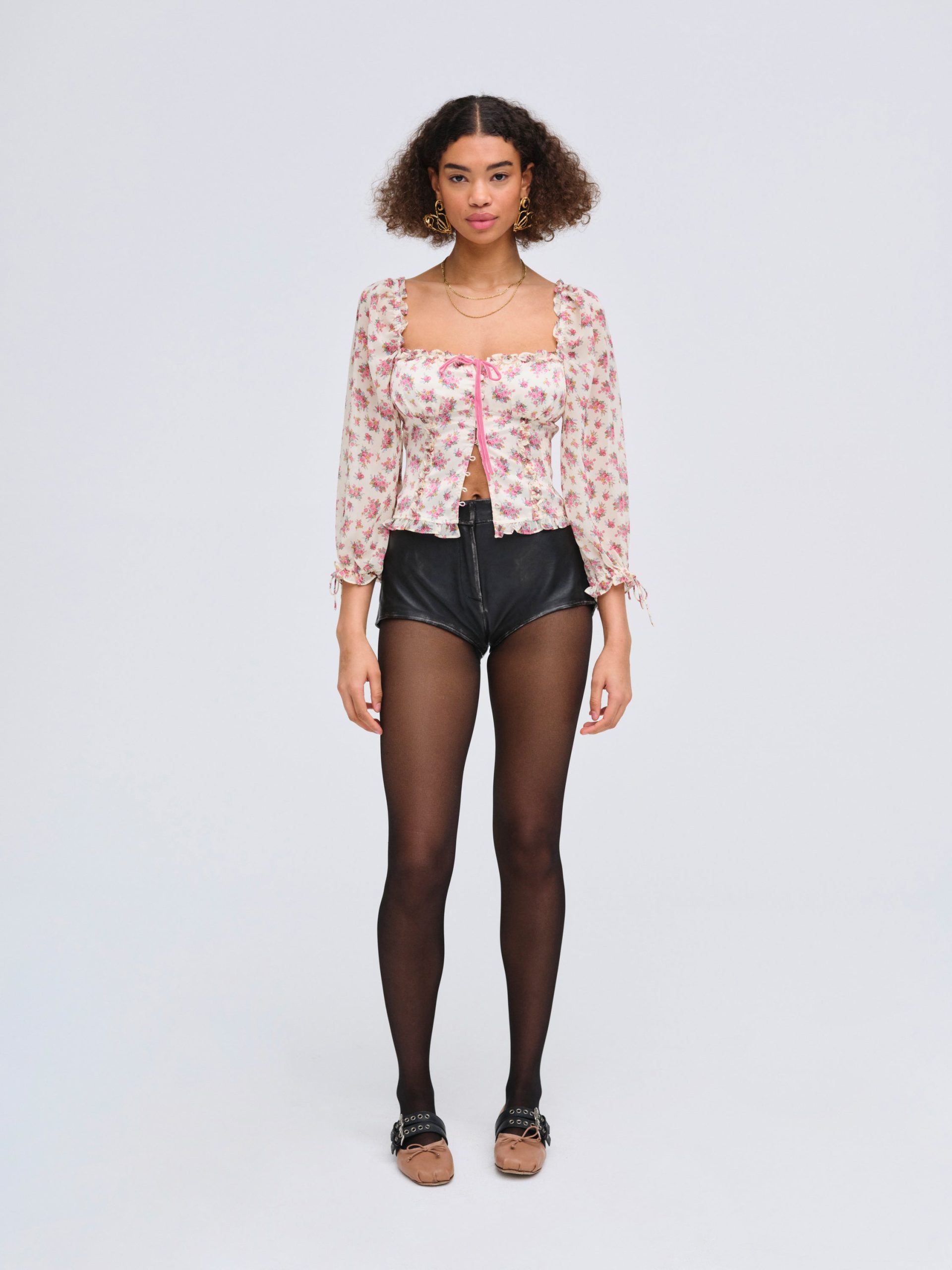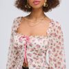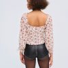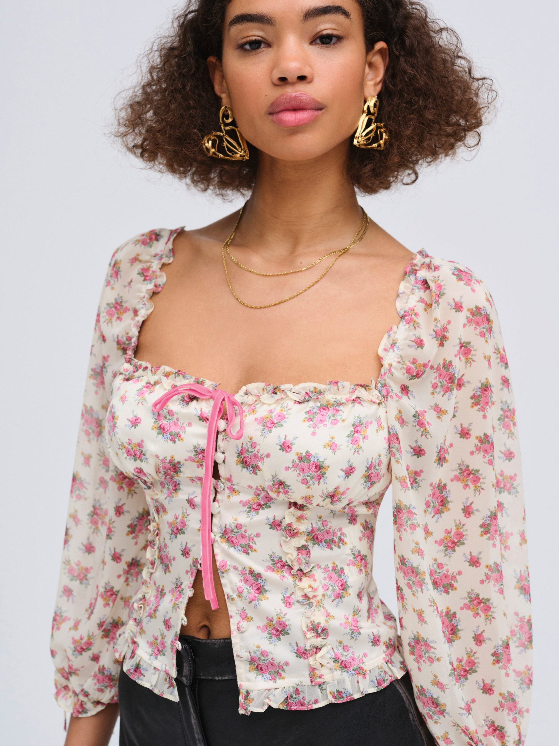 Discover a world of soft pastels and picturesque floral prints with the Etienne pink top—a three-quarter sleeve floral blouse crafted in satin with contrast chiffon sleeves and ruffle trims. This vintage-inspired style also features a shirred bodice with a decorative center-front bow.