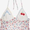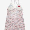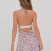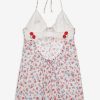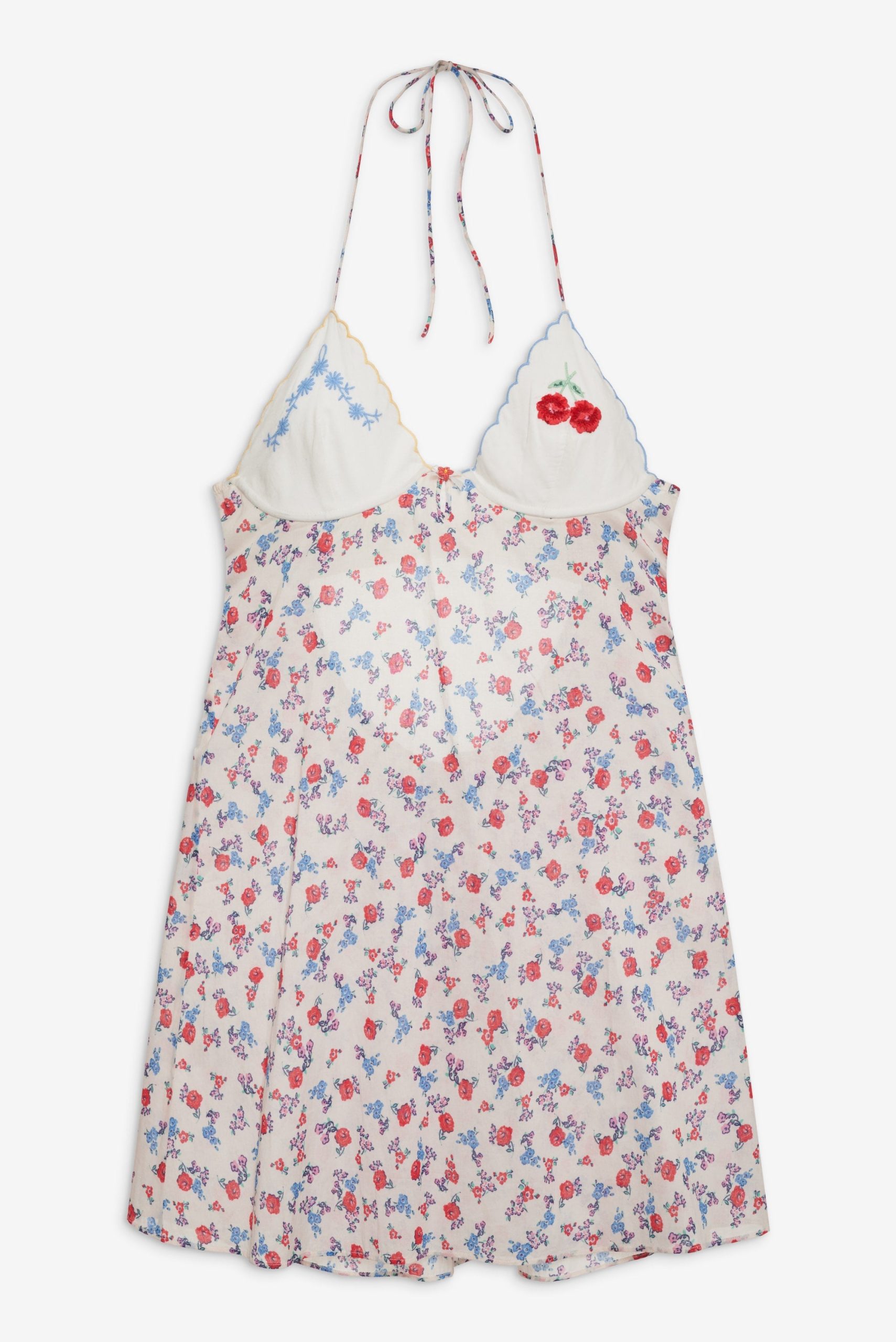 The Forget-Me-Not floral slip dress was made for the outdoor-loving Muse. This halter mini dress features underwire cups, a contrast scallop trim, floral embroidery, and a center-front daisy and bow appliqué