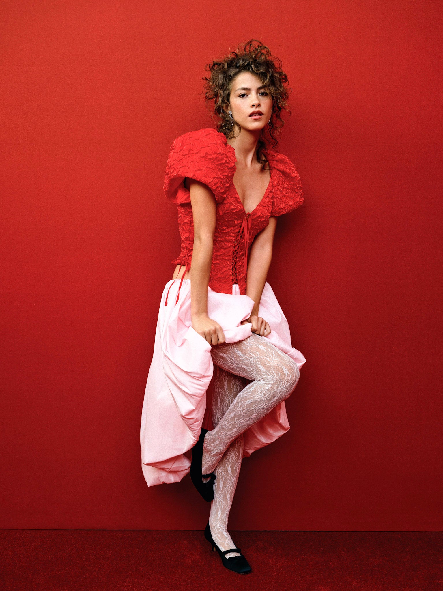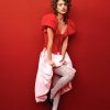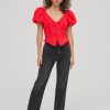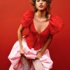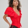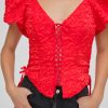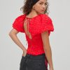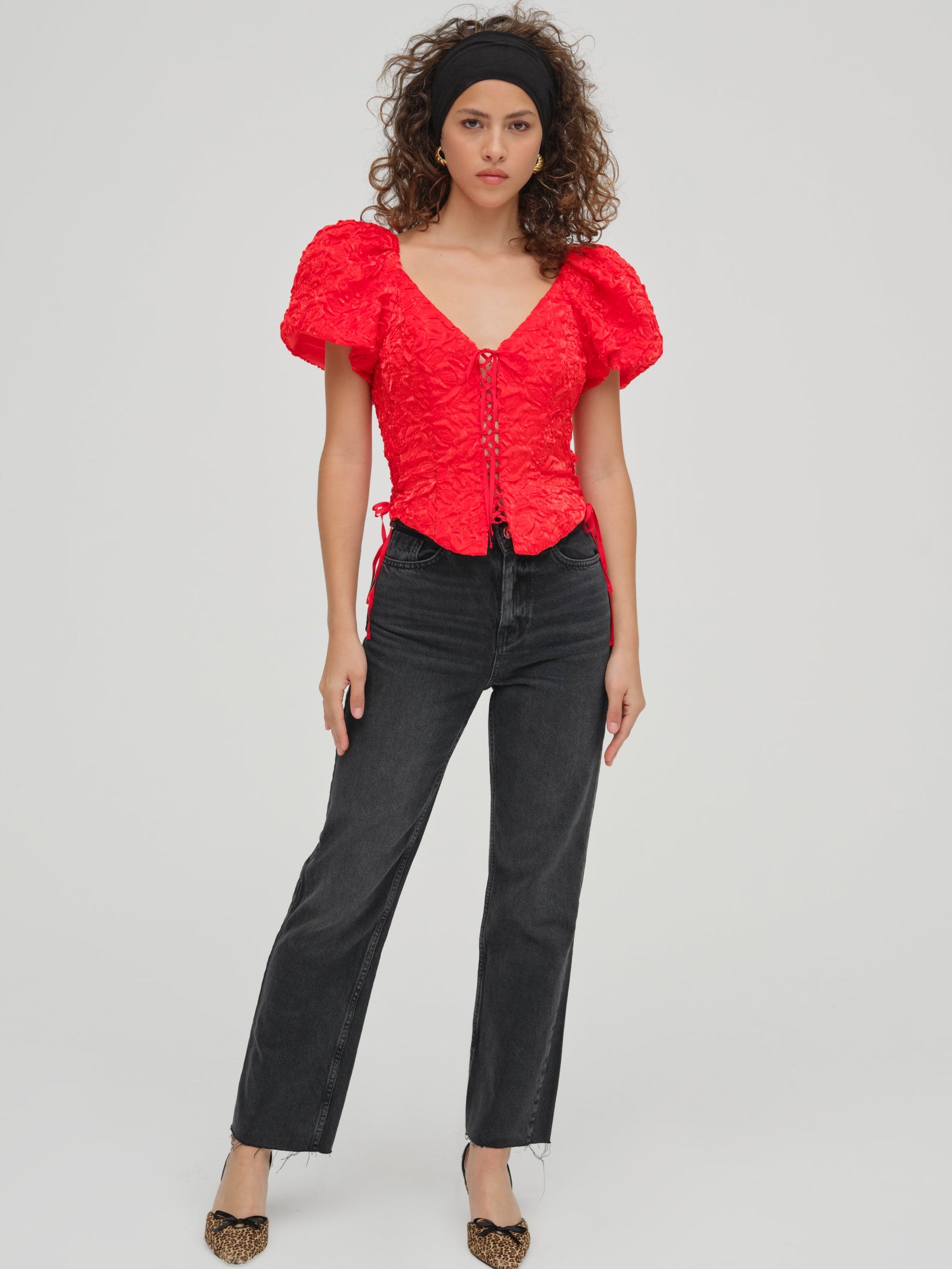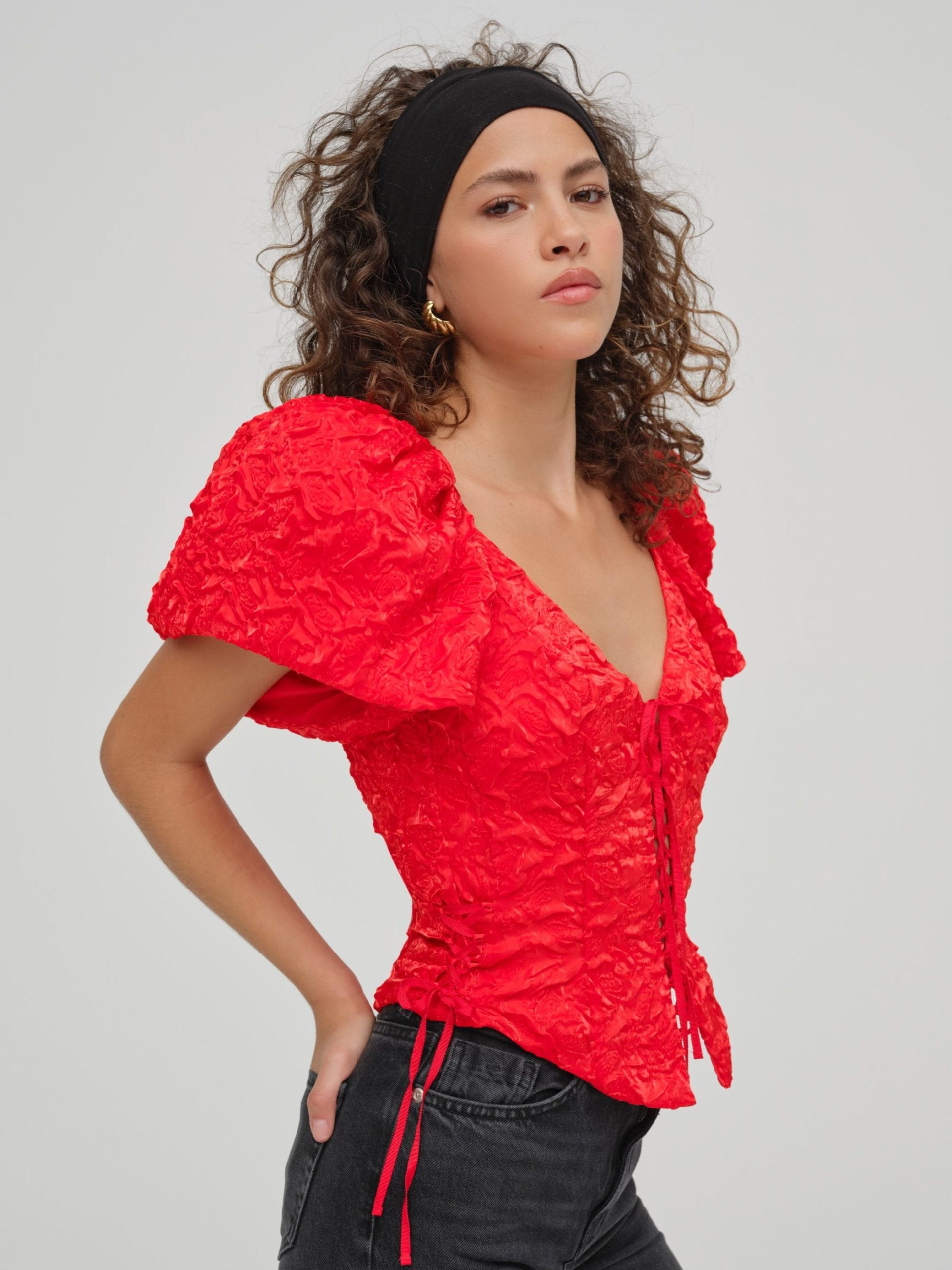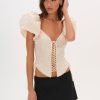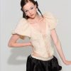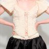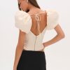 This Frosted Organza cream top is the perfect piece for the season’s festive dinners. Crafted in a beautiful textured organza, this puff sleeve top spotlights pleated short sleeves and functional corset-style lacing at the center-front and side seams.