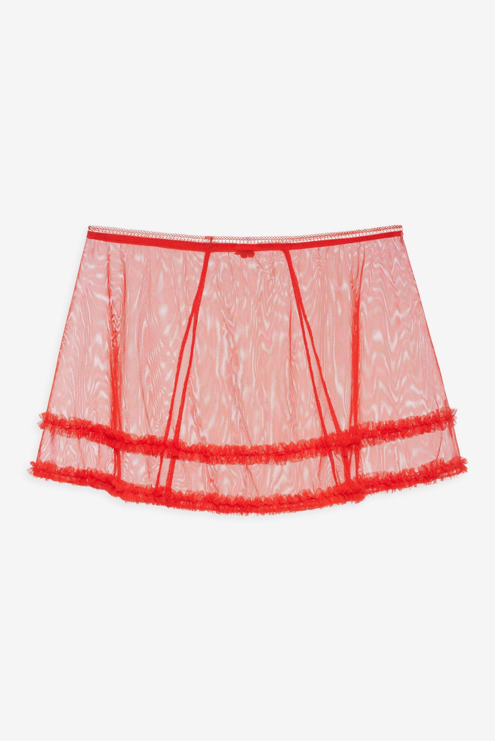 Make it a holiday to remember with the Gene red mini skirt and matching leg garter set. This slip skirt is cut to a high-waist with a slight flare through the skirt—it’s crafted in sheer chiffon and features ruffled trims and decorative rosettes. Pair it with the Gene Underwire Bra for a matching set.
