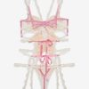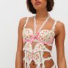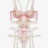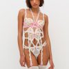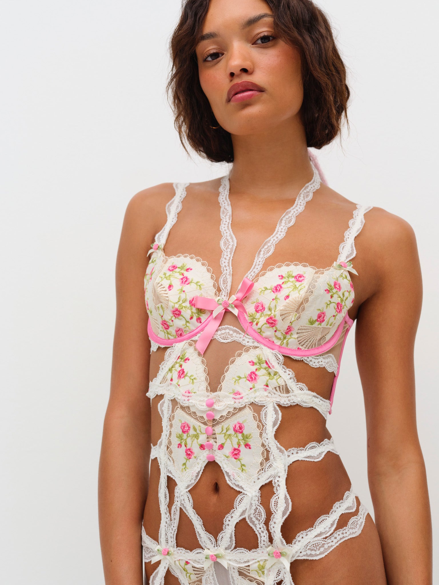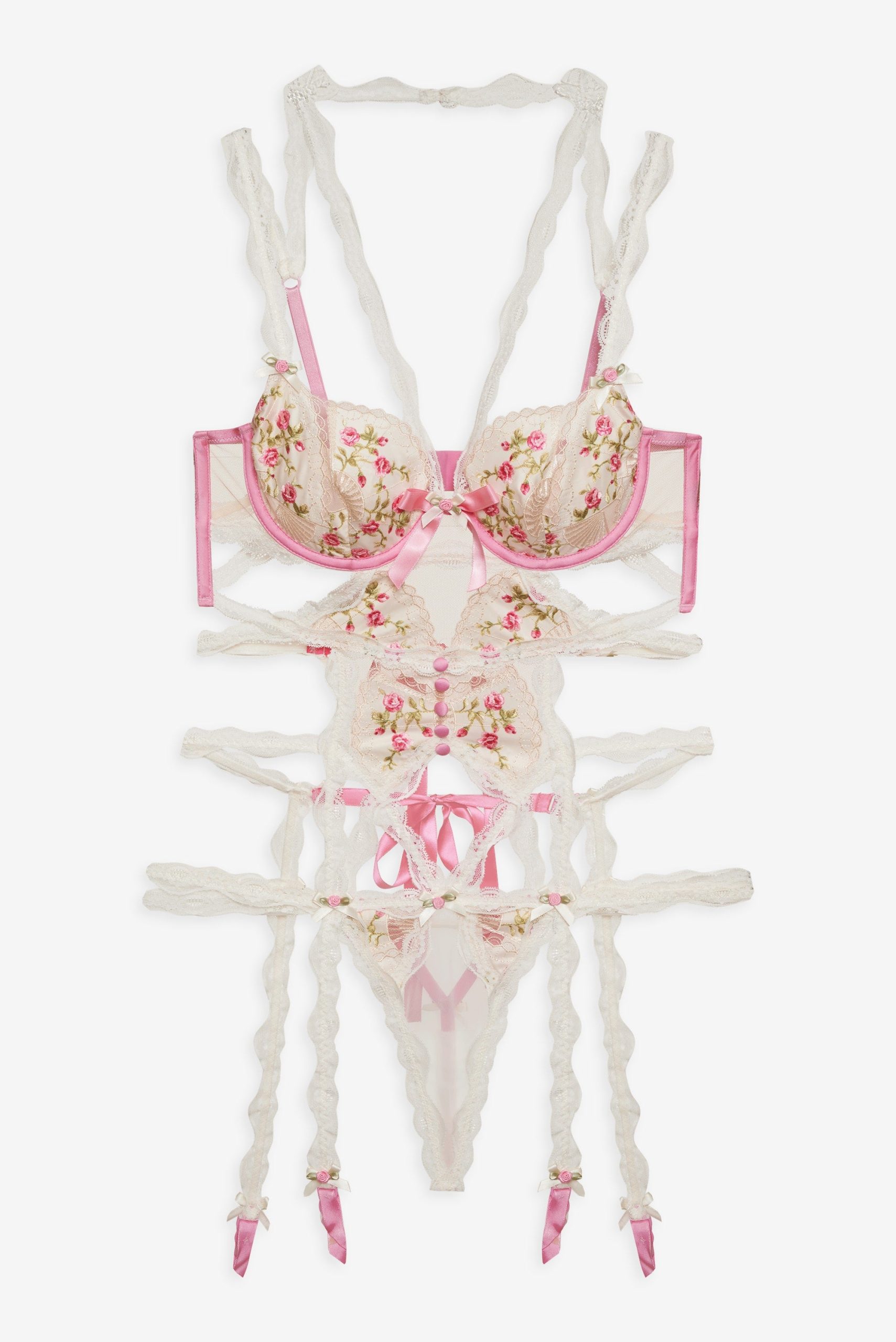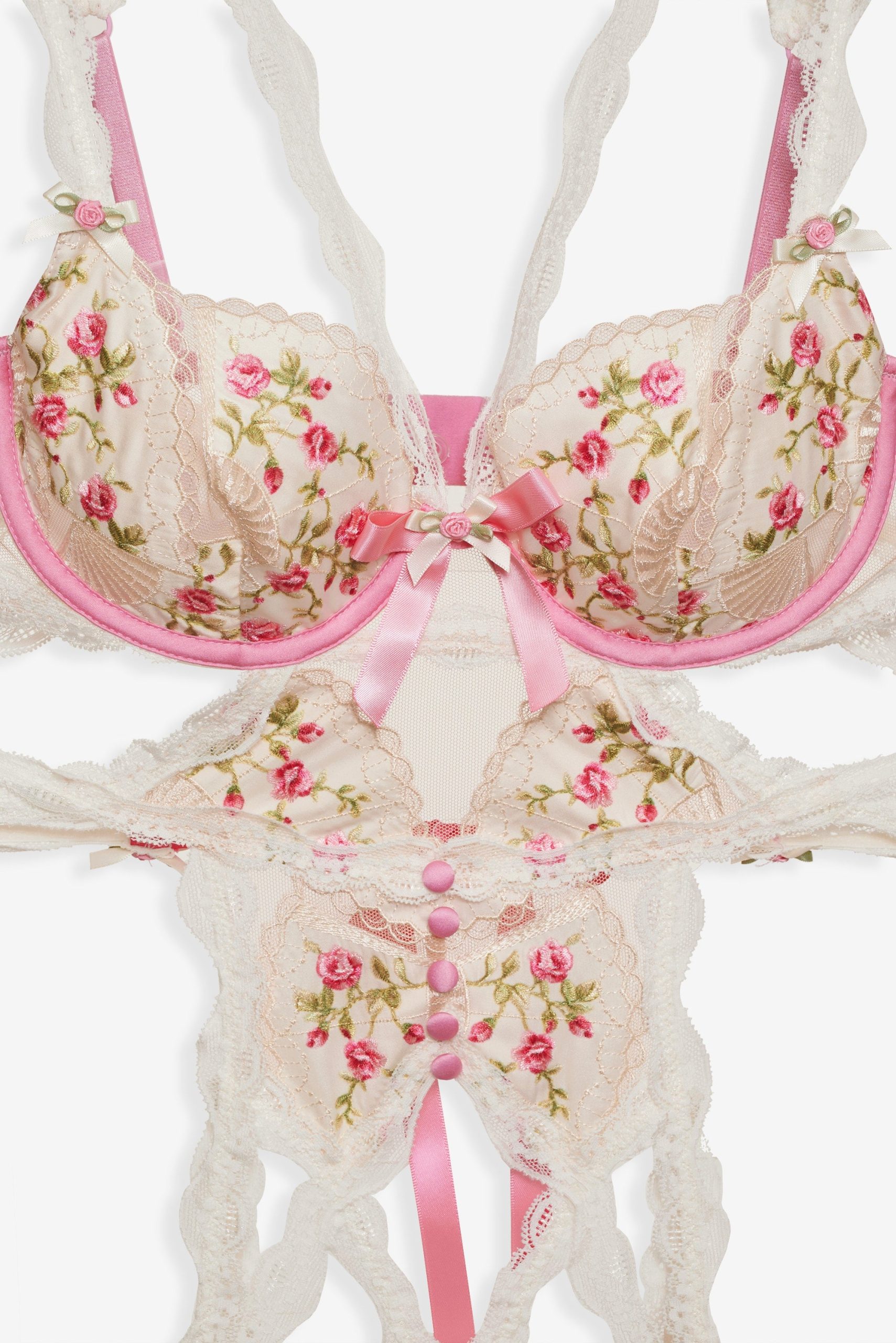 Get transported to a world of elegance with the Gretchen multi-colored teddy lingerie printed with allover florals. Featuring lace trims, contrast satin, and embroidery inspired by antique fans, this bodysuit exudes an old-world charm.