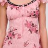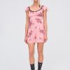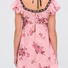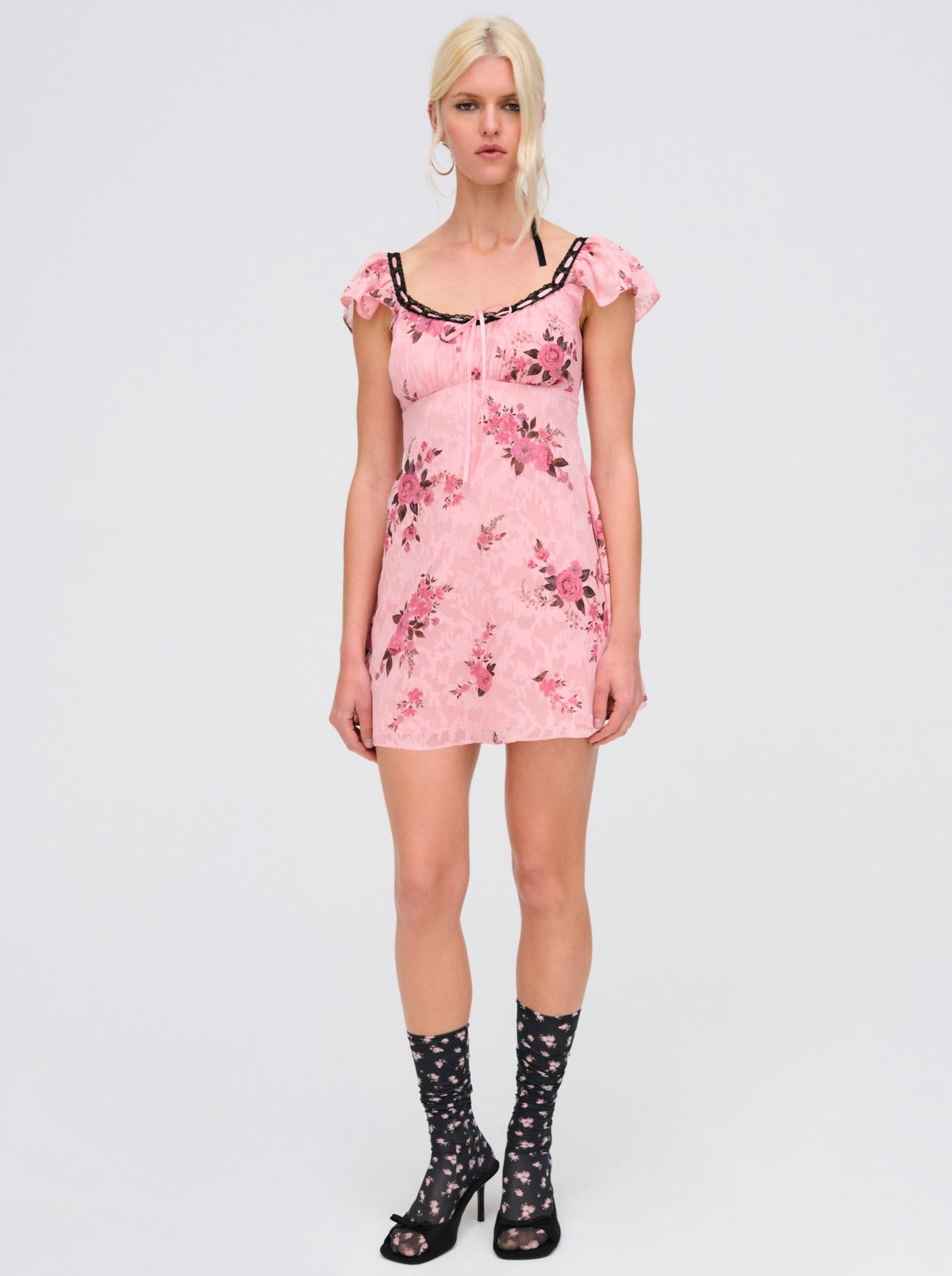 Designed for the hopeless romantic, the Guinevere pink mini dress is inspired by vintage floral dresses. Rendered in an allover floral print, this short dress features a wide scoop neckline, flutter cap sleeves, and trims with slotted ribbon and lace.