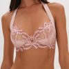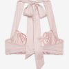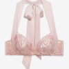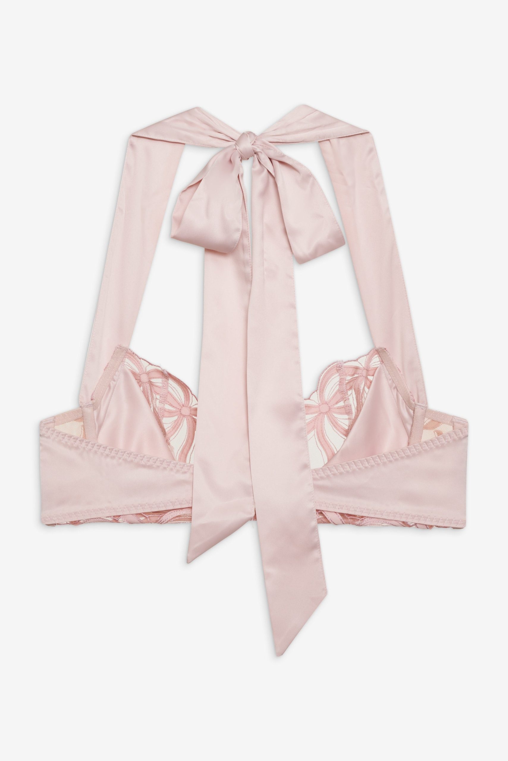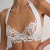 The Hallie white underwire bra cuts a romantic mood. Featuring a satin half-cup lining and double layered satin halter straps, this sexy bra spotlights irresistible bow appliqués and an enamel bow charm above the center-front keyhole. Pair it with the Hallie Thong Panty for a complete lingerie set.