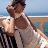 Embrace crisp ’90s minimalism with the Hariette cream tank top—a beaded top with sequins, cut to a scoop neckline and designed for a relaxed, cropped fit. Pair it with the Hariette Blazer and Mini Skirt for a chic bridal suit.