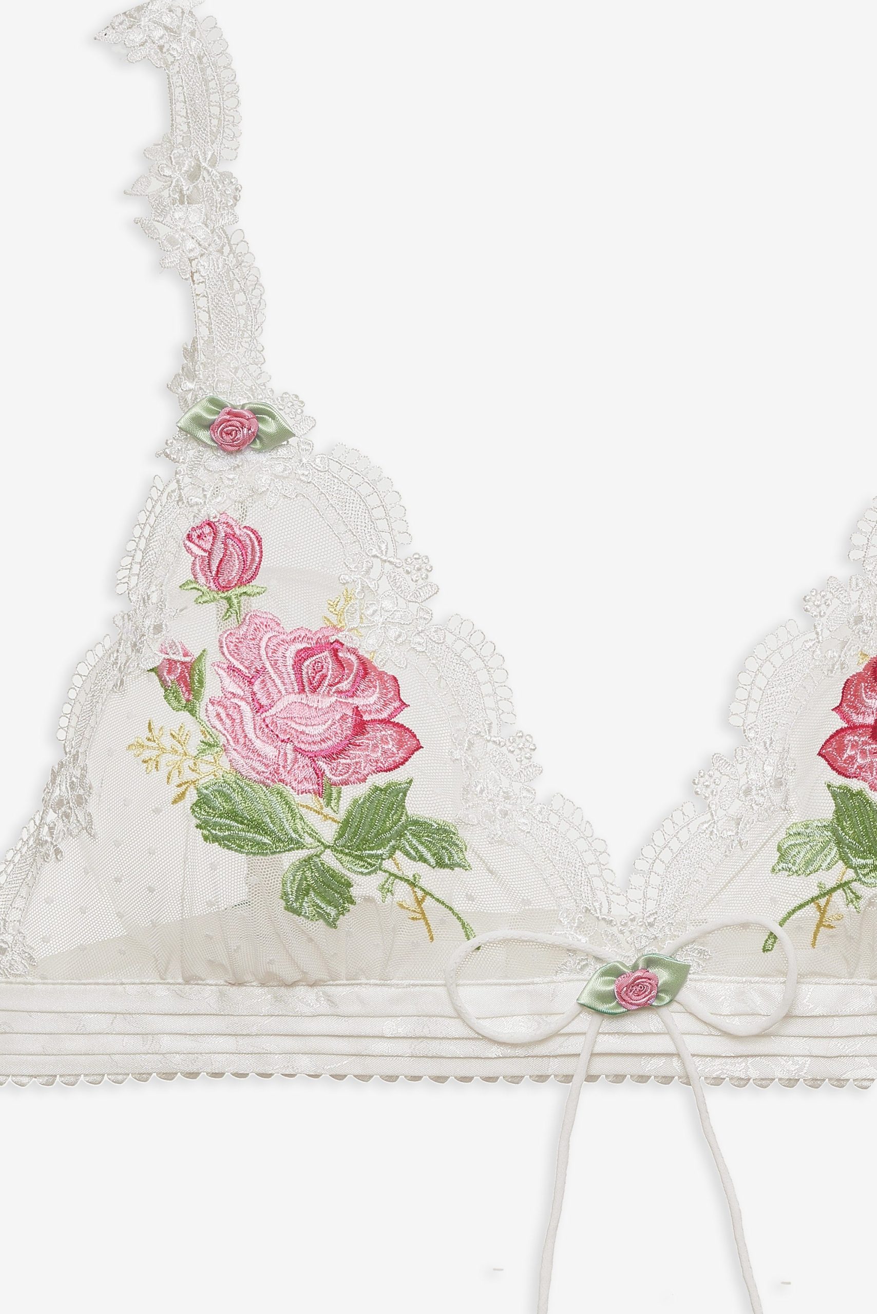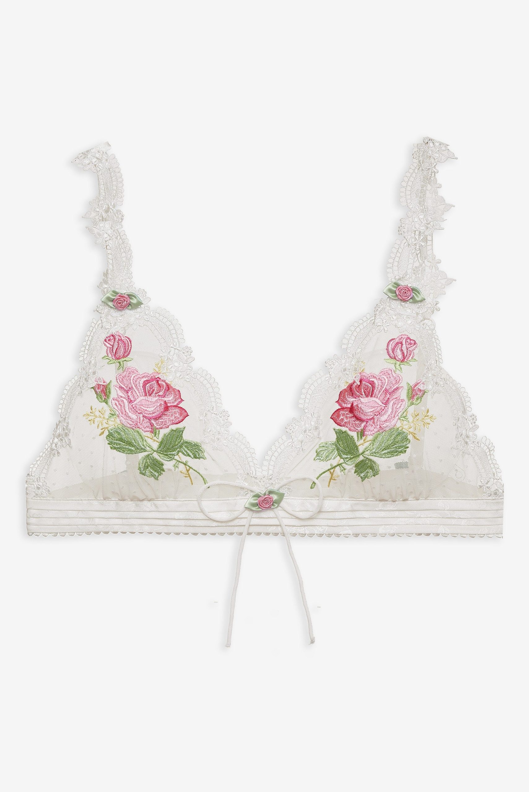 Lose yourself in the romance of the outdoors with the Heirloom Rose floral bralette–a classic triangle bralette crafted in a delicate dotted mesh. Adorned with dainty lace trims and intricate rose appliqués, this white bralette features a wide jacquard pin-tucked waistband, decorative rosettes, and a center-front fixed bow.