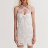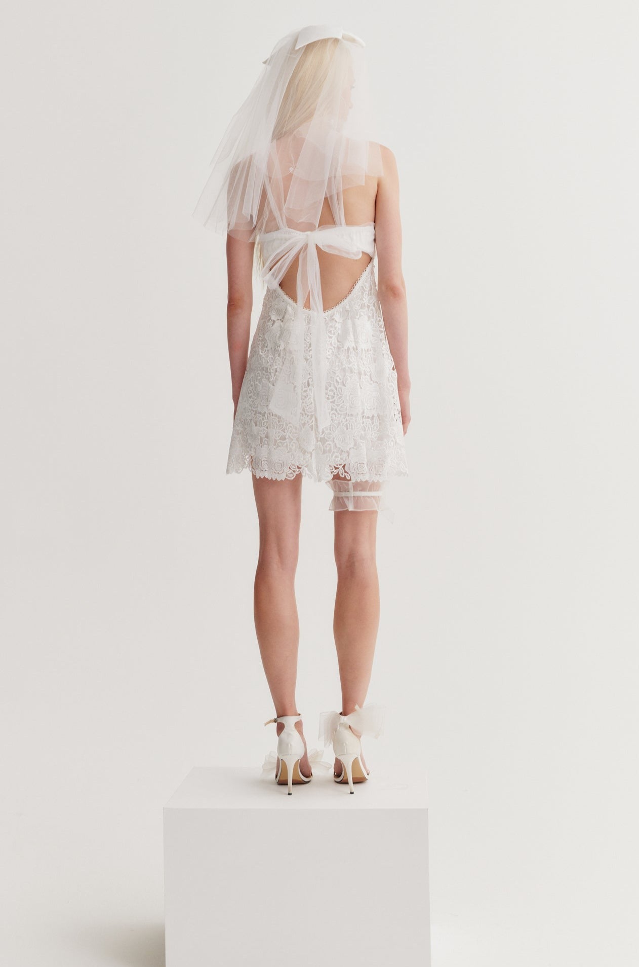 Your moment to shine begins with the Iridessa gown—the perfect bachelorette dress or wedding after party dress. This white lace mini dress features a contrast chiffon tulle halter neck bodice.