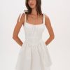 Ecovera poplin mini dress with shirred drawstring at neckline and corset details with taping at waist. Functional ties at shoulders and invisible zipper closure at CB. Fully lined.