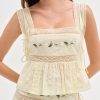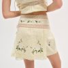 Step into spring with the Jolene embroidered mini skirt–a yellow mini skirt crafted in textured cotton and adorned with intricate floral embroidery, delicate lace trims, and functional skinny tie closure at left waist.