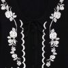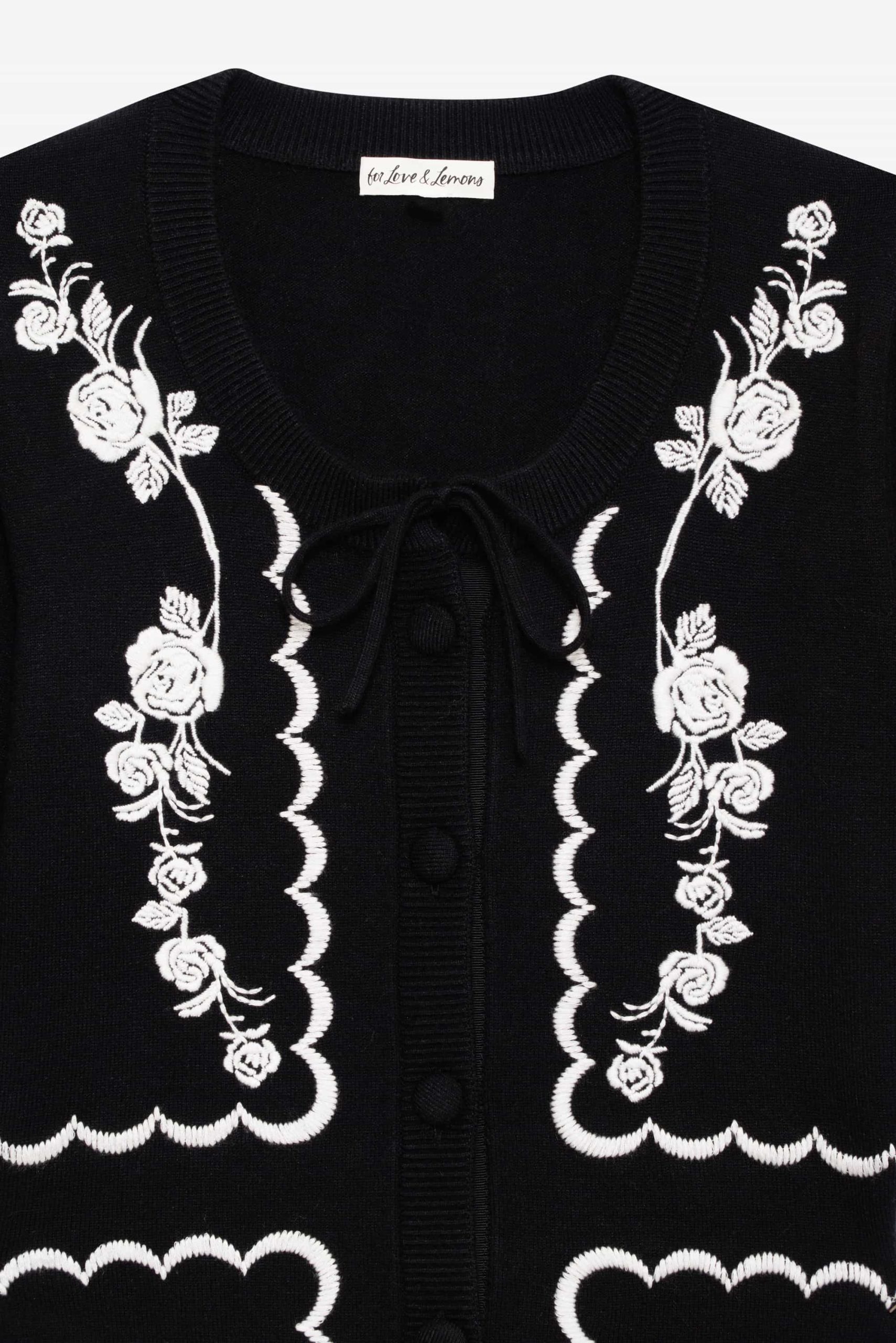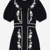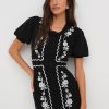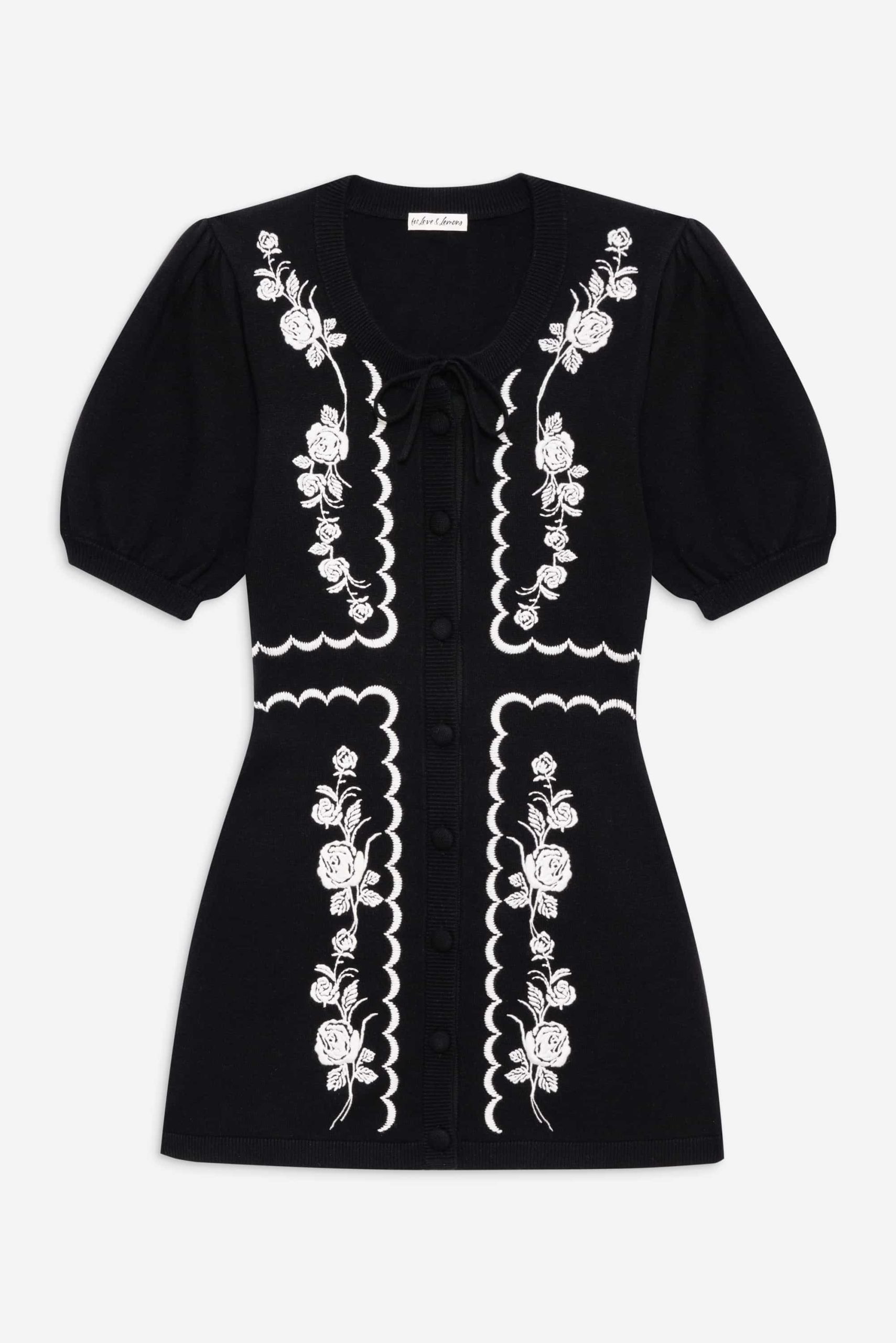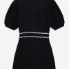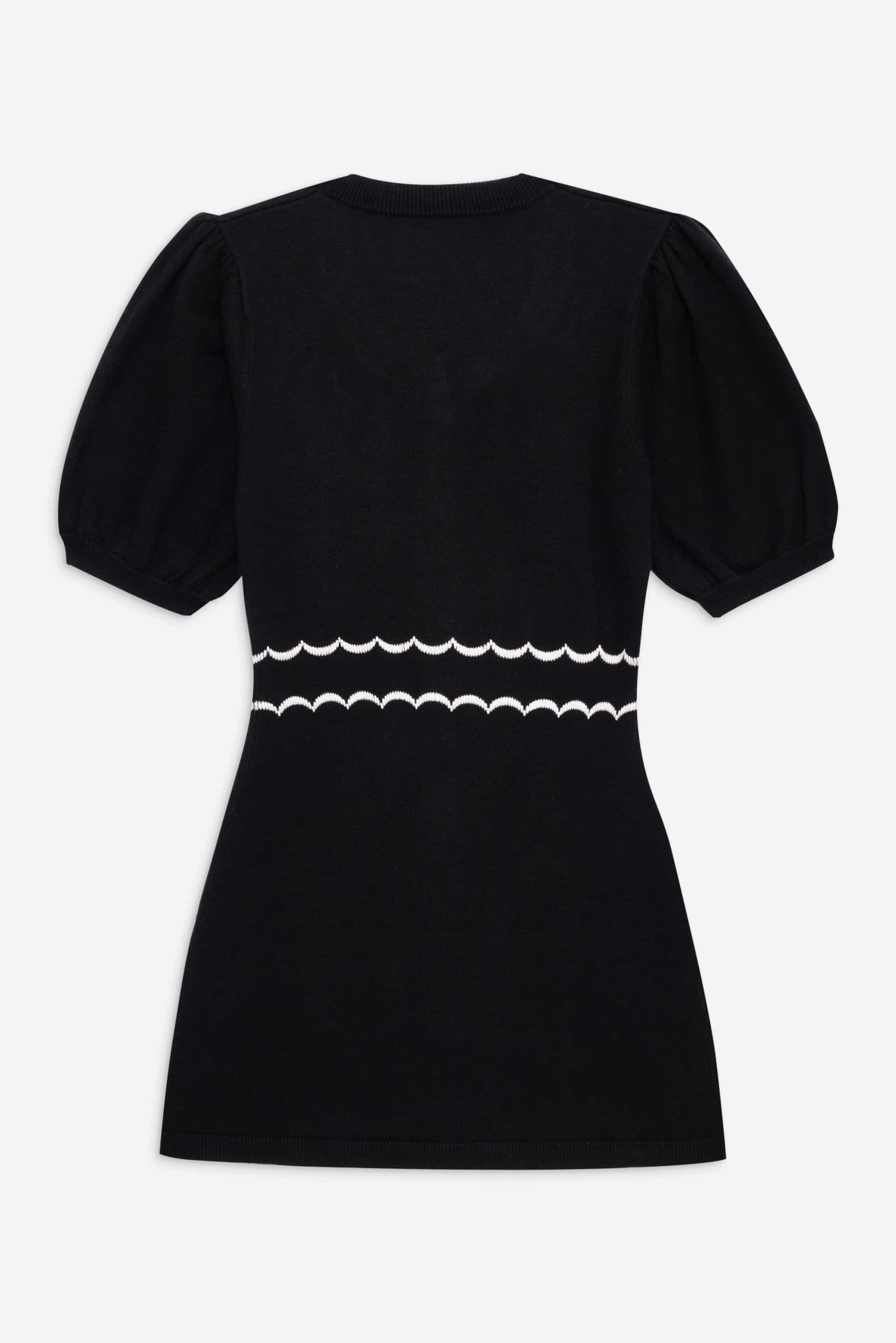 Get cozy in the Josephina black mini dress, featuring whimsical floral appliques. This knit dress spotlights short puff sleeves and classic sweater ribbed trims at the neckline, cuffs, and hem.