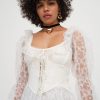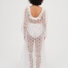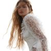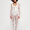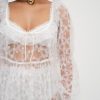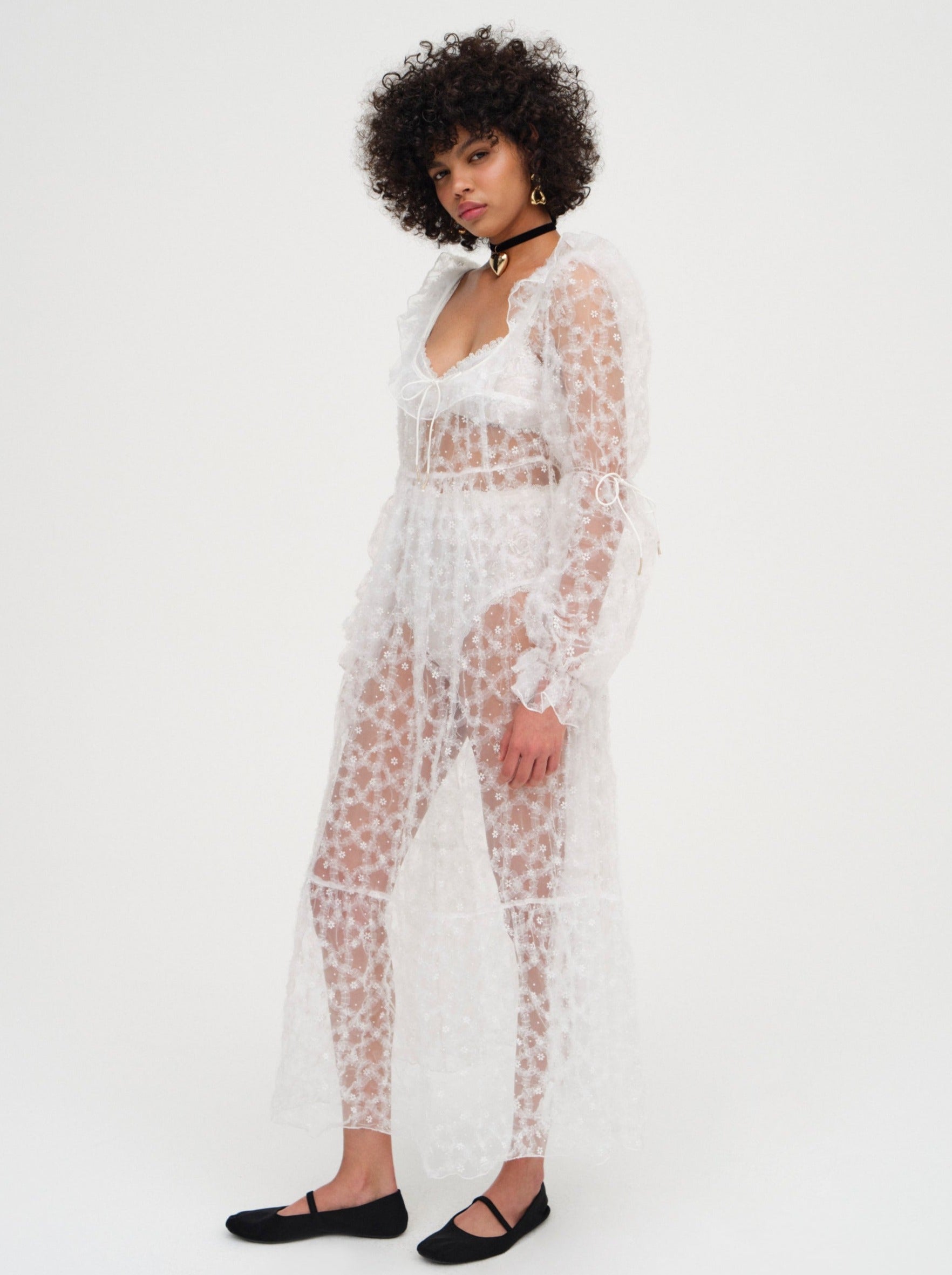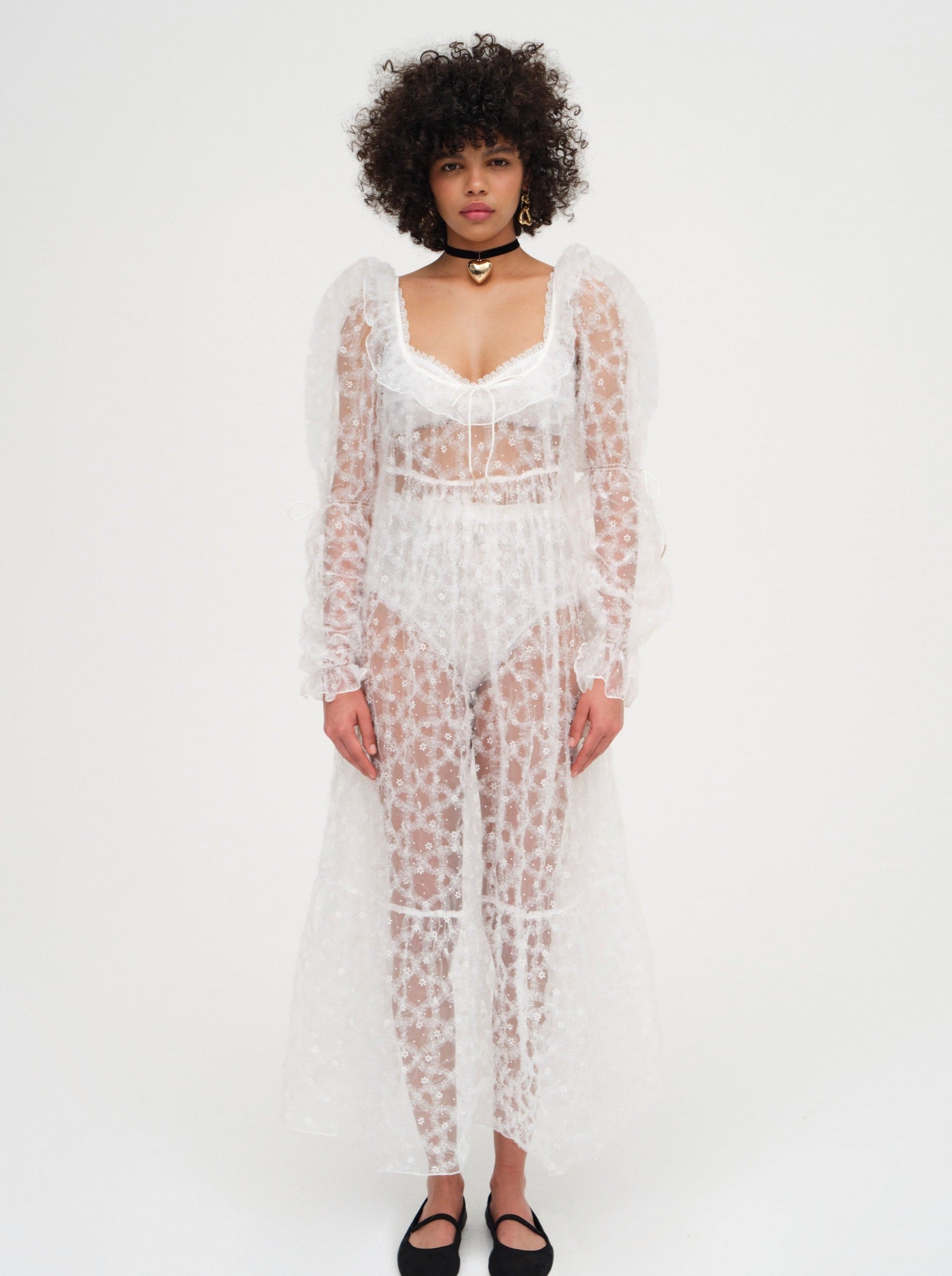 Put on an ethereal display in the Kalea white midi dress, a sheer tulle dress with striking ruffled flocking and elasticated tiered puff sleeves. Bring on the drama.